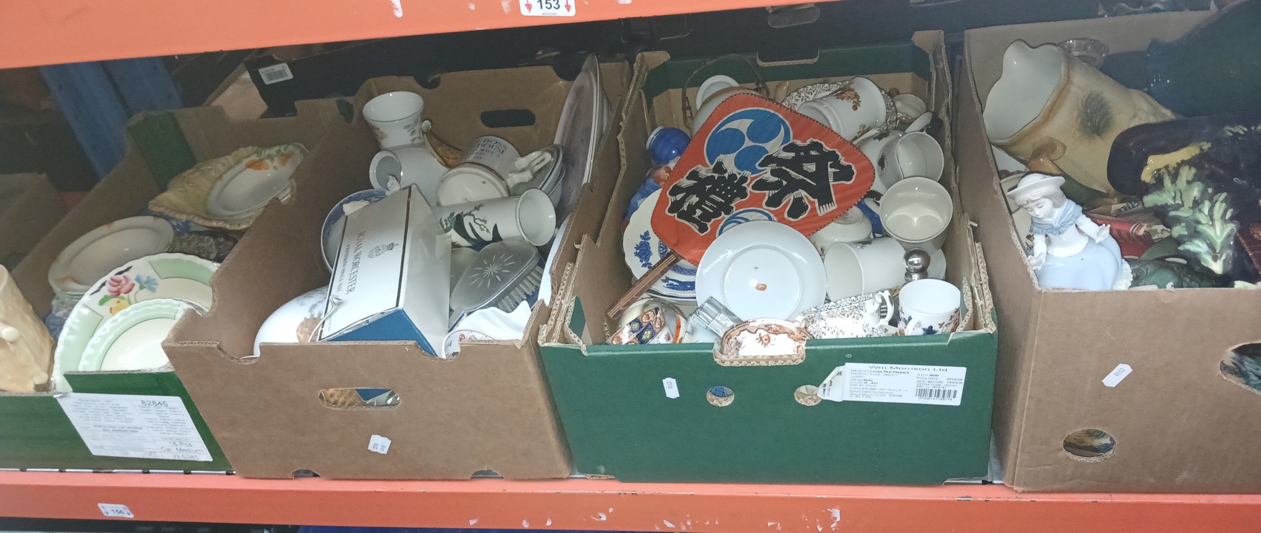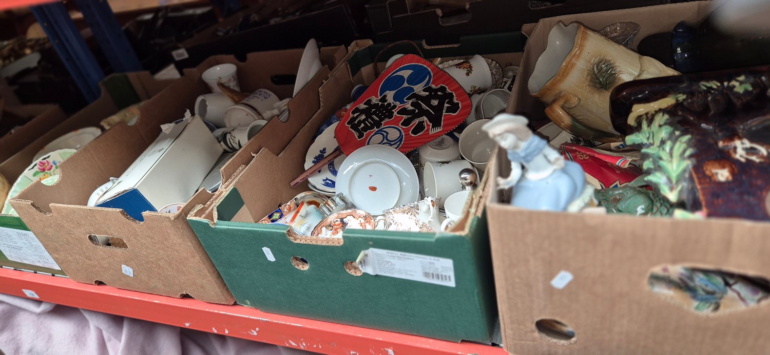 4 boxes of mixed ceramics including a Nao figure, large blue and white platter Doulton Westwood table wares etc
