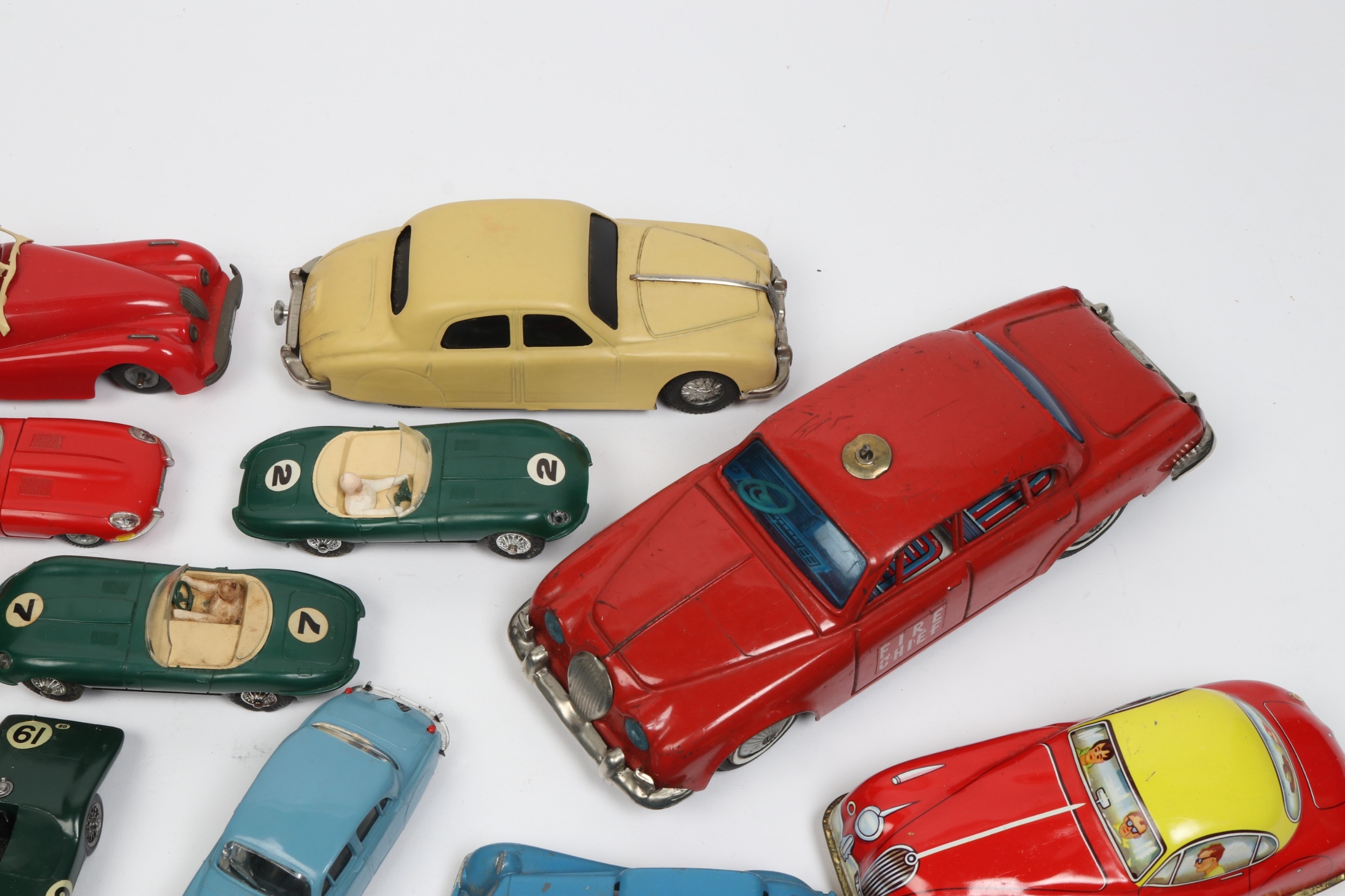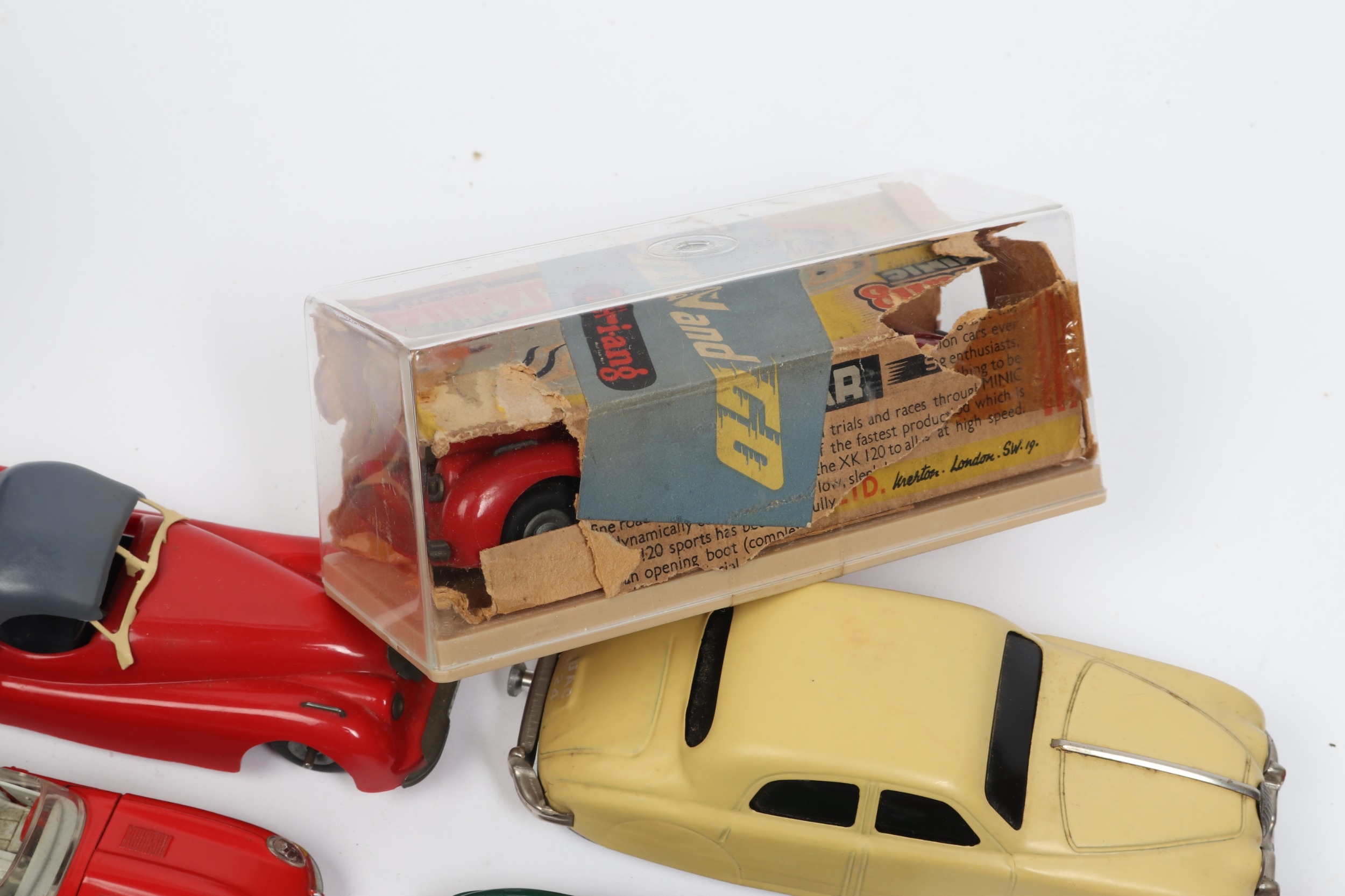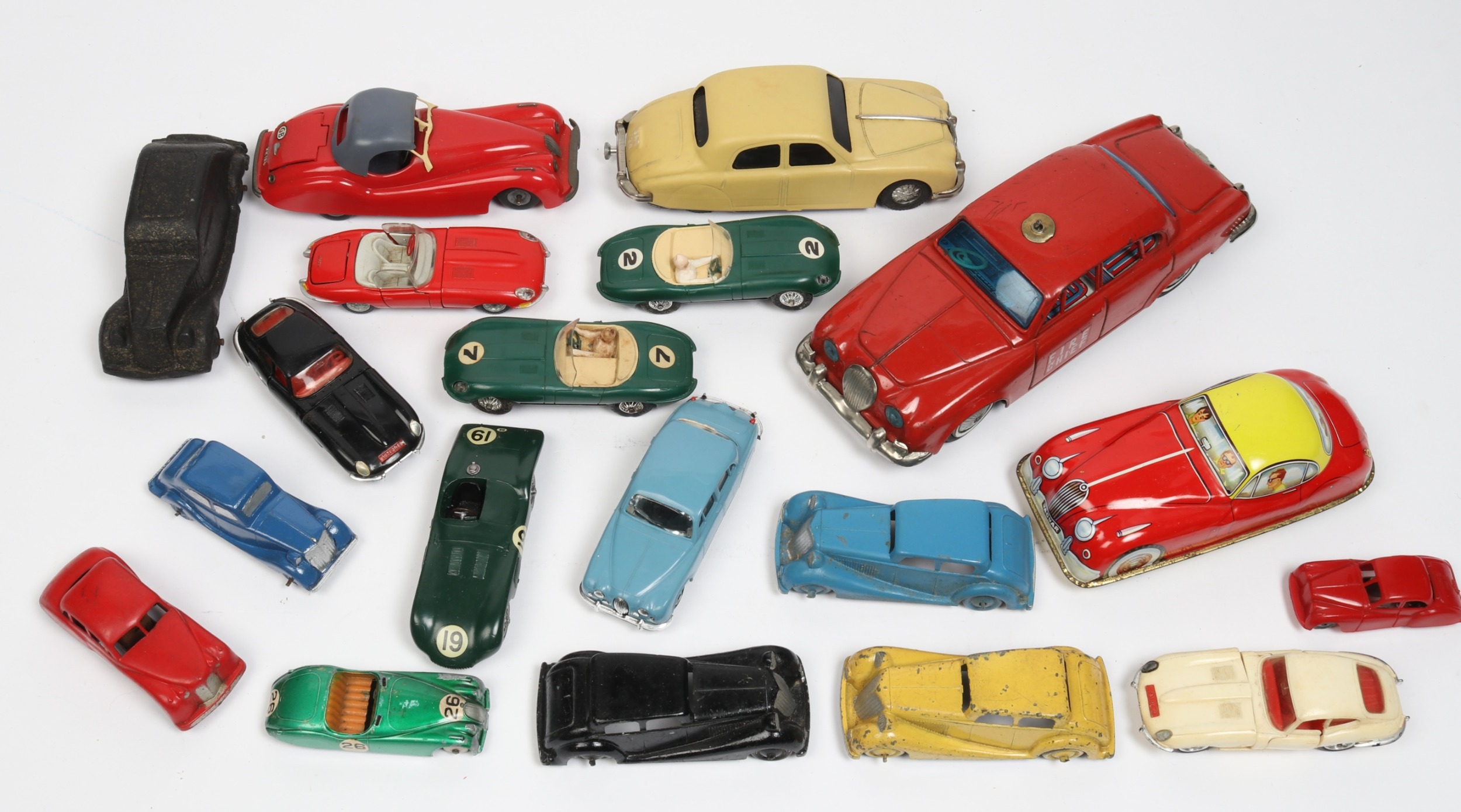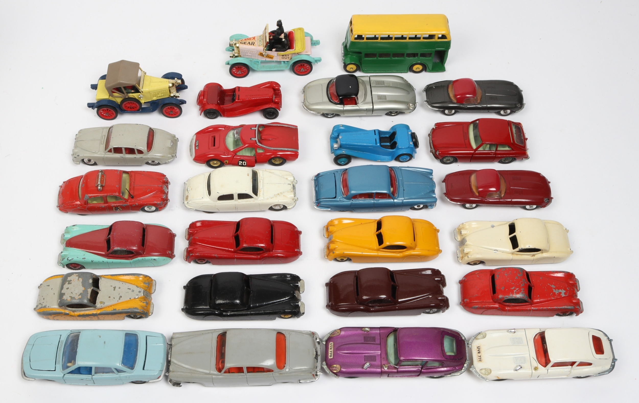 50+ Jaguar models and others. To include STARTEX Jaguar 2.4, 2x Minic, Norev MK10, E-type, 21.400, Tekno, Kirk, 8x DINKY Jaguar XK in different colour schemes, Dino Ferrari, Jaguar 3.4 Ltr in grey, E-Type 2 + 2 in white with gold base and another in purple with gold base, POLITOYS E-Type, CORGI E-Type in gunmetal with red roof and one in Maroon, CORGI 2.4ltr, Fire Chief Car, MG BGT, also includes other items. Conditions FC - VG £80-120