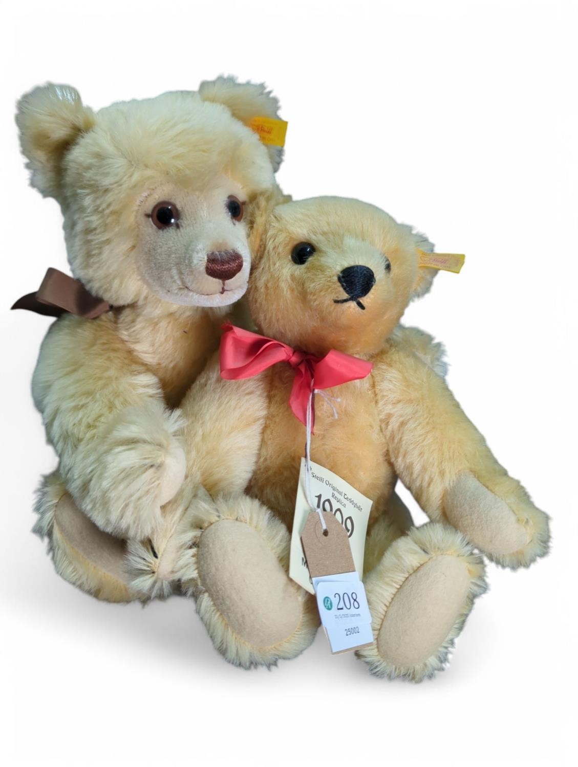 Two Steiff teddy bears, both fully jointed with tilt and turn growlers inc. Original teddy bear replica 1909, with gold ear button and yellow tag 406225, ht. 33cm approx.