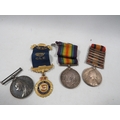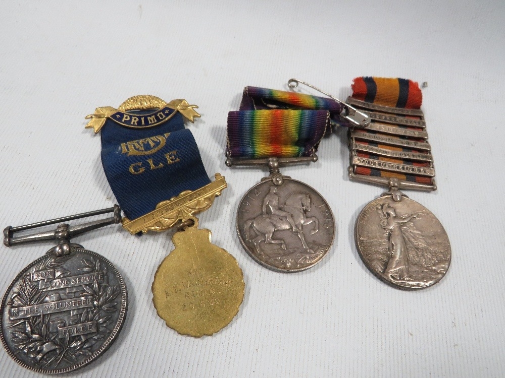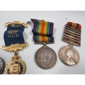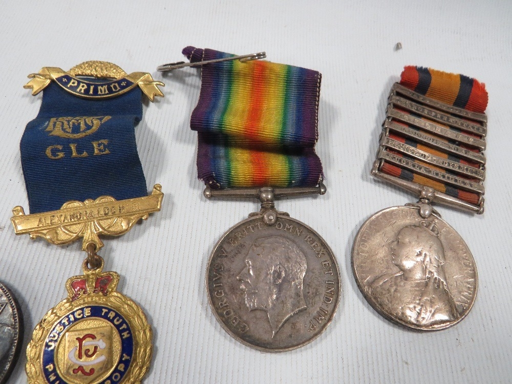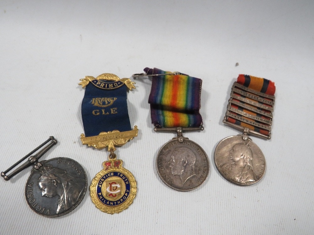 Queens South Africa medal, 6 bars - Cape Colony, Orange Free Stat, Belfast, Laings Nek, relief of Ladysmith & Tugela HEIGHTS (name partly worn -reads 036 SGT J. Brown Manch R, WW1 BWM - 48746 PTE. F. Counsell Lan Fus, A QV volunteer force LS medal engraved CR sergt. J Morley $th VBCR and an RAOB Medal (4)