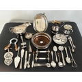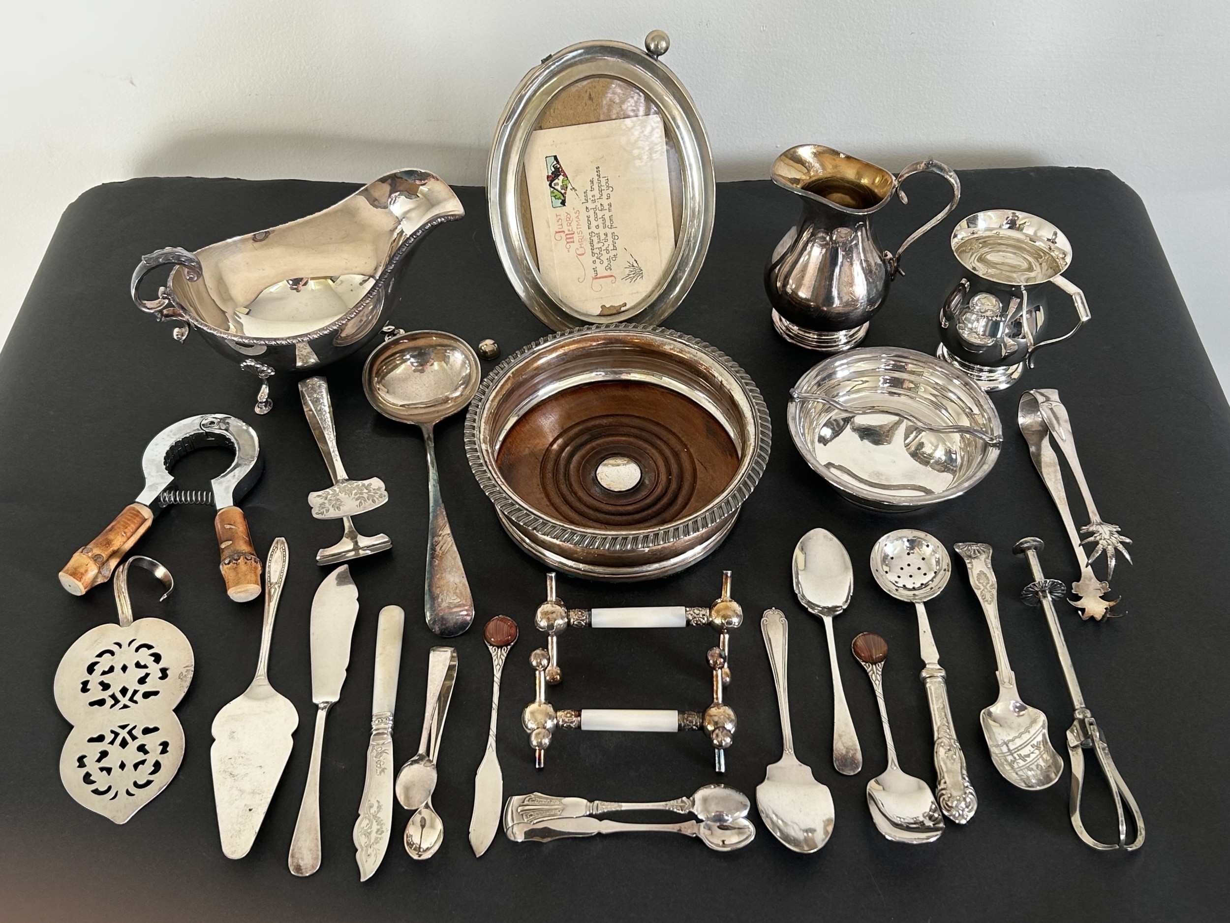 A collection of vintage silver plated items to include a bottle holder, photo frame (as found), jugs, tongs, knife rests etc