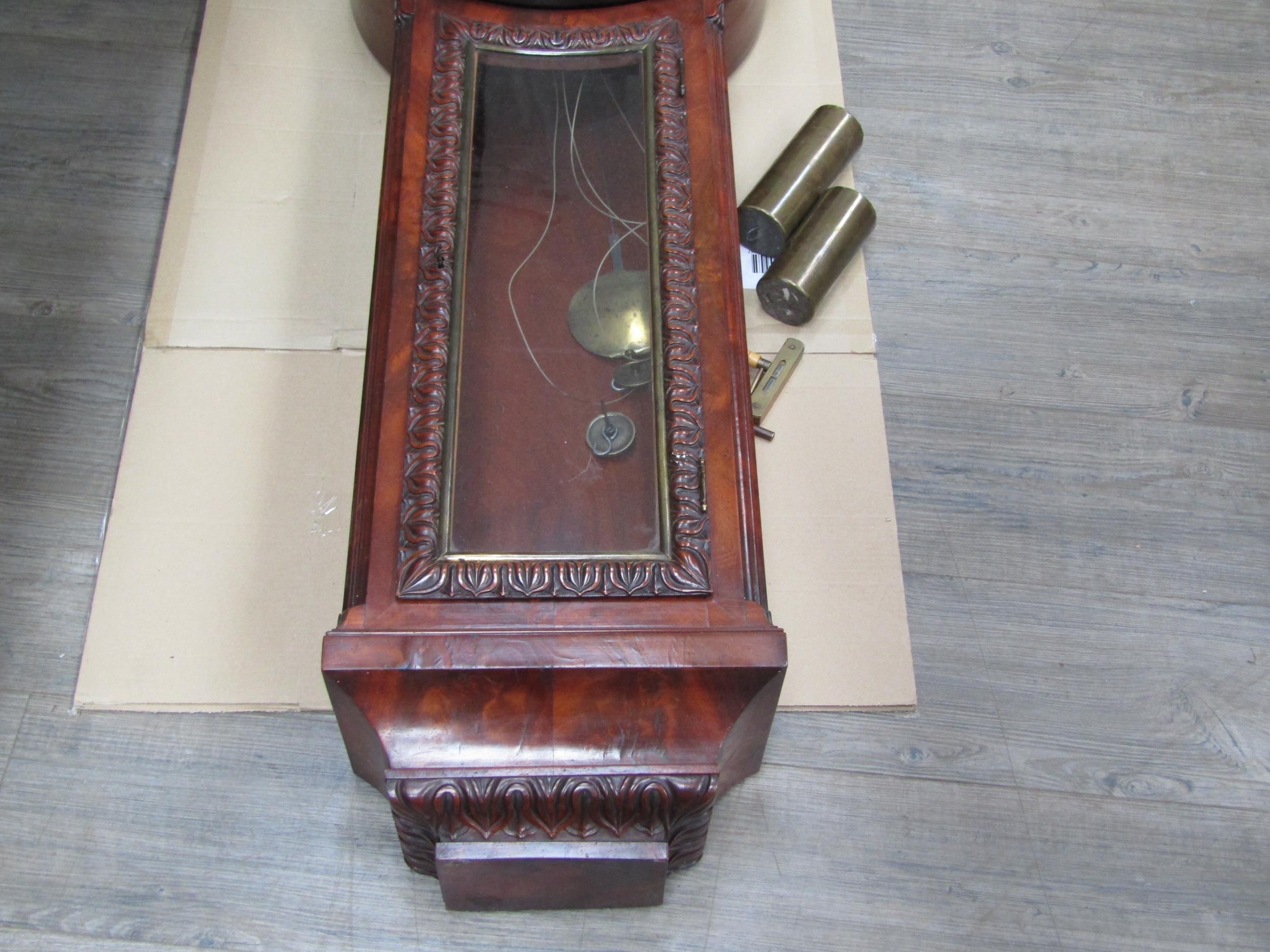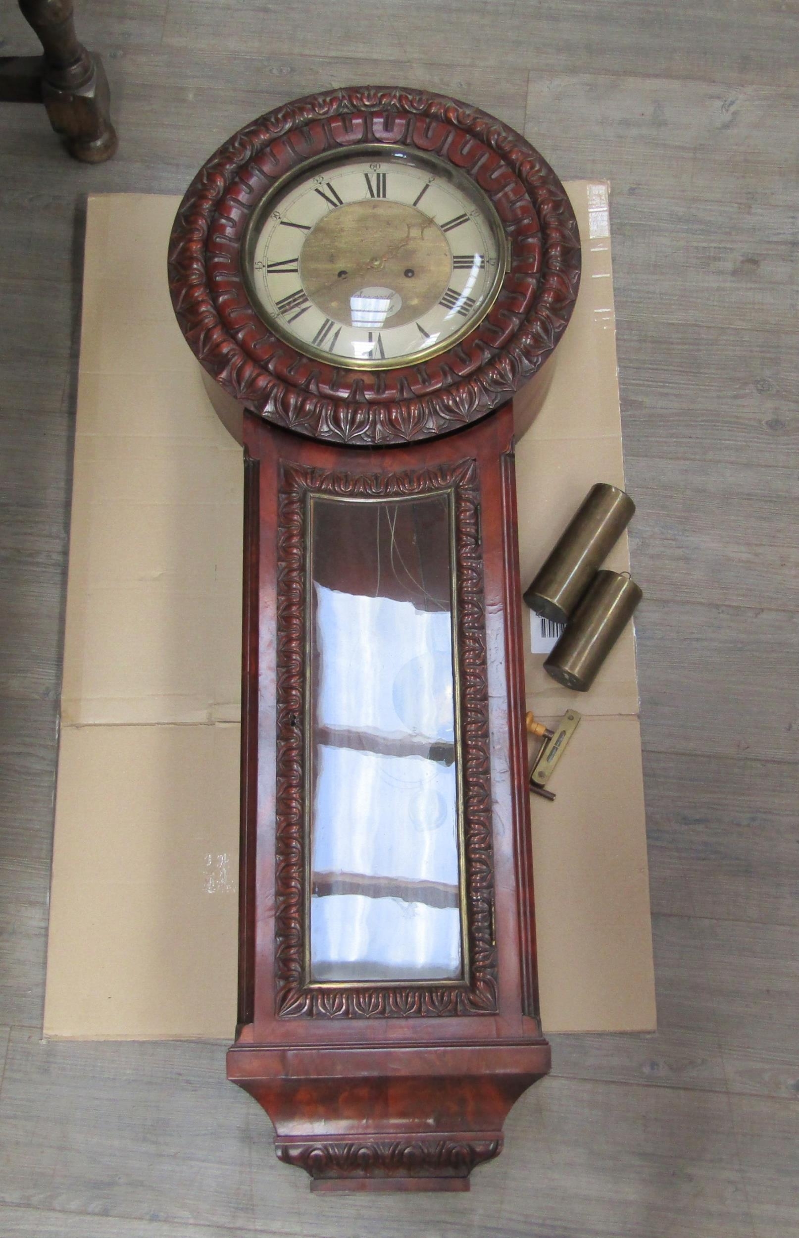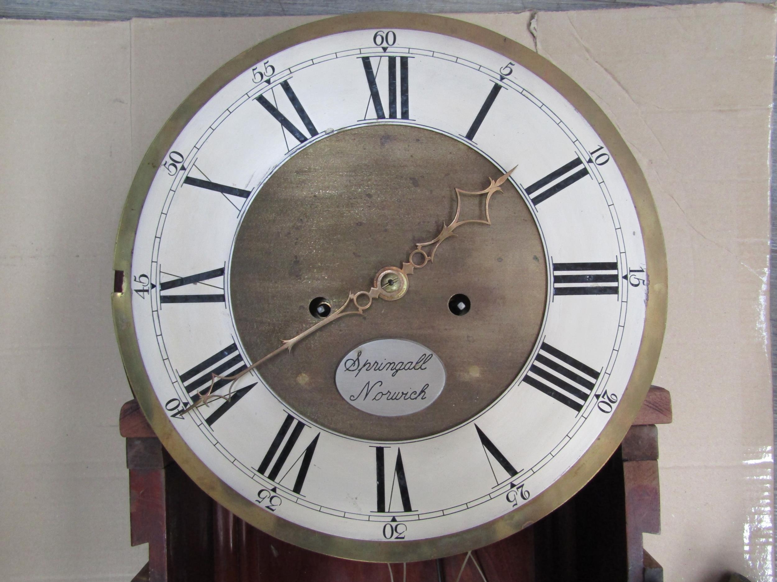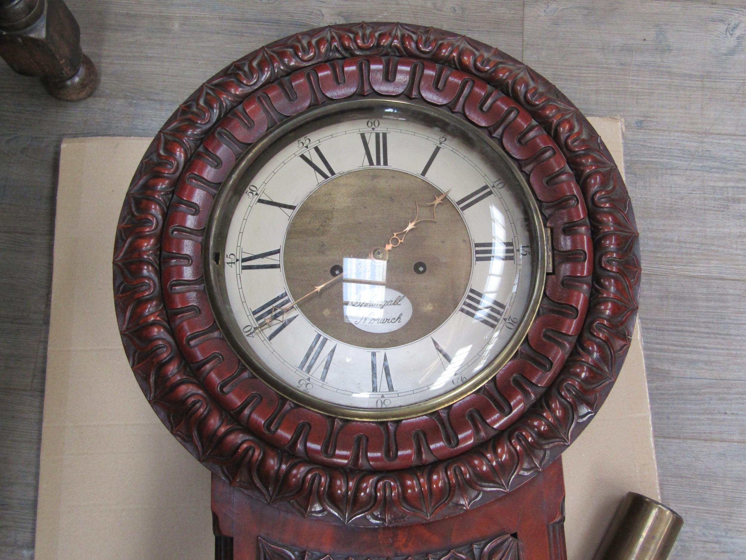 An early 19th Century Tavern clock by Springall Norwich, carved flame mahogany case, Roman numerated and minute marks, 140cm tall, 30cm diameter dial