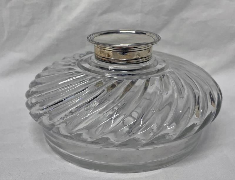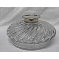 SILVER TOPPED CUT GLASS INKWELL WITH SWIRLED DECORATION, LONDON 1891 - 14CM DIAMETER