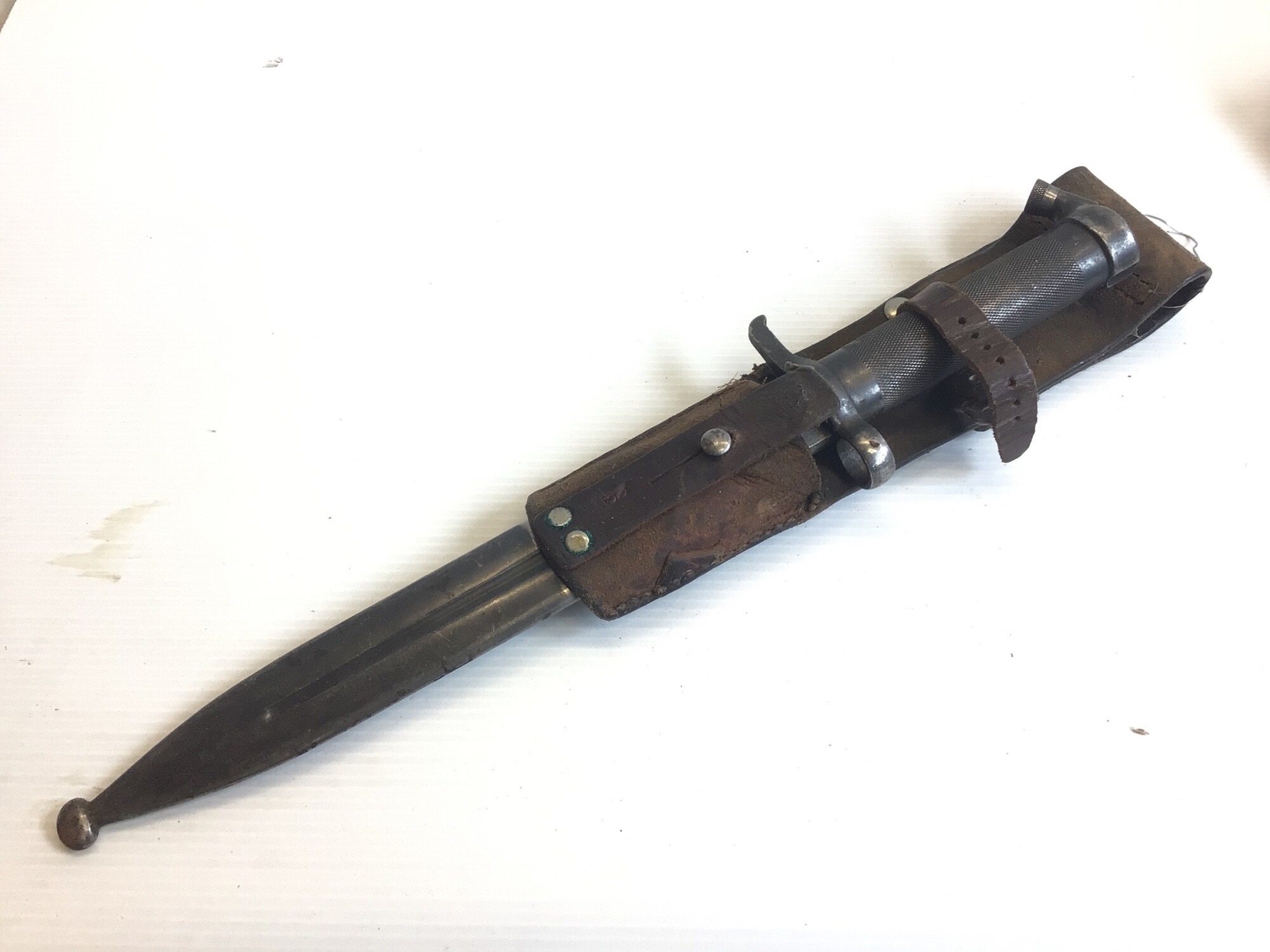 A Swedish 1890 bayonet with an engine turned grip and leather frog