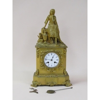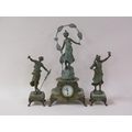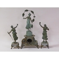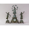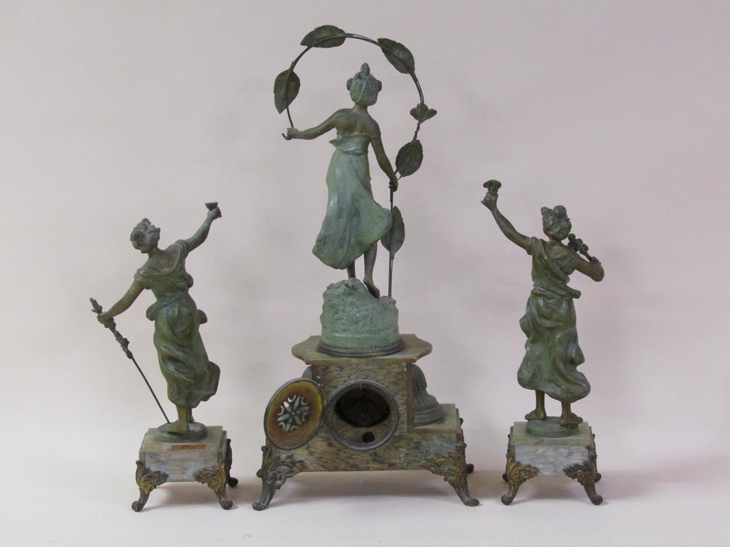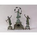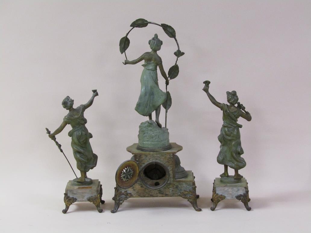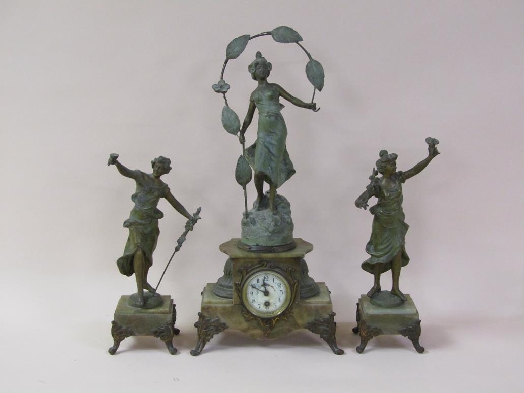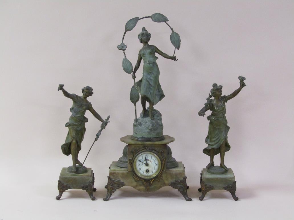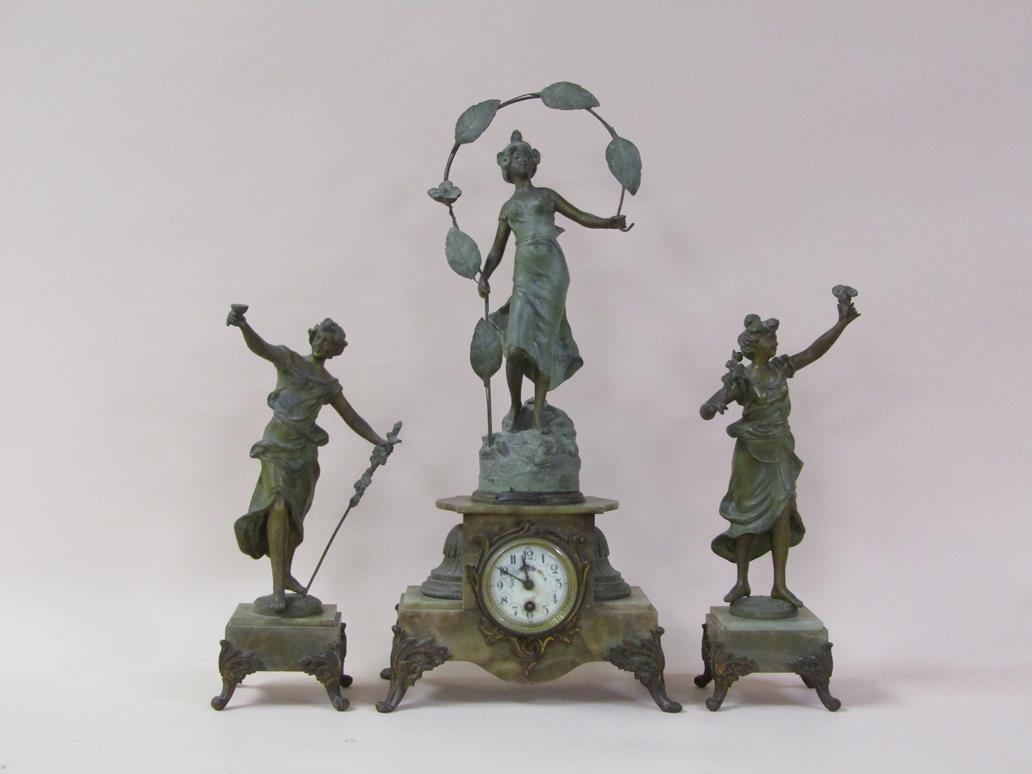 A late 19c French garniture de cheminee comprising a central clock element surmounted by a female figure entitled 'Rose des Bois' and two flanking female attendants. The figures and decorative mounts and fret are of gilt spelter and the bases and clock case body are of green onyx. The 9cm diam white enamel dial has arabic numerals with a central floral swag and the single train movement has a Tic-Tac escapement. The clock element 61cm h ad the flanking figures approx 41cm h.