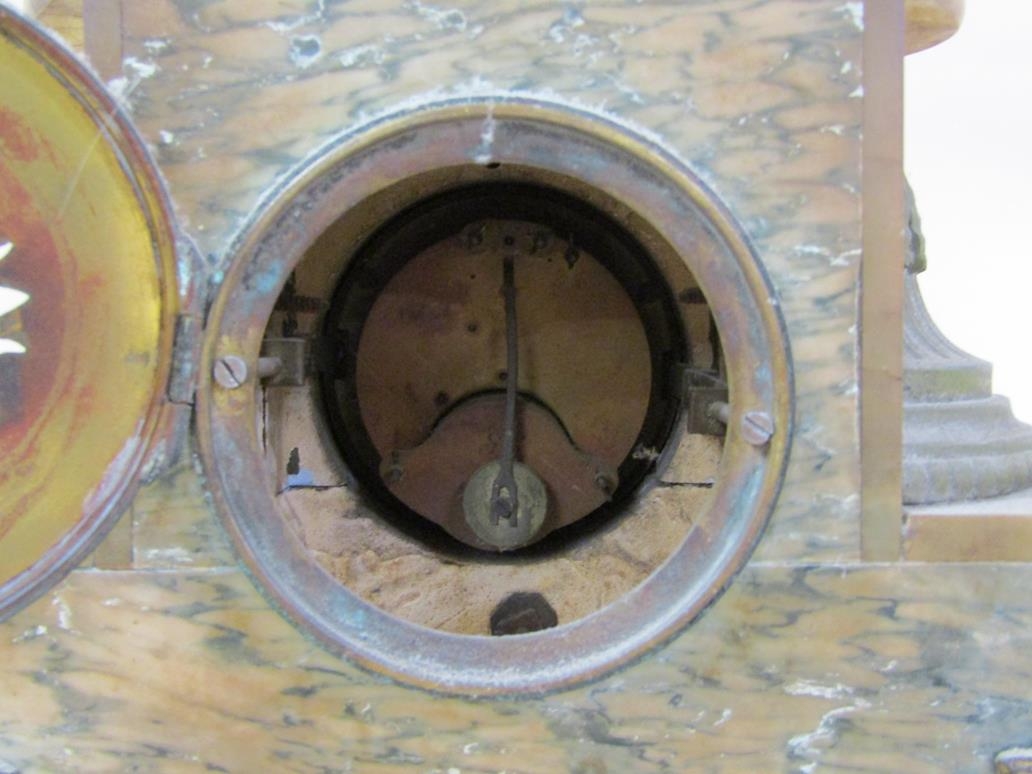 the garniture is materially undamaged but the gilding to the spelter is very tarnished and the onyx needs cleaning. the clock dial and glass are undamaged and the movement seems compelete but all require cleaning.