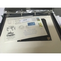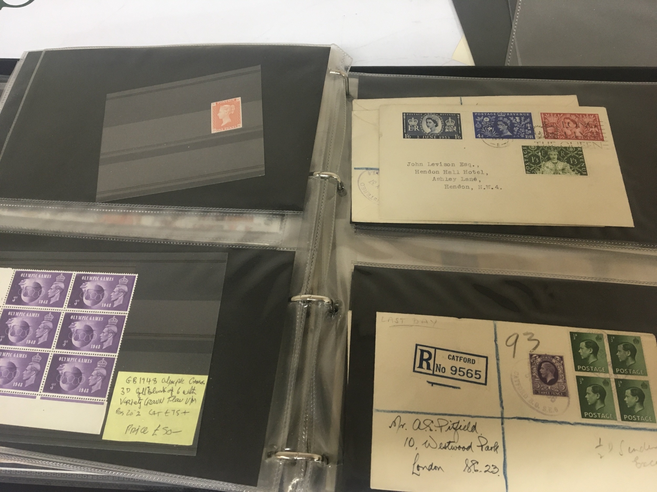 An album of stamps and first day covers including some signed covers unused blocks of stamps British Empire World Peace a block of remembrance stamps 1948 Olympics and others.
