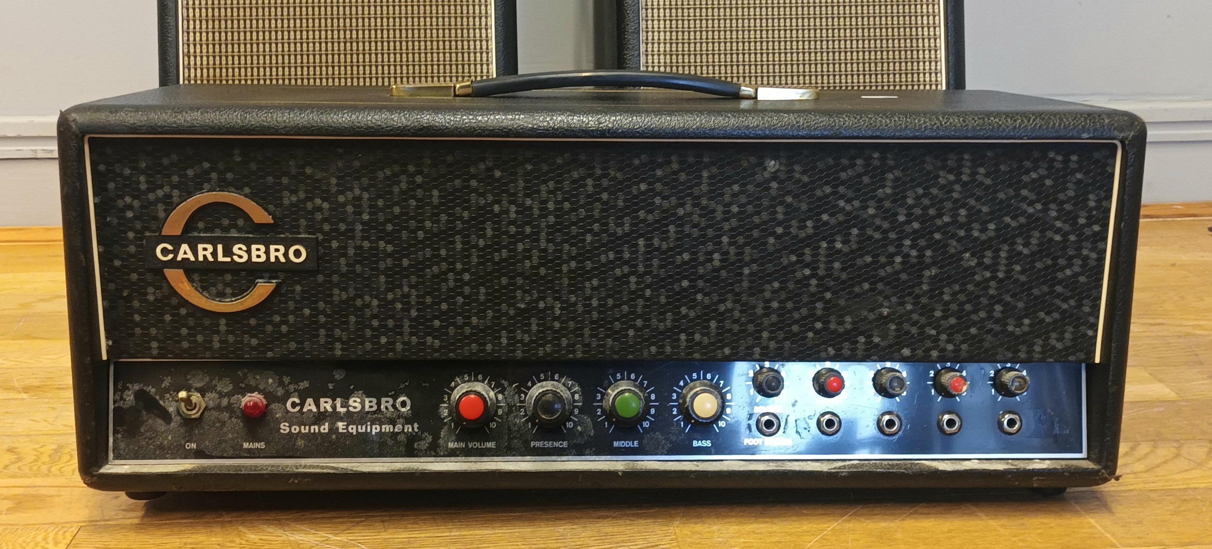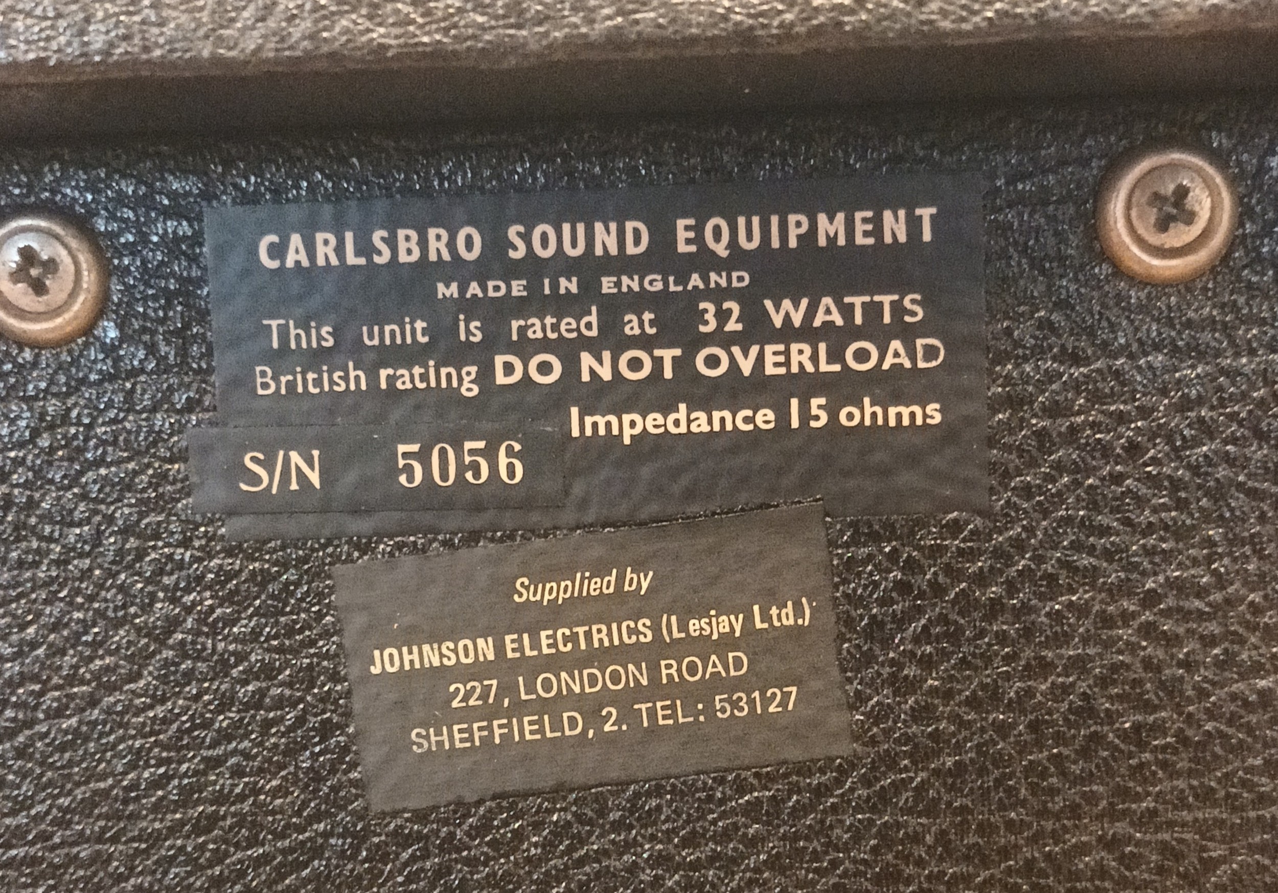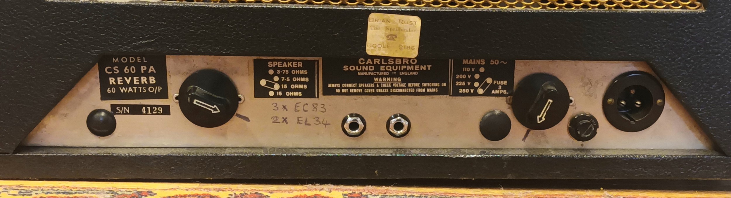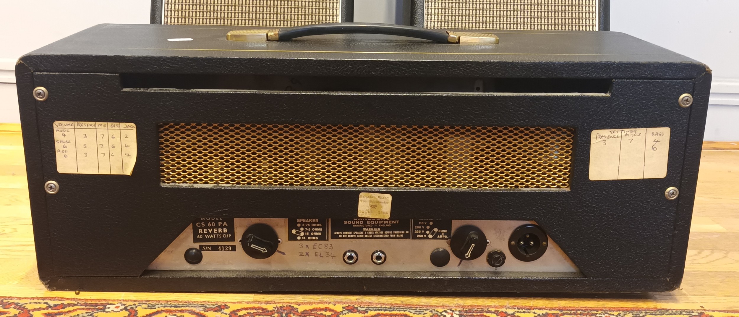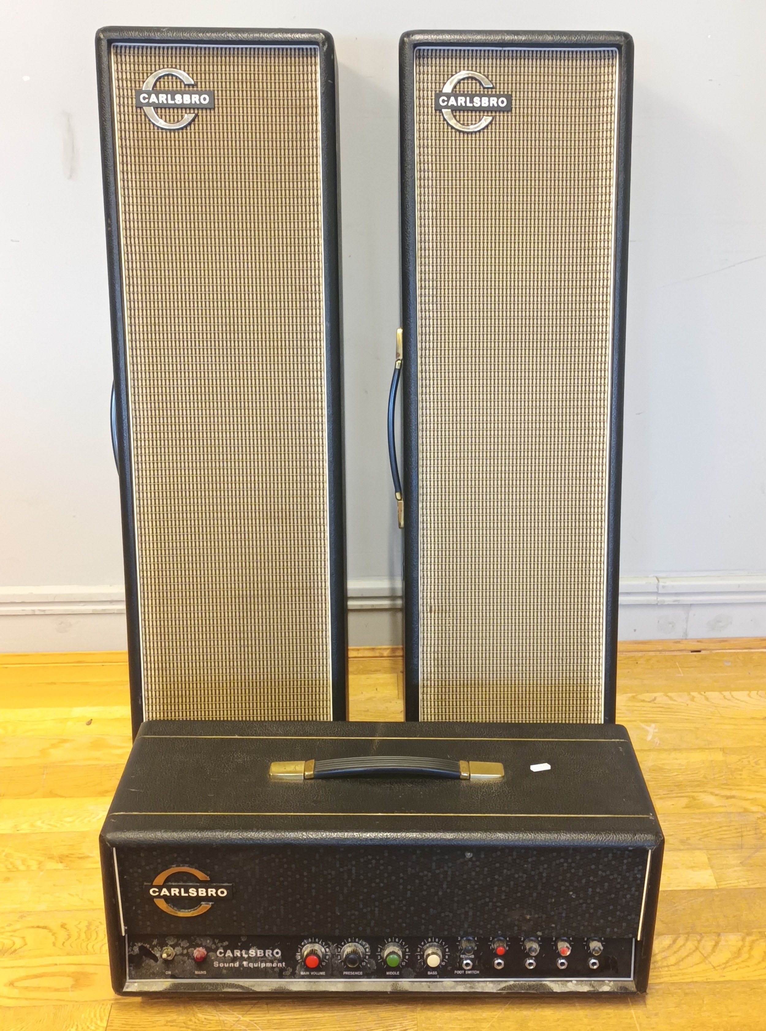 A Carlsbro Sound Equipment guitar amplifier, model CS 60 PA, together with two Carlsbro upright speakers, serial No 5054 and 5056 (3)