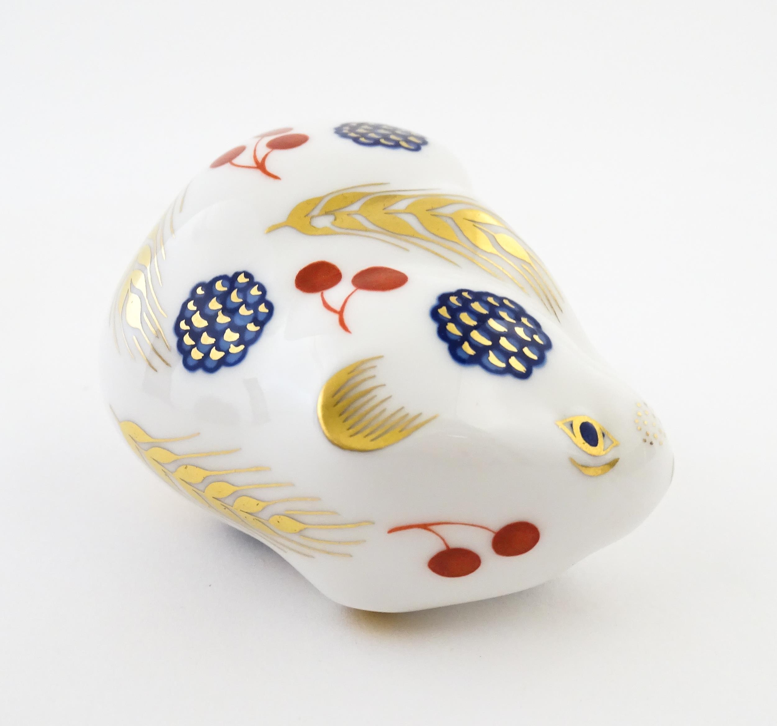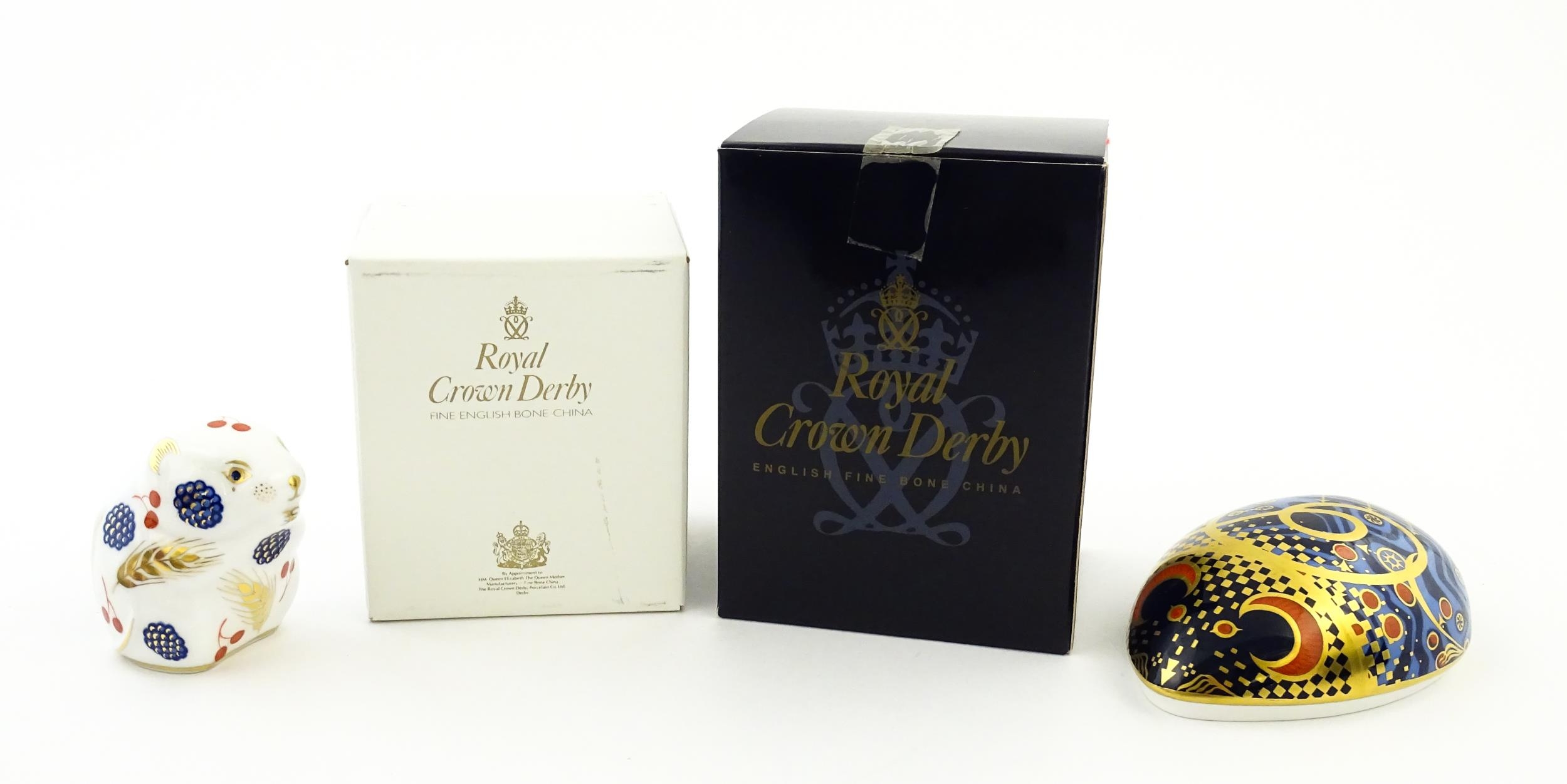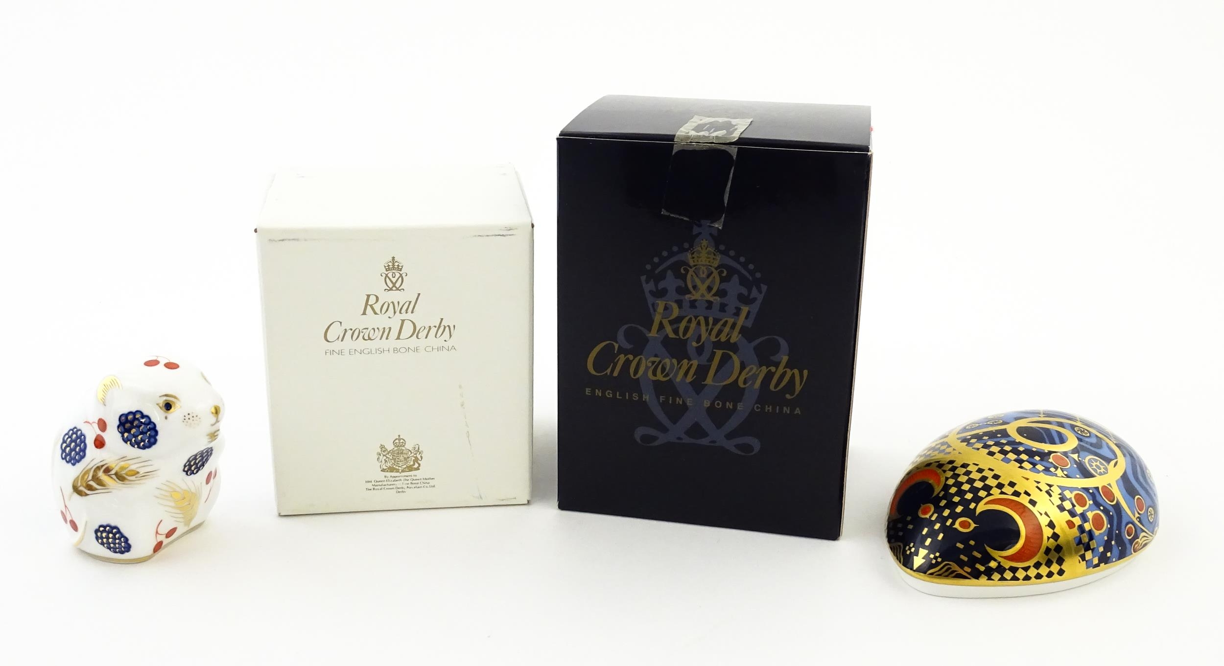 Two Royal Crown Derby paperweights modelled as Computer Mouse, and Dormouse. Both boxed. Largest approx. 4 1/4" long (2)