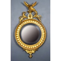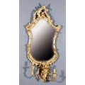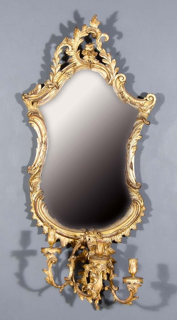 A 19th Century Gilt Framed Girandole of Rococo Design, the cartouche-shaped frame moulded and carved with scroll and floral cresting, inset with plain mirror plate and with three scroll branches on conforming apron, 21ins wide x 47ins high
