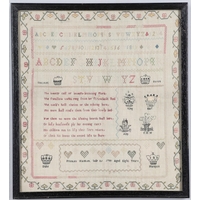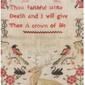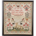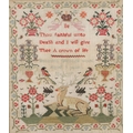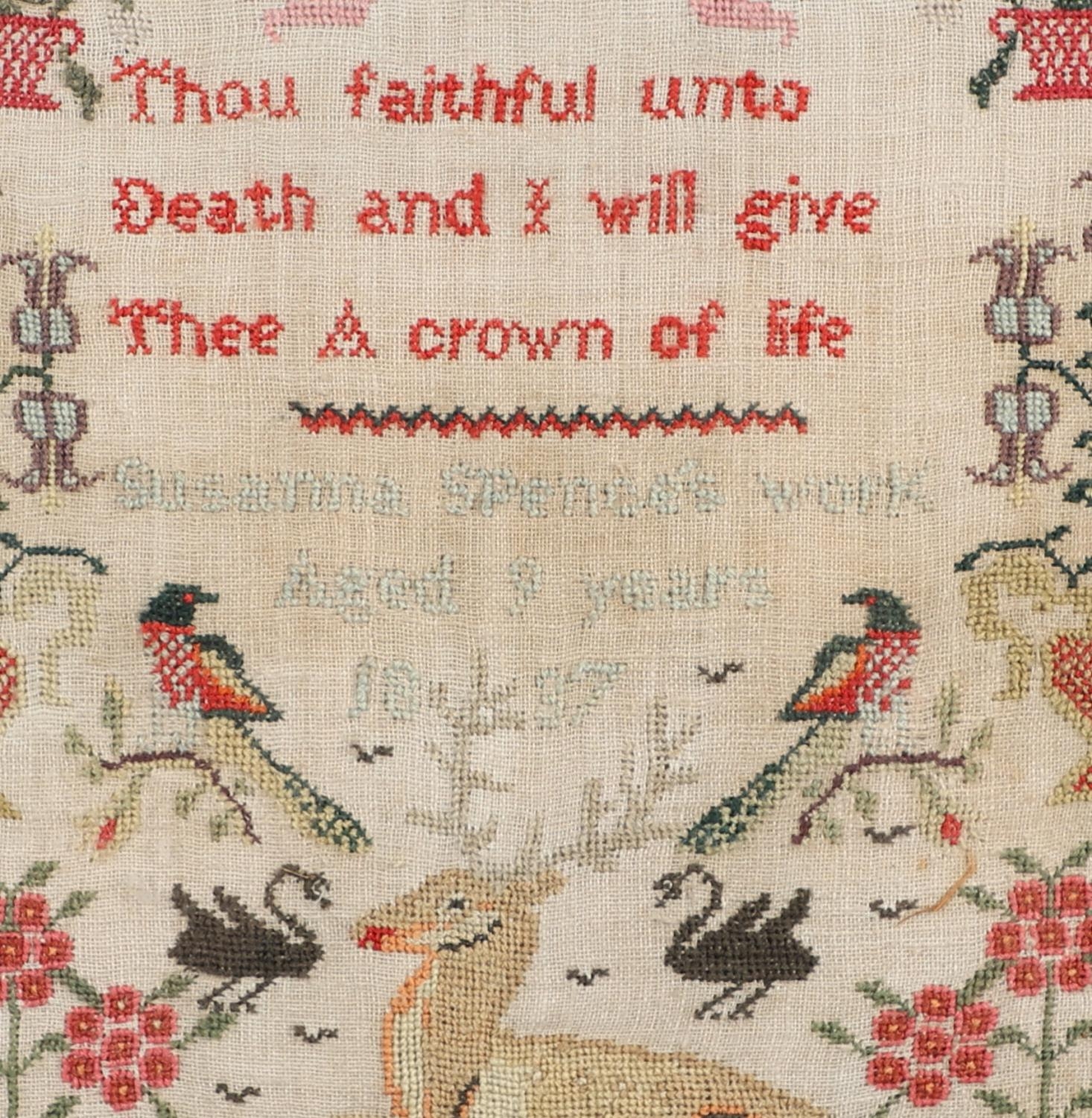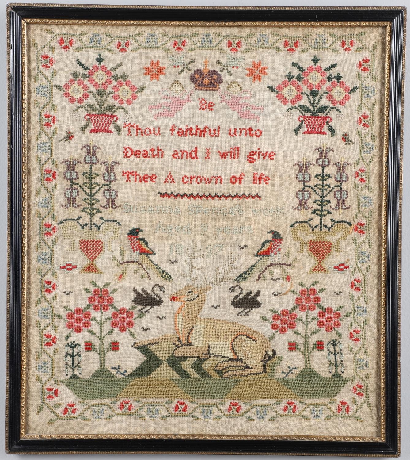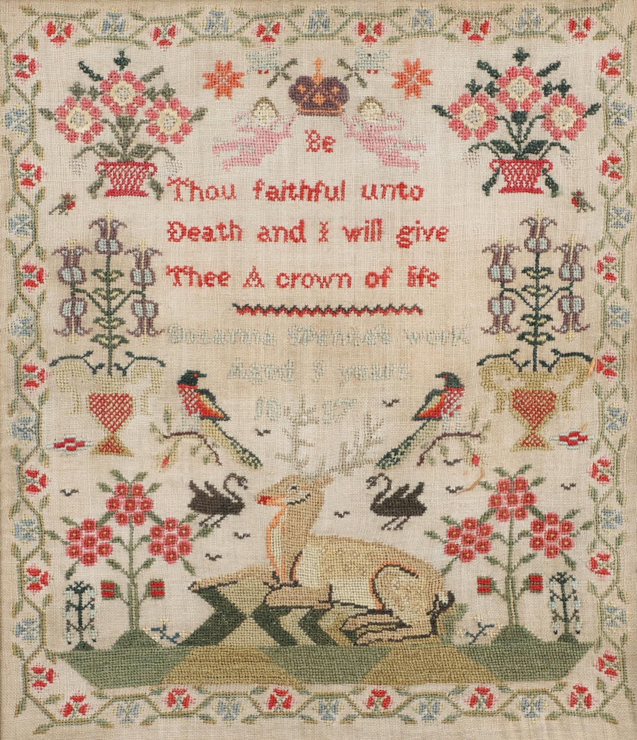 A 19TH CENTURY PICTORIAL NEEDLEWORK SAMPLER. profusely worked in different colours, illustrating a central image of a stag and magpies, the motto 'Thou Faithful unto Death and I will give Thee a crown of life', framed by planters of flowers, by Susanna Spencer Aged 9 Years 1837, overall size 48cm x 43cm.