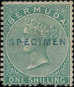 1/- Green handstamped "SPECIMEN" type D5 in blue, horizontal crease and fault at foot, small part gum, still a very rare stamp, from the De La Rue archives. Photo on Page 18.