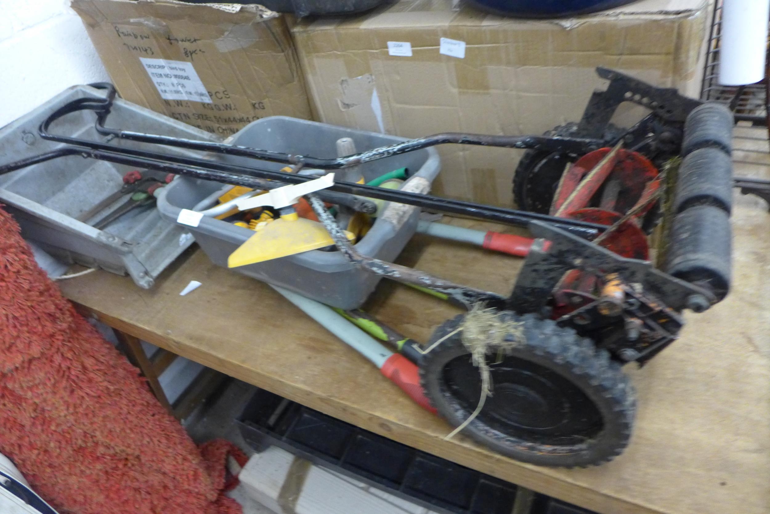 Qty. of gardening tools inc. various garden sprayers, buckets, shears, Qualcast electric lawnmower