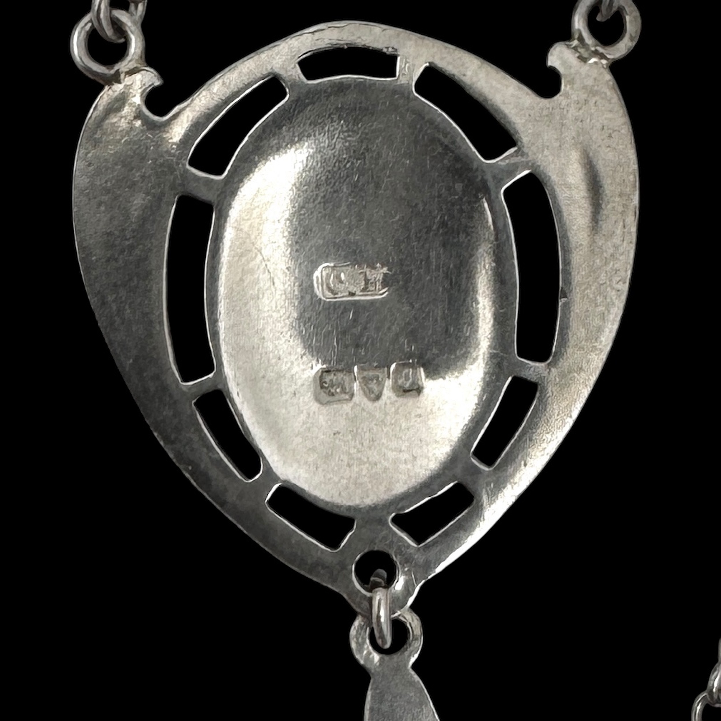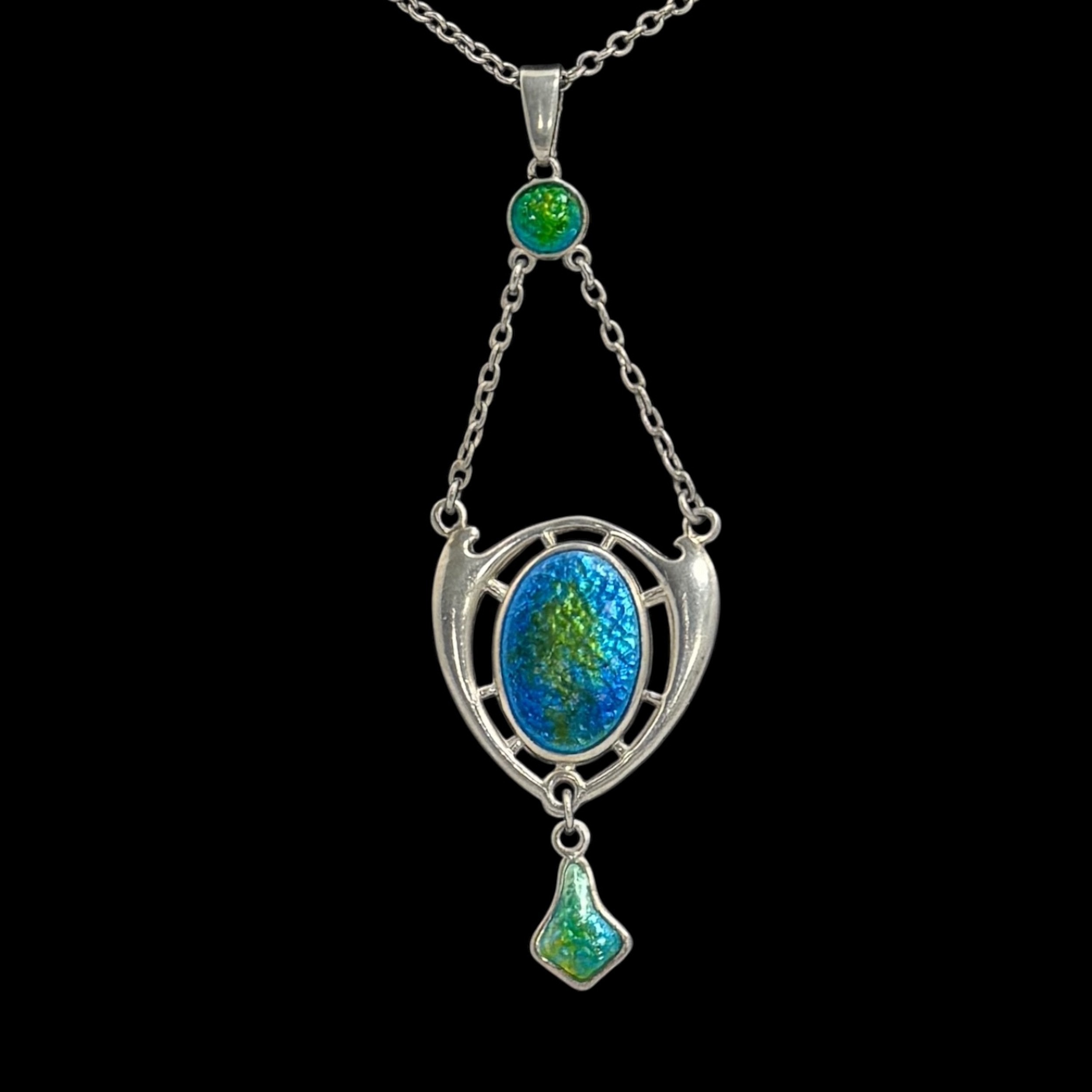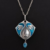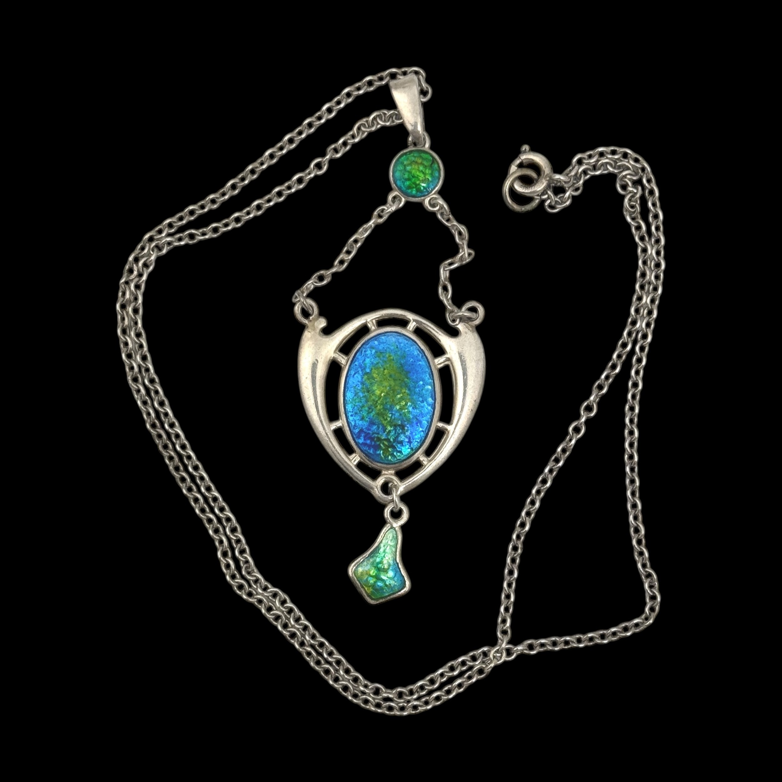 A Charles Horner Art Nouveau sterling silver and enamel pendant necklace, decorated with blue and green enamel button below the bail supporting two chains and shield-shaped pendant, with 'CH' mark and Chester hallmarks for 1906, 42cm total chain length, pendant drop 7cm long, 9.8g total weight. (LDC15123)