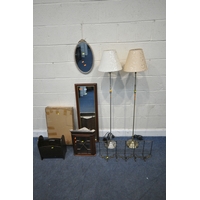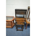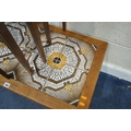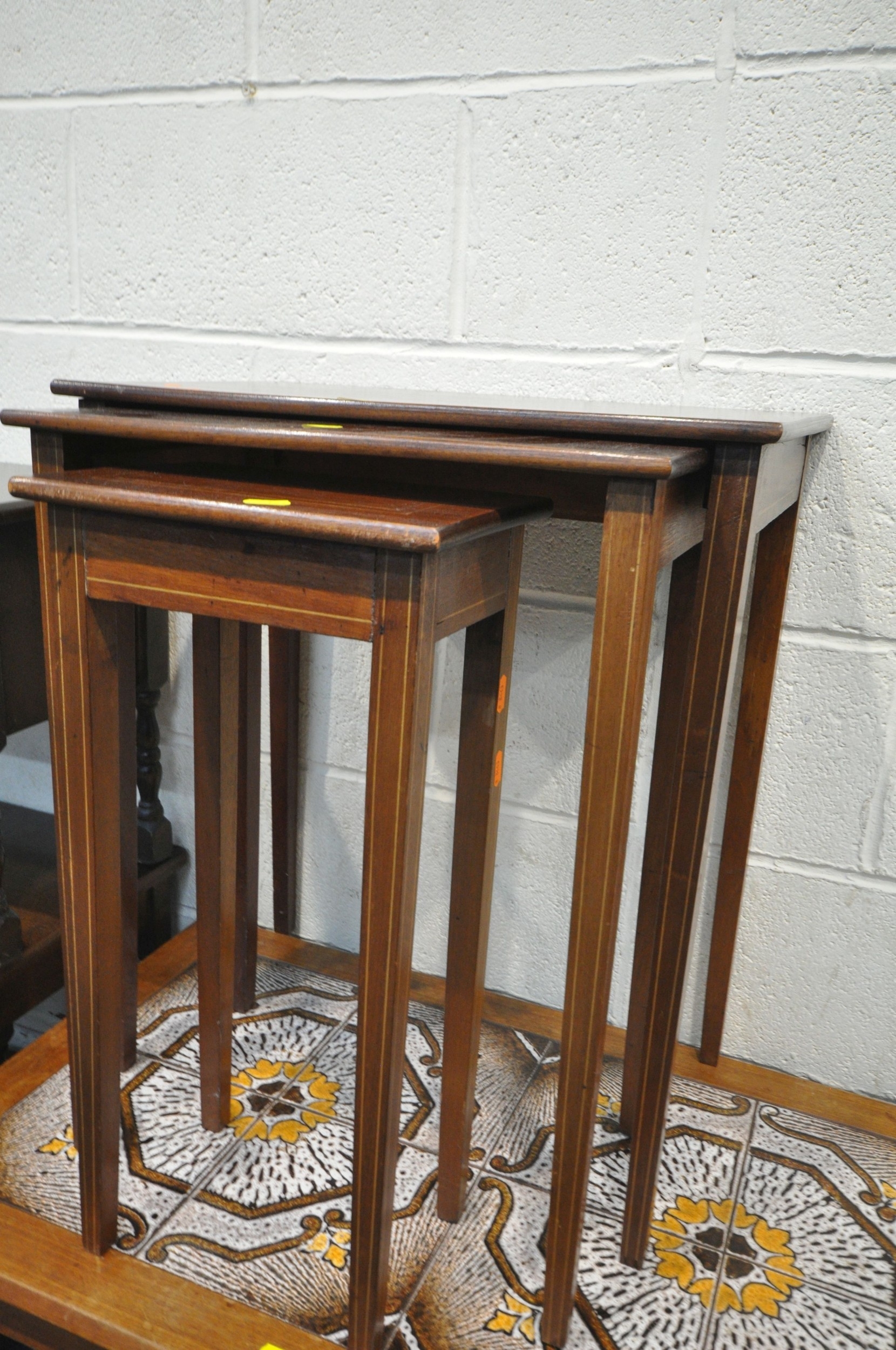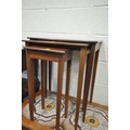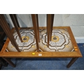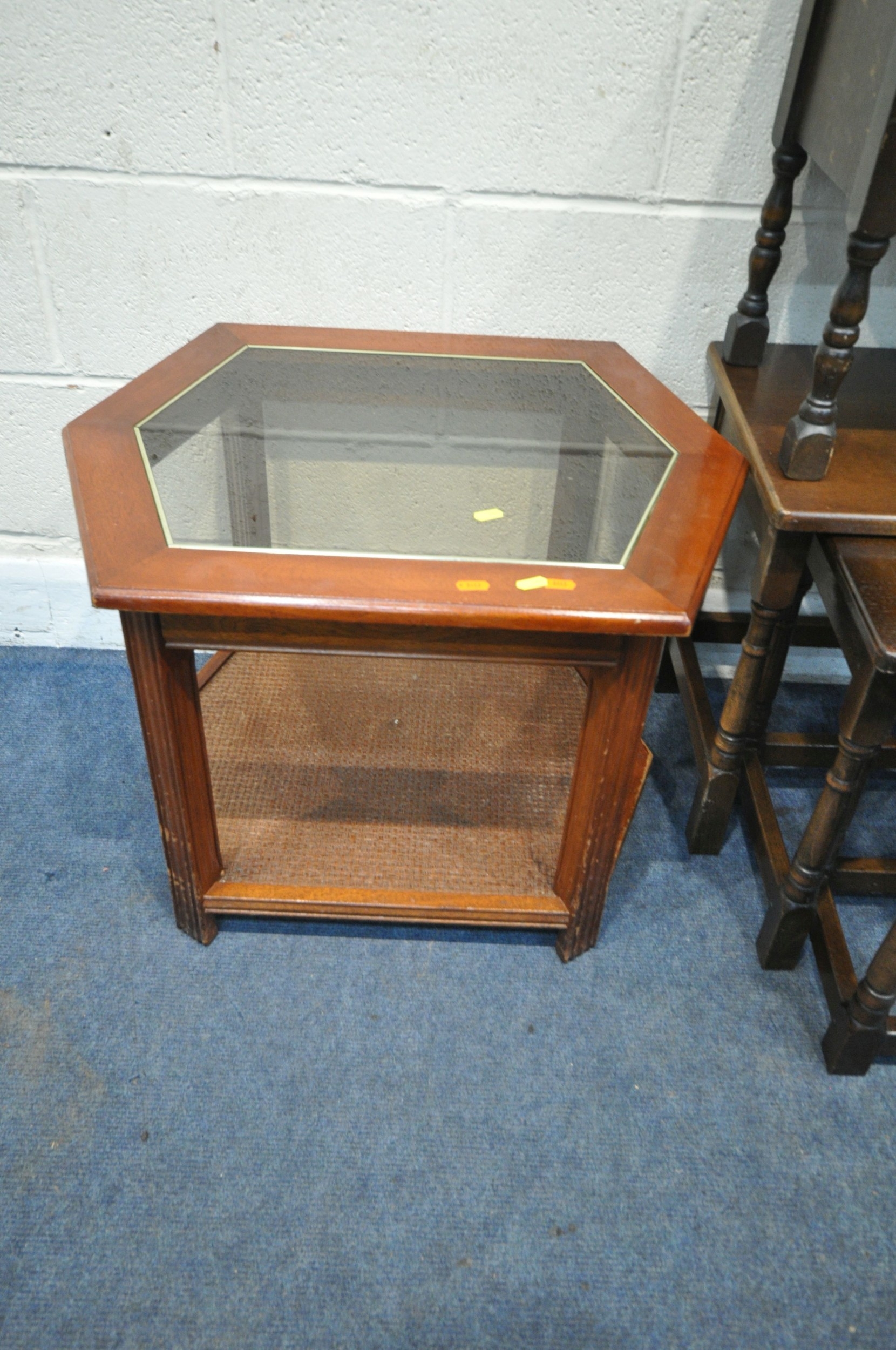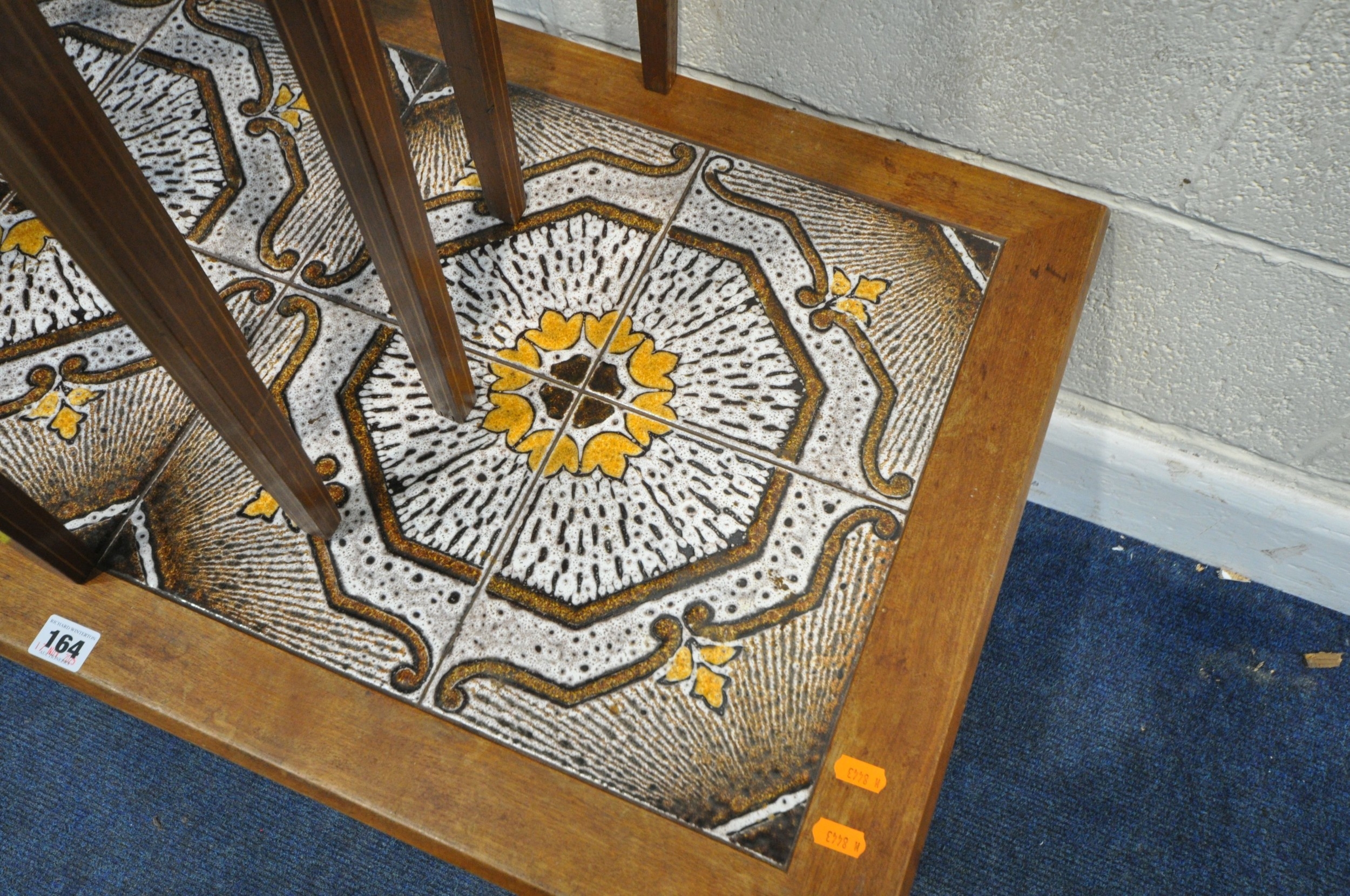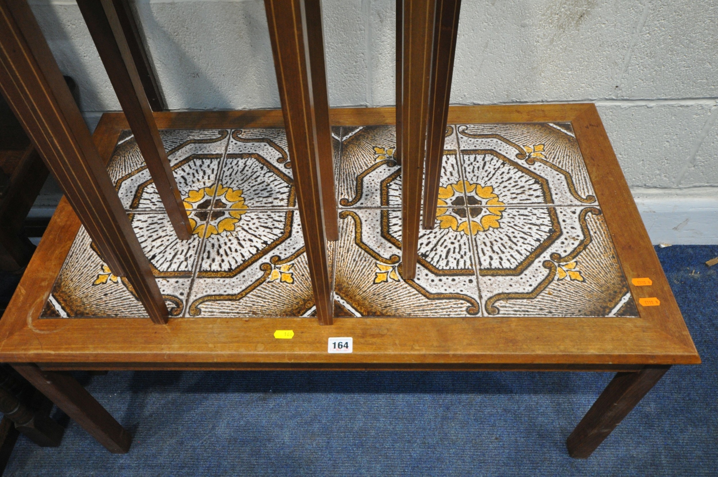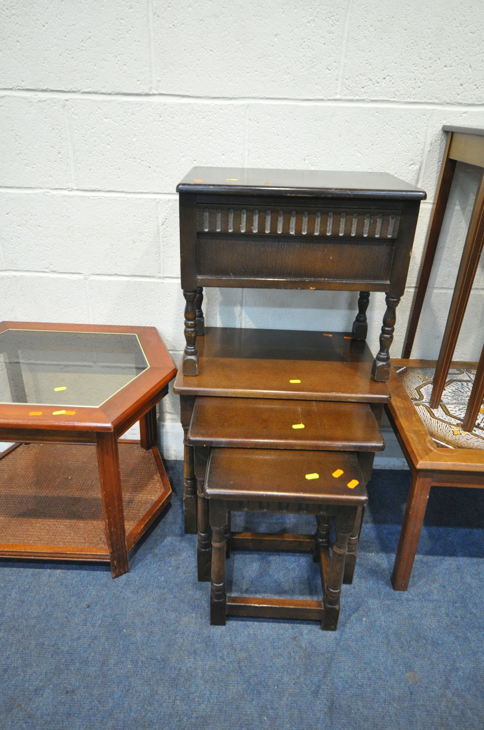 A RECTANGULAR TILE TOP COFFEE TABLE, width 93cm x depth 52cm x height 42cm, a nest of four tables, a nest of three tables, a storage box, and a glass top occasional table, condition report: one table missing to the nest of four, general signs of wear and usage (5)