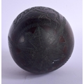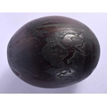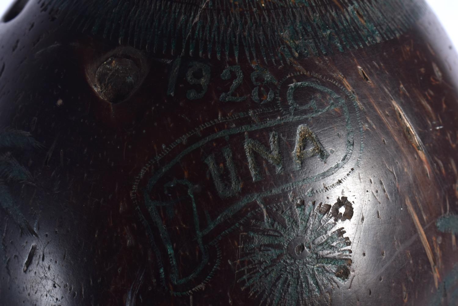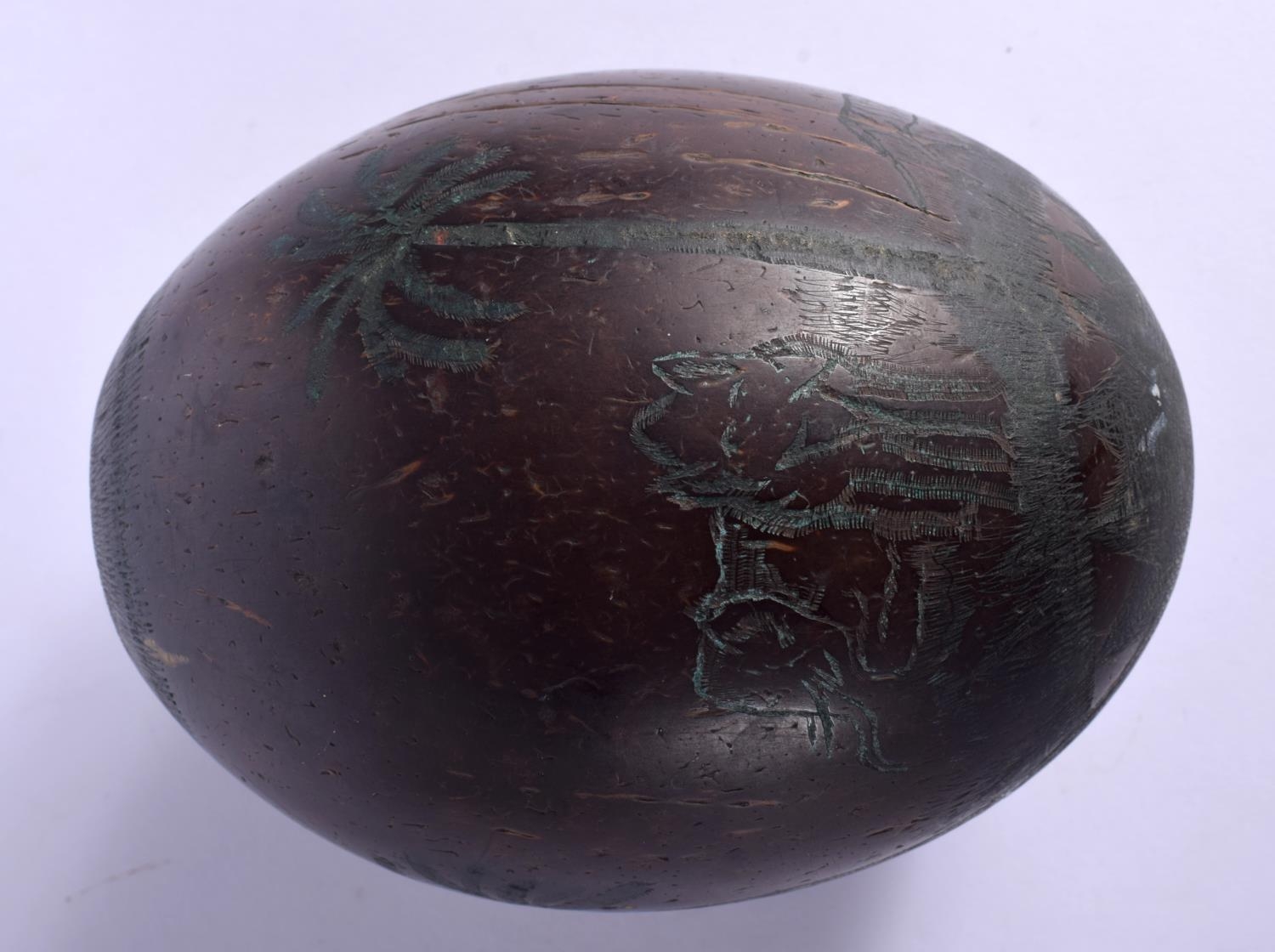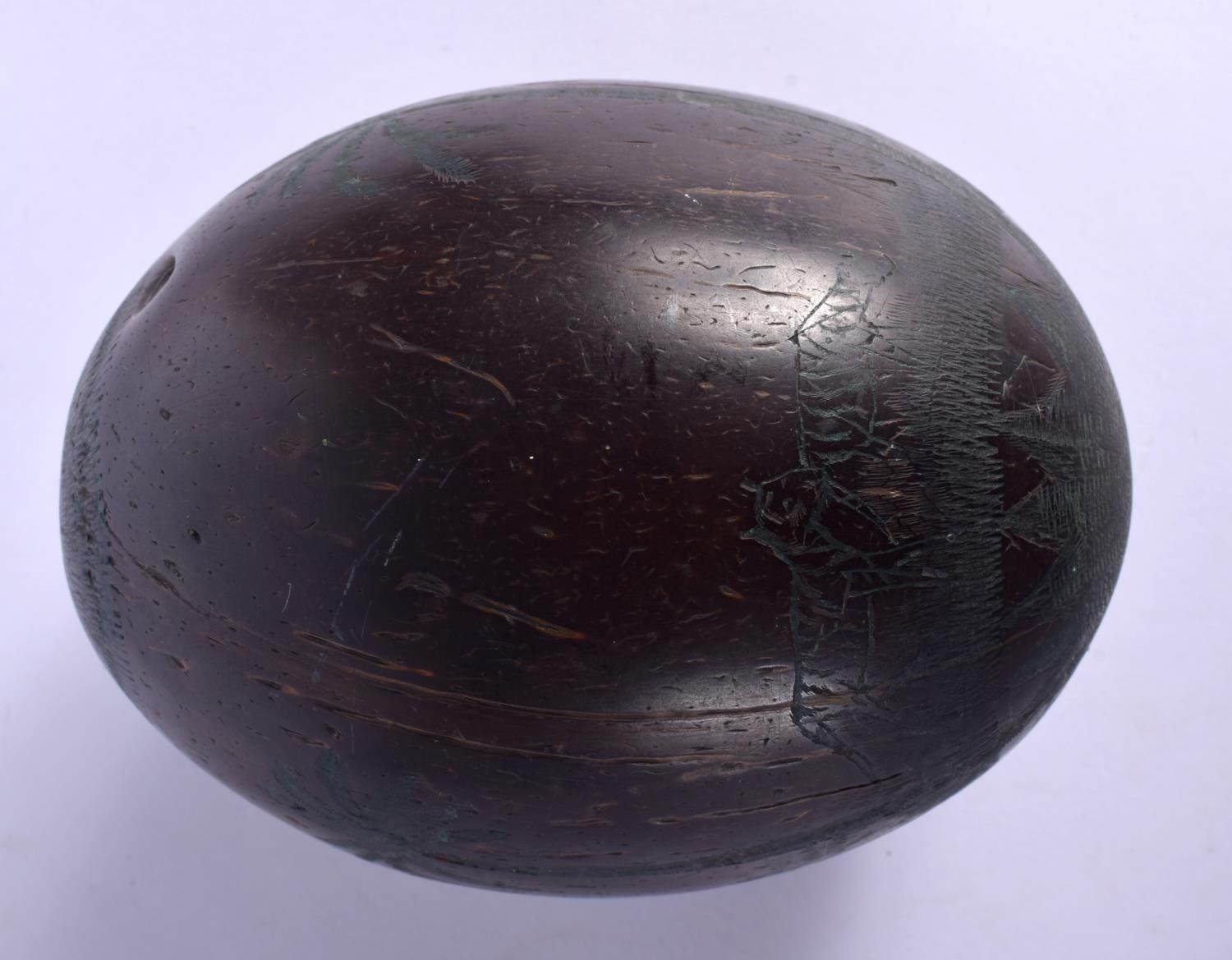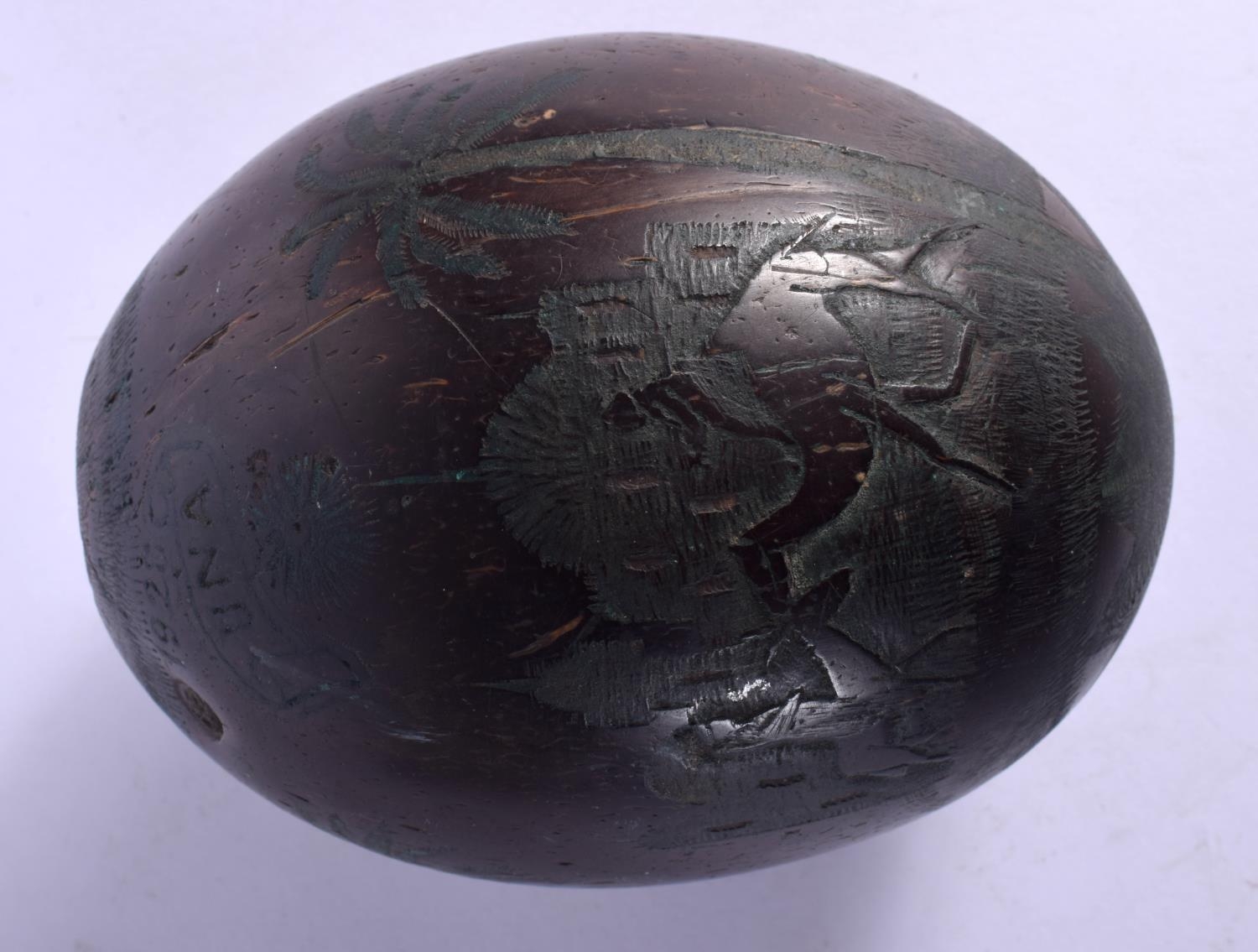 AN EARLY 20TH CENTURY INDIAN CARVED PUNA COCONUT SHELL decorated with figures. 12.5 cm x 9 cm.