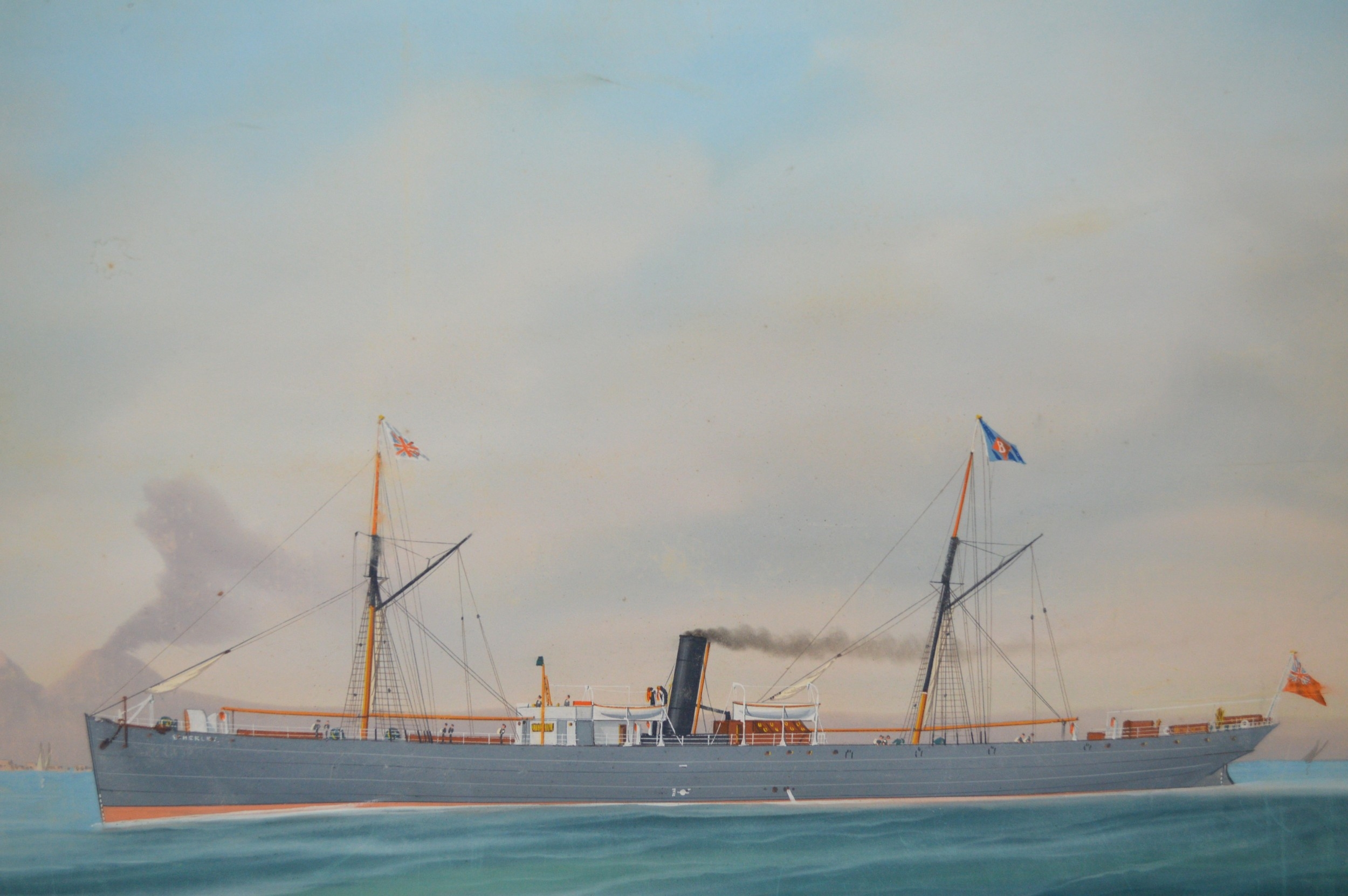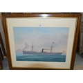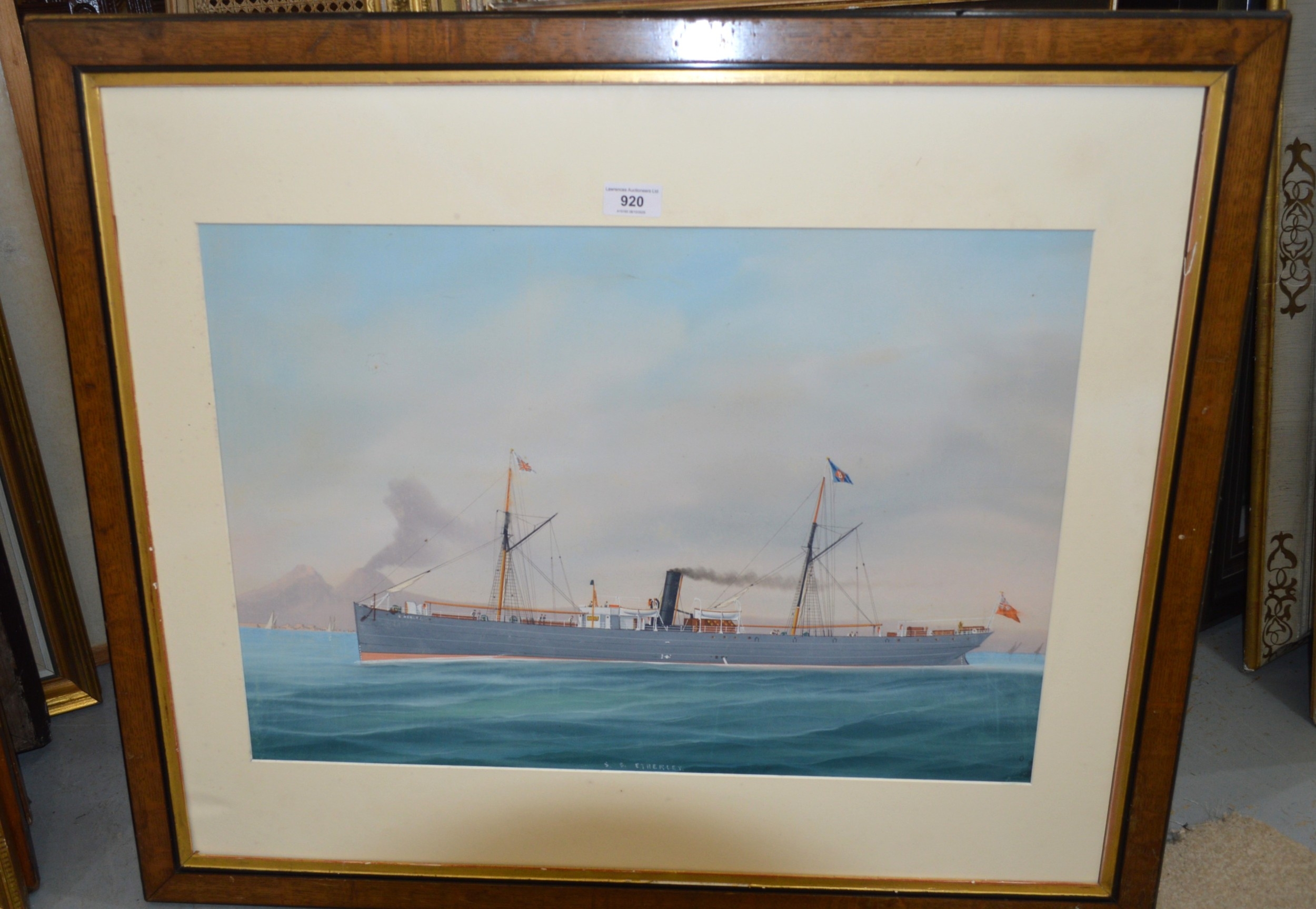 Late 19th / early 20th Century gouache, the steam sail ship ' Etherley ', 40 x 59cm, in an oak and gilt slip frame (lacking glazing), bearing Agnew & Son label verso