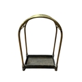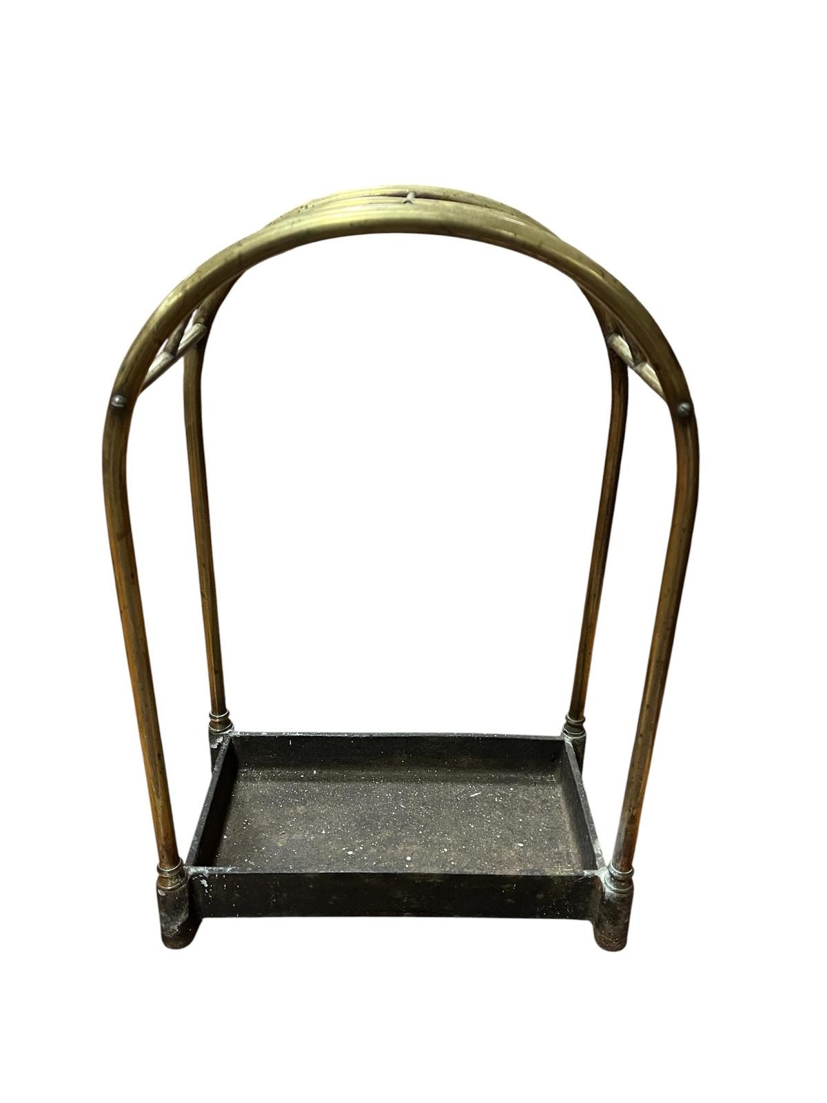 A 19TH CENTURY BRASS COMPARTMENT STICK STAND of rectangular arched form with cast iron well 58cm (h) x 40cm (w) x 33cm (d)