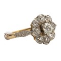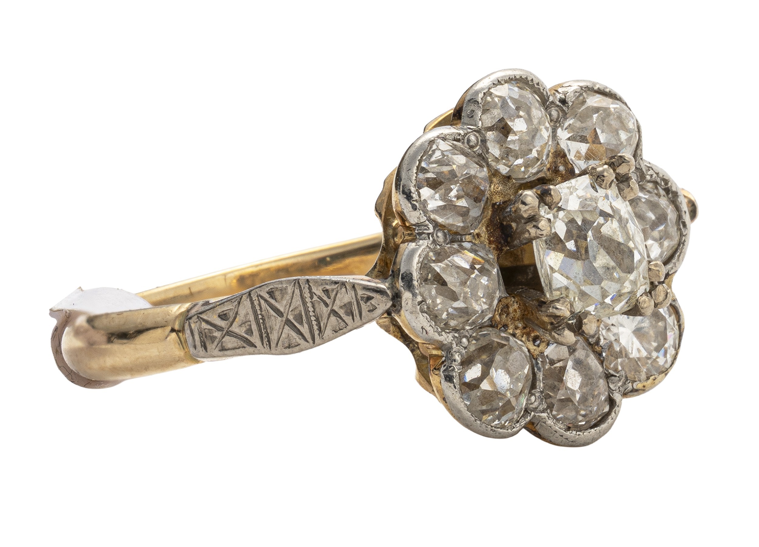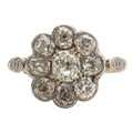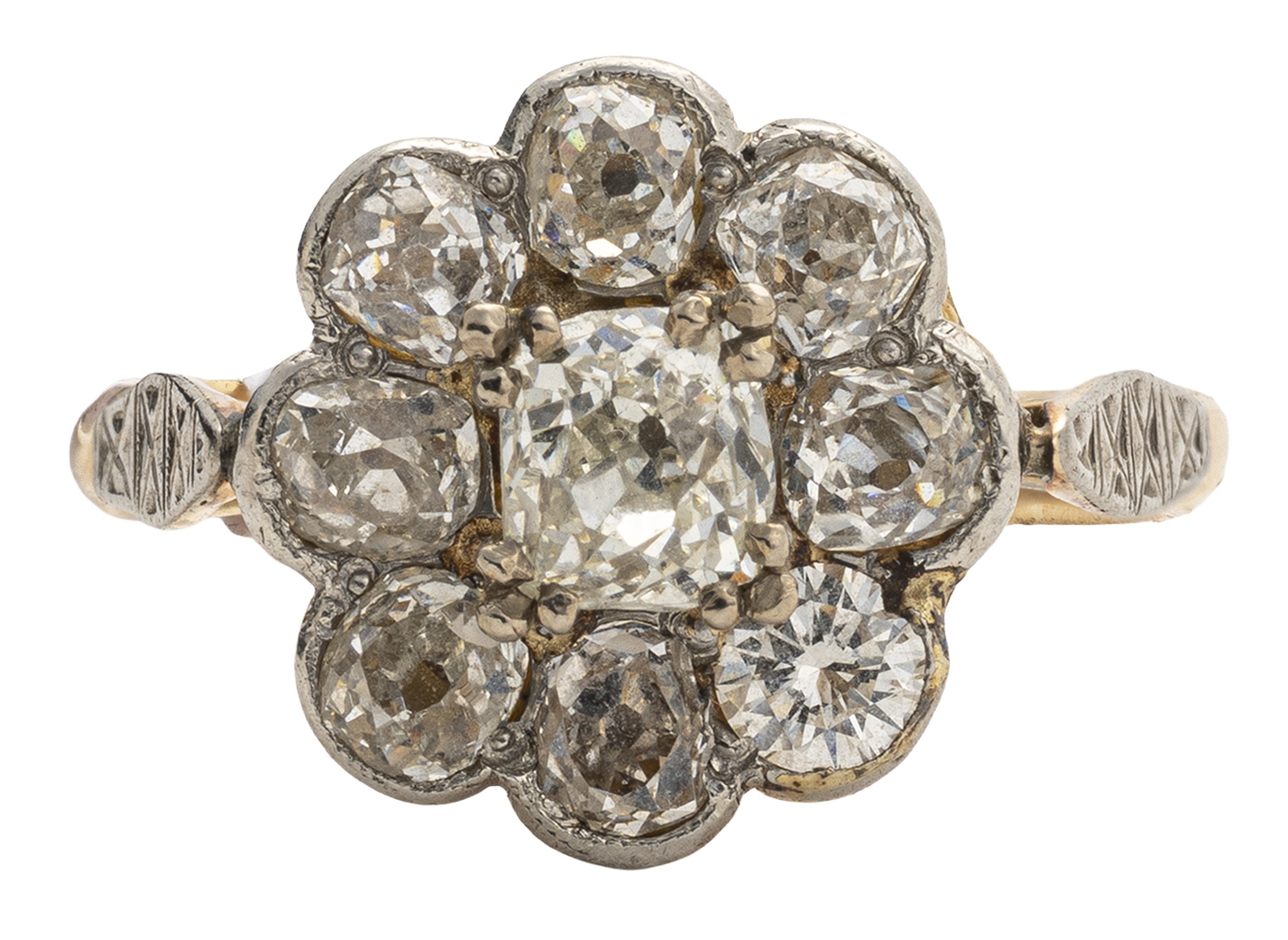 Claw set to the centre, the cushion mine cut diamond surrounded by 6 old mine cut diamonds and one round brilliant cut diamond, colour H, clarity VS, in an 18ct daisy style ring, size L, 5,2g all in