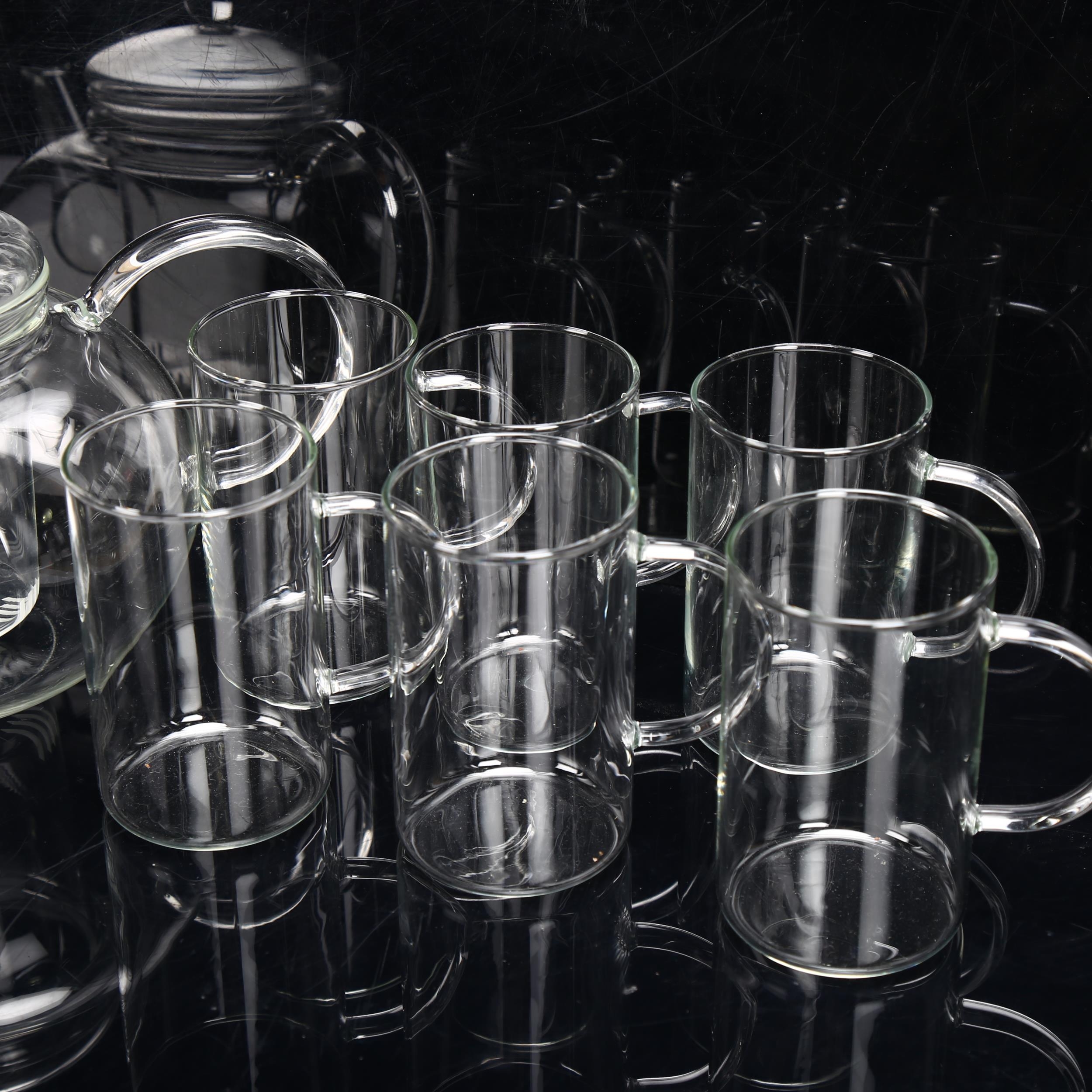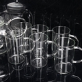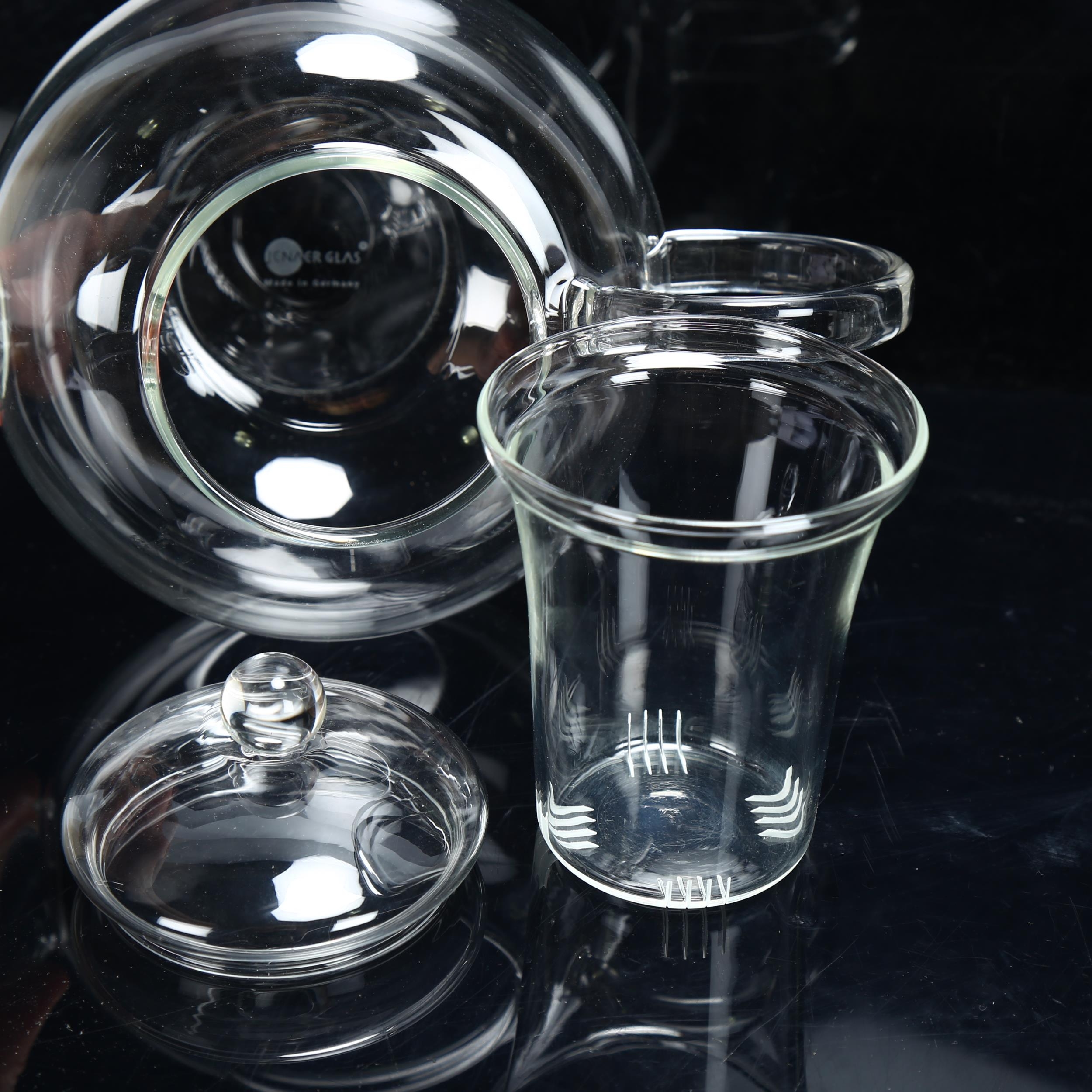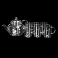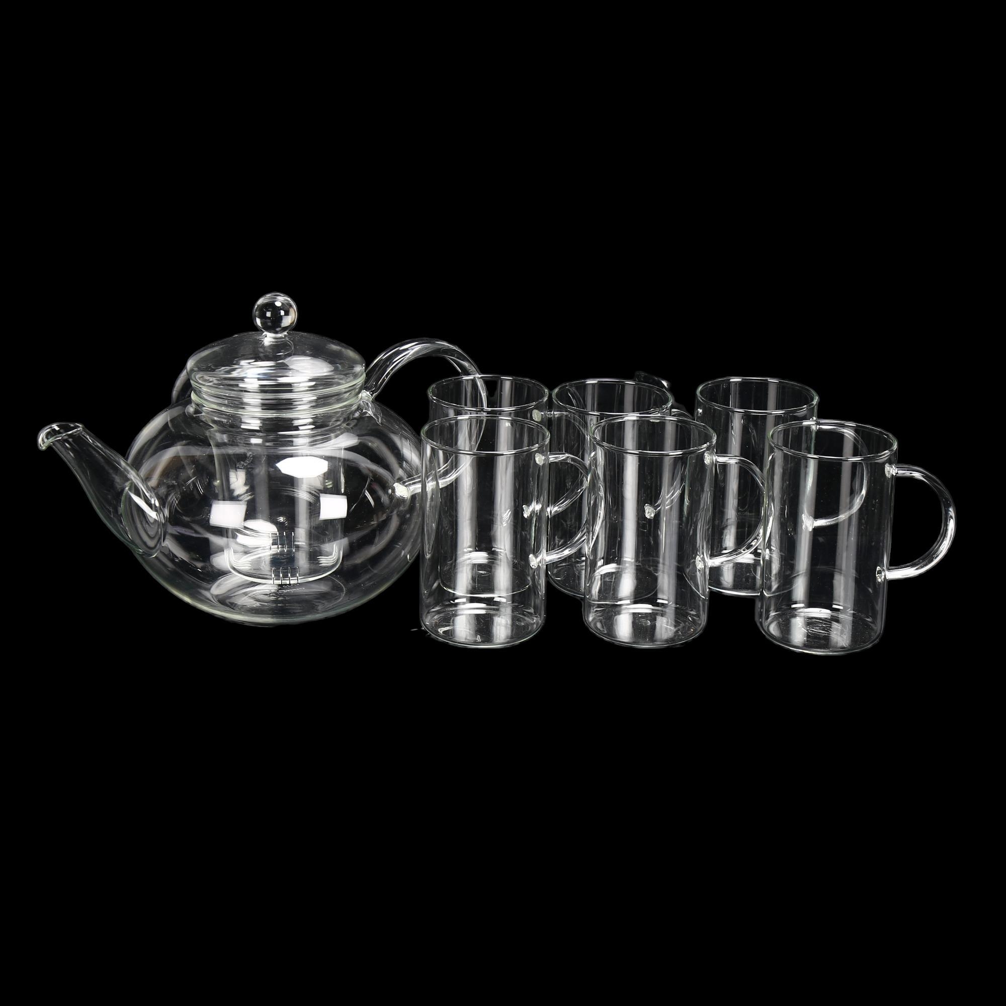 Jenaer Glas, Germany, a clear glass infusion teapot and 6 cups, teapot marked to base, length spout to handle 26cm