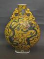 A large Chinese yellow ground twin handled moonflask decorated with dragons to sides, 6 character mark to base, 16' high