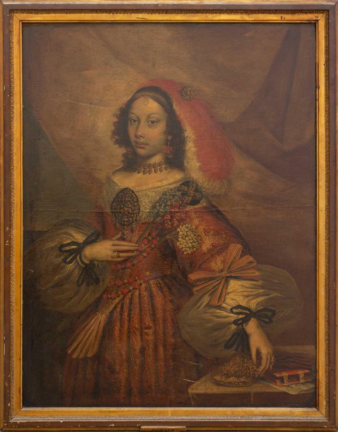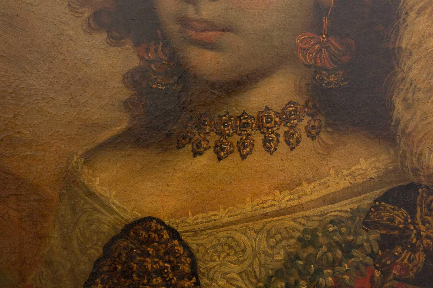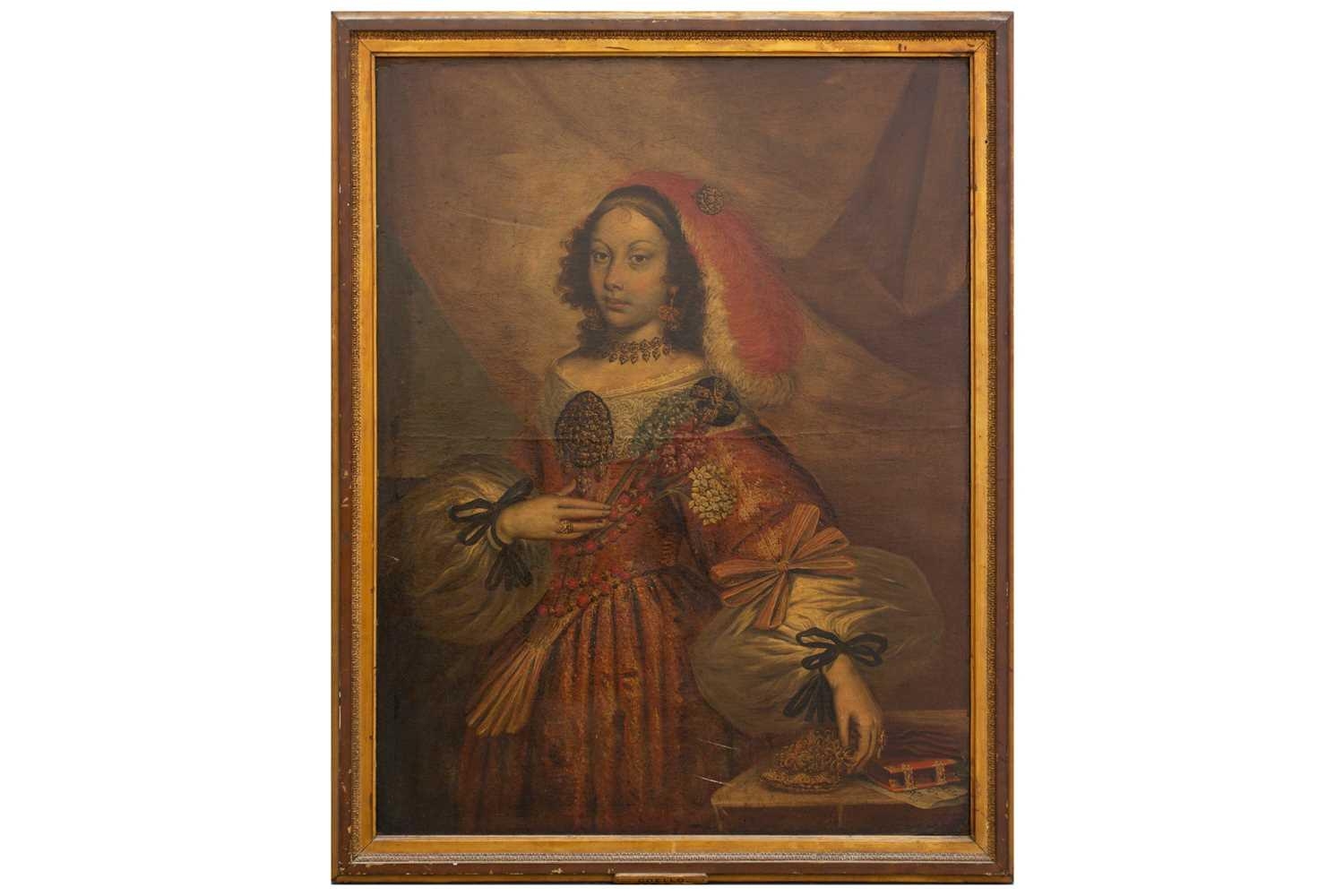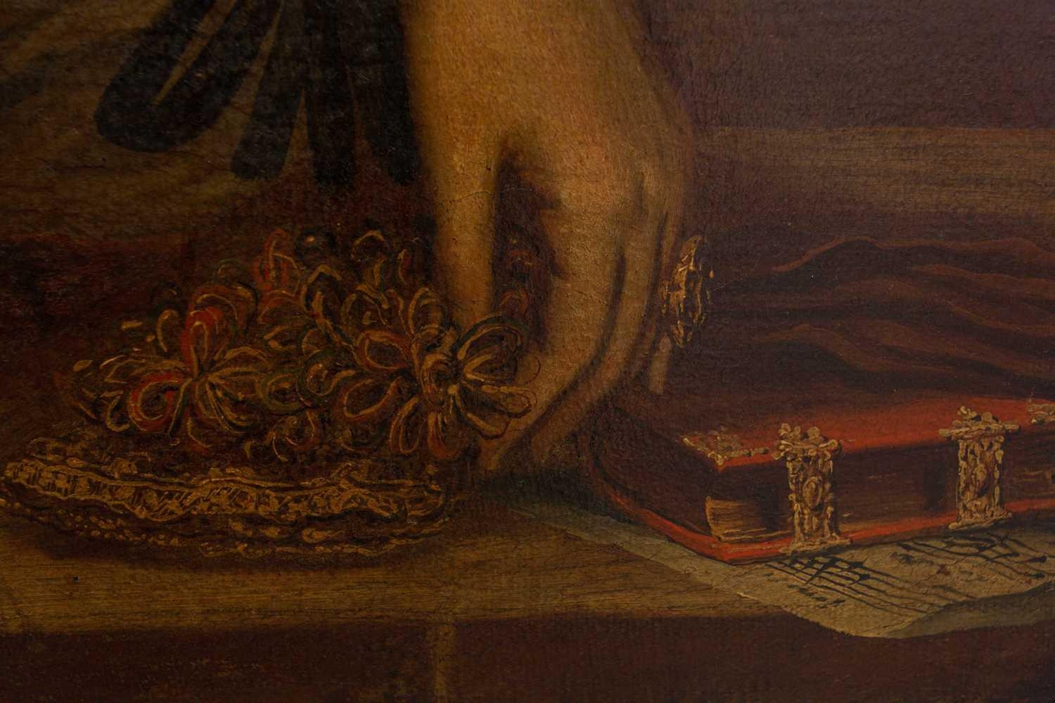 Attributed to Claudio Coello (1642-1693) Spain, Portrait of a Spanish noble lady, her hand resting on a lace bag and a book, unsigned, oil on canvas, 115.5 x 89 cm, later framed Labelled verso, 'Portrait by Coello, Property of Lady Beatrice K??, Colmaton Cottage, Sidmouth'