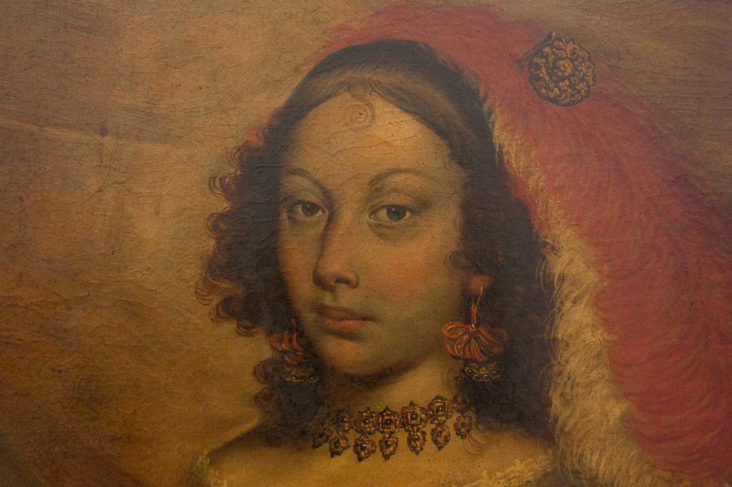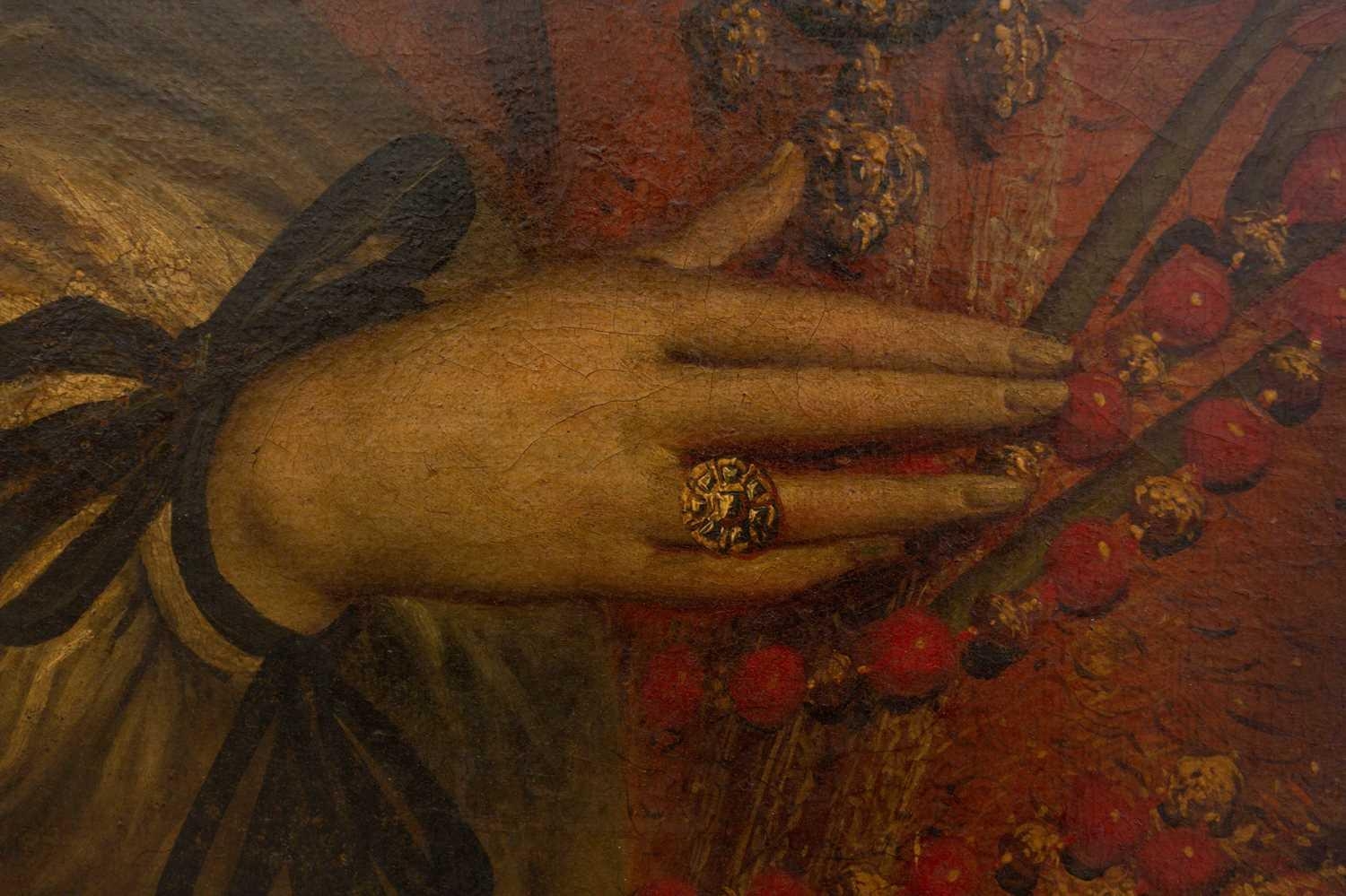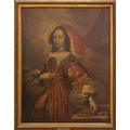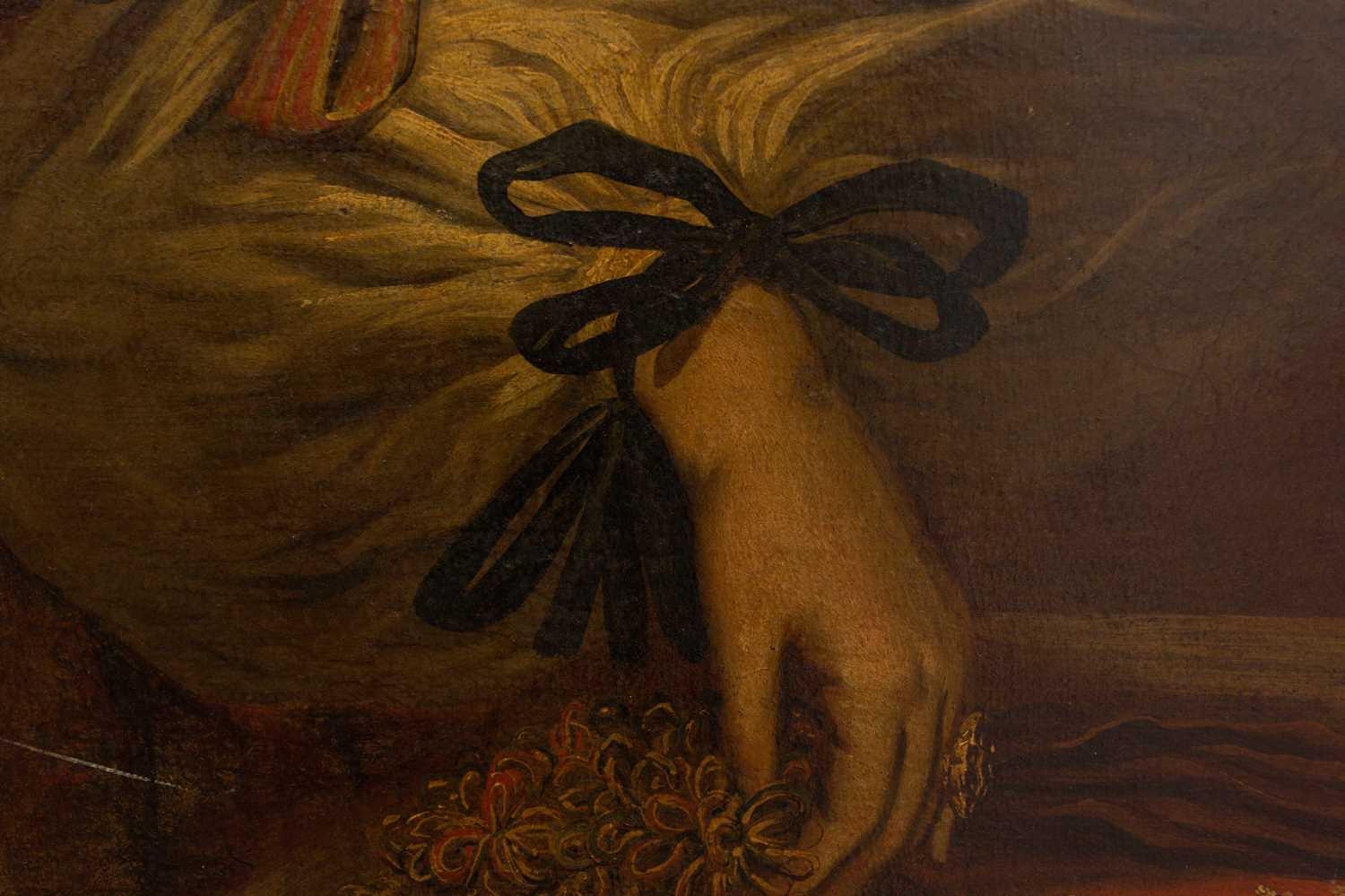 Attributed to Claudio Coello (1642-1693) Spain, Portrait of a Spanish noble lady, her hand resting on a lace bag and a book, unsigned, oil on canvas, 115.5 x 89 cm, later framed Labelled verso, 'Portrait by Coello, Property of Lady Beatrice K??, Colmaton Cottage, Sidmouth'