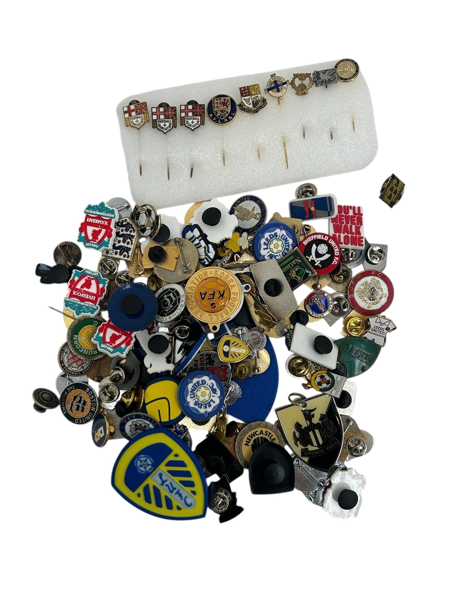 COLLECTION OF 70+ FOOTBALL BADGES, SOME 70s EXAMPLES NOTED, FA PINS/ ETC.