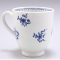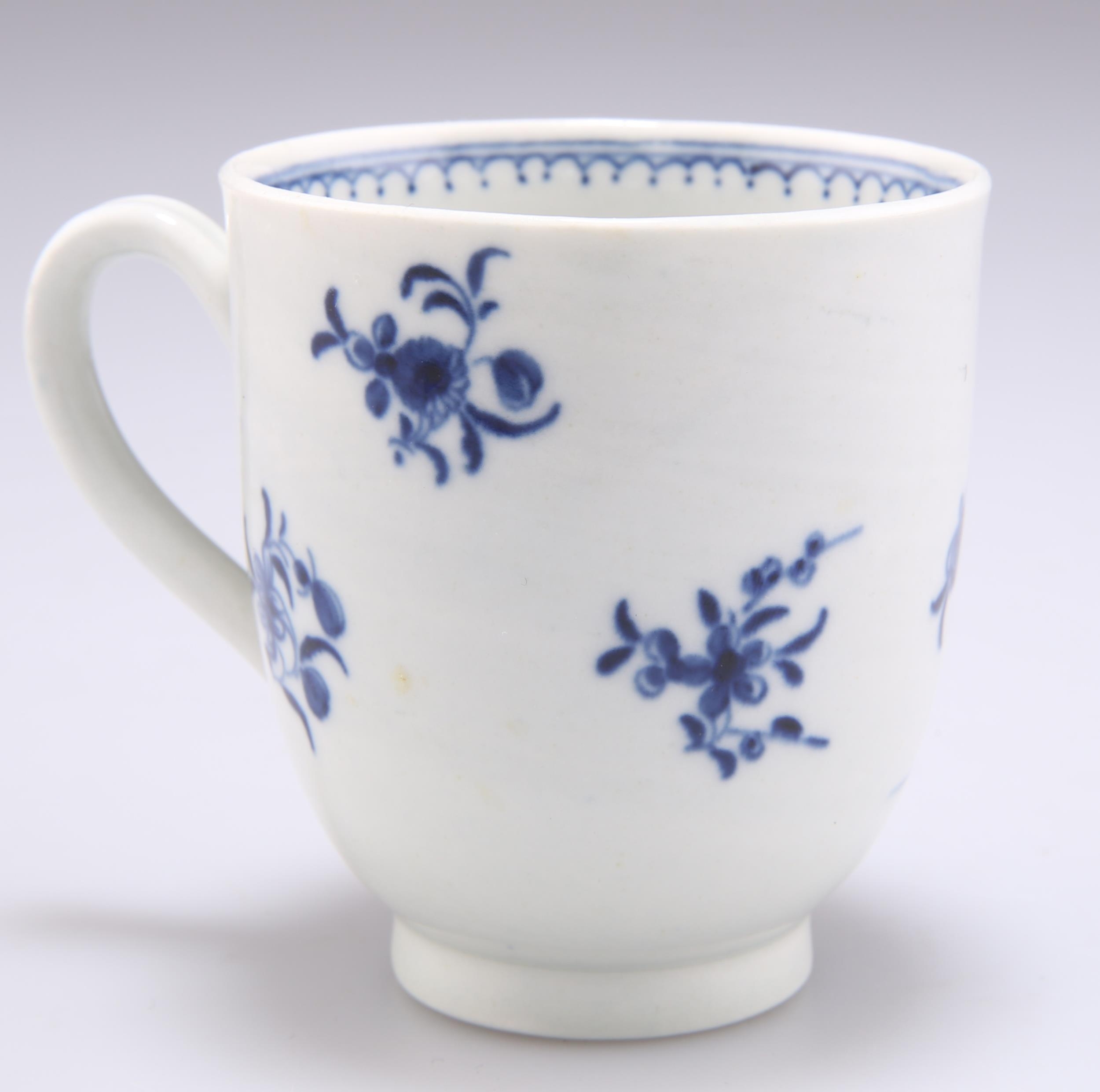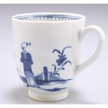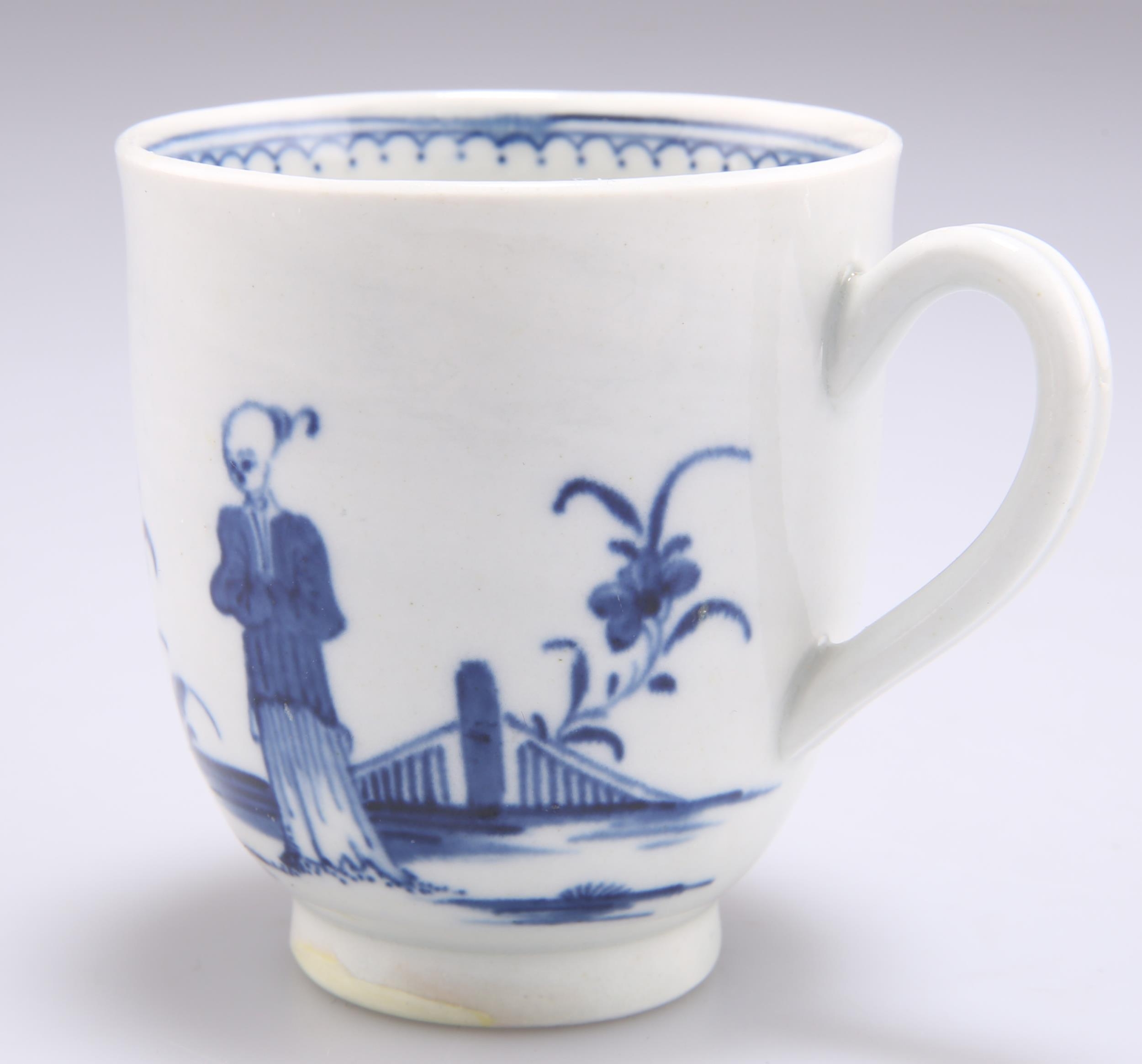 A WORCESTER COFFEE CUP, CIRCA 1770, with grooved handle, underglaze blue decorated with the 'Waiting Chinaman' pattern, open crescent mark. 6.5cm high