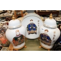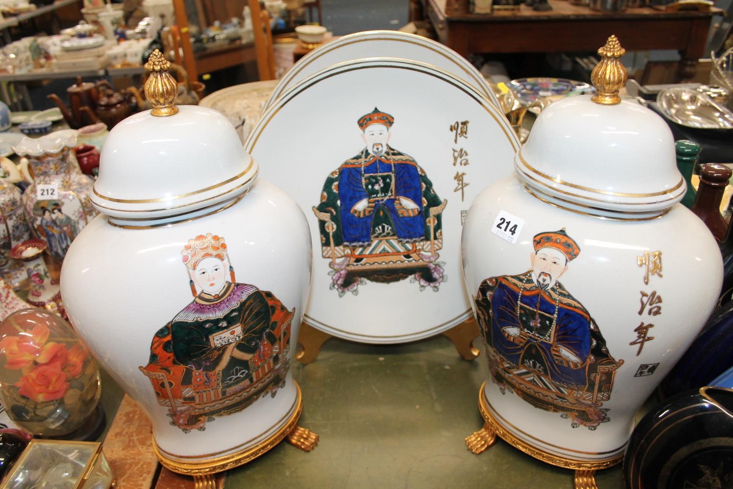Pair of figure decorated, crackle glazed, oriental urns and covers and matching chargers on stands.