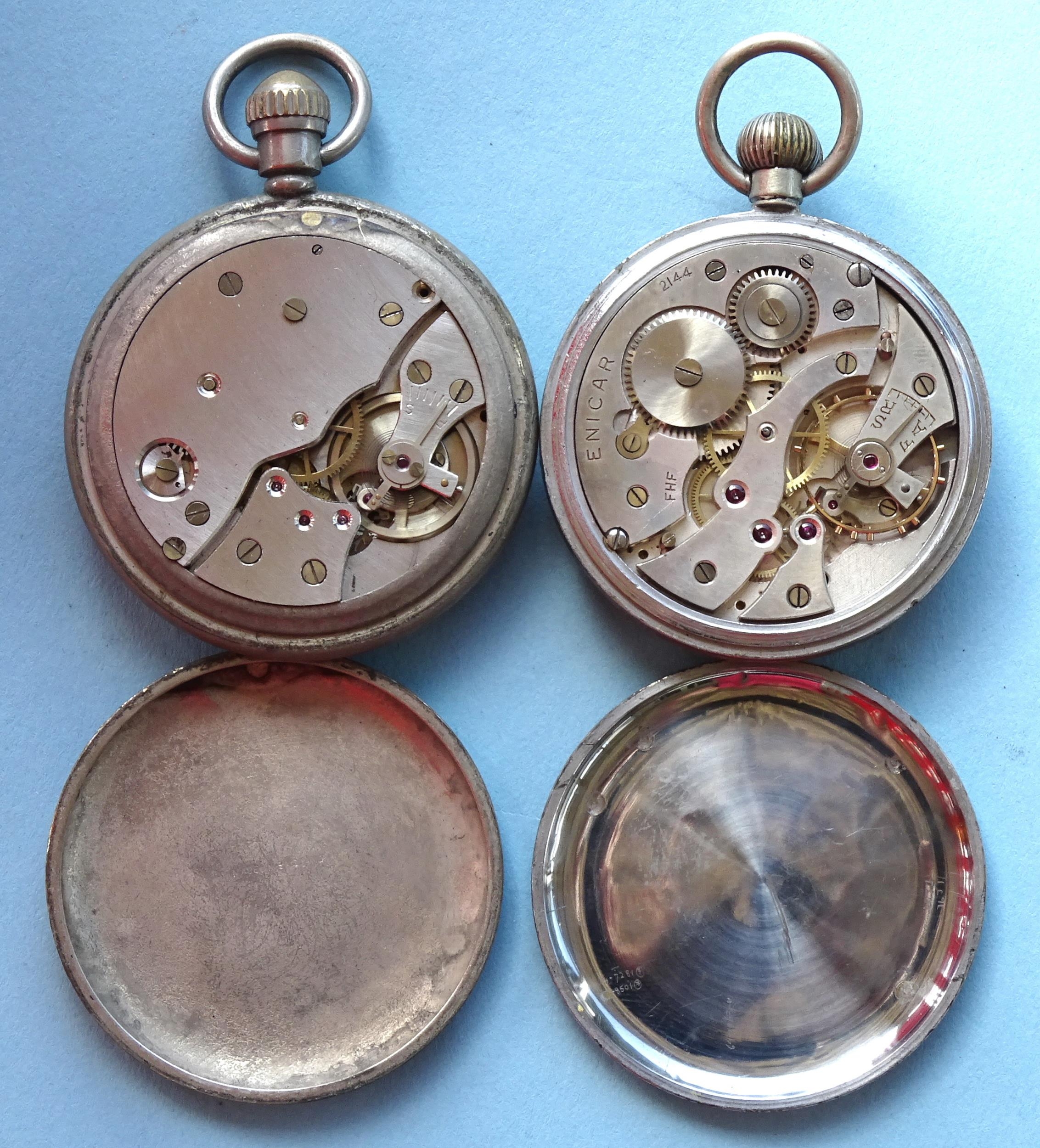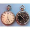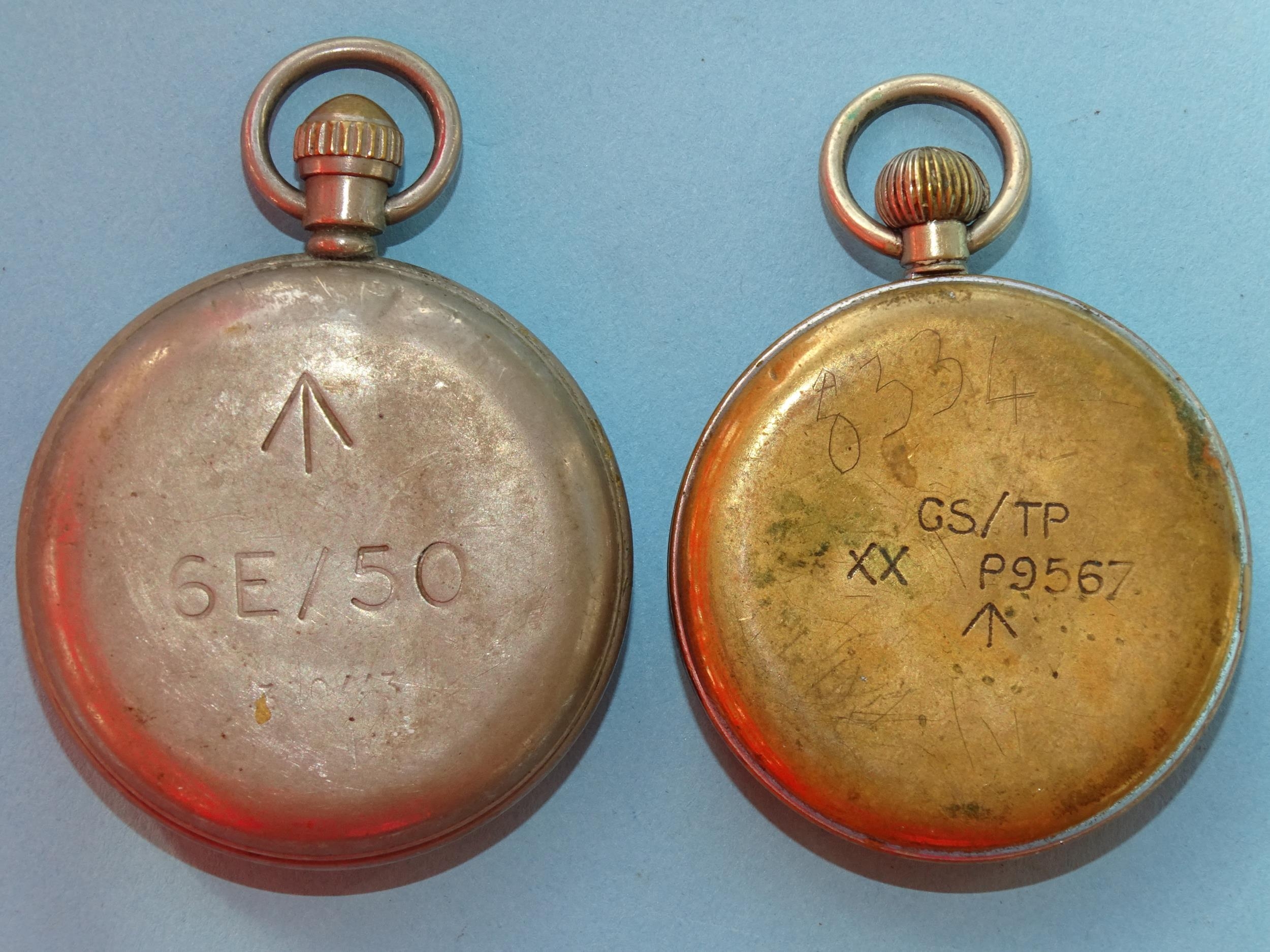 Enicar, a WWII British military issue GSTP pocket watch, the black dial with Arabic numerals and seconds subsidiary, the signed cal 2144 movement in plated case marked GS/TP xx P9567, 49mm, (plate rubbed off, working but can't guarantee time-keeping) and another military pocket watch marked 6E/50, (2).