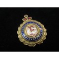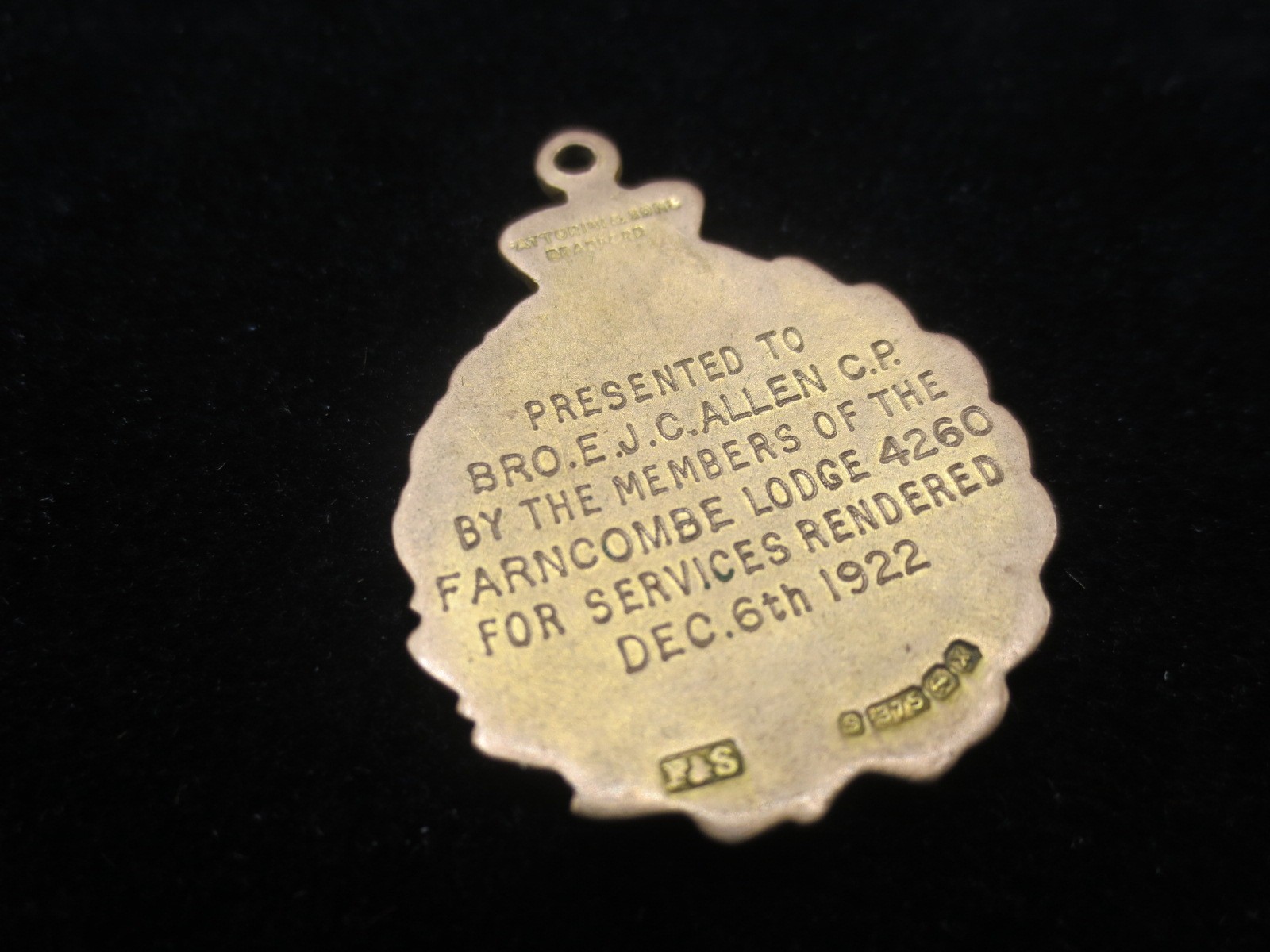 A 9 carat gold enamelled Masonic watch fob by Fattorini & Sons, inscribed to reverse 'Presented to Bro E.J.C.Allen CP by the members of the Farncombe Lodge 4260 for services rendered Dec 6th 1922', hallmarked to base. Face features 'Justice Truth Philanthropy' around a CP logo under a crown, finished in enamel, very slight a/f to enamel to right hand side as pictured. Approx weight 9.32g.