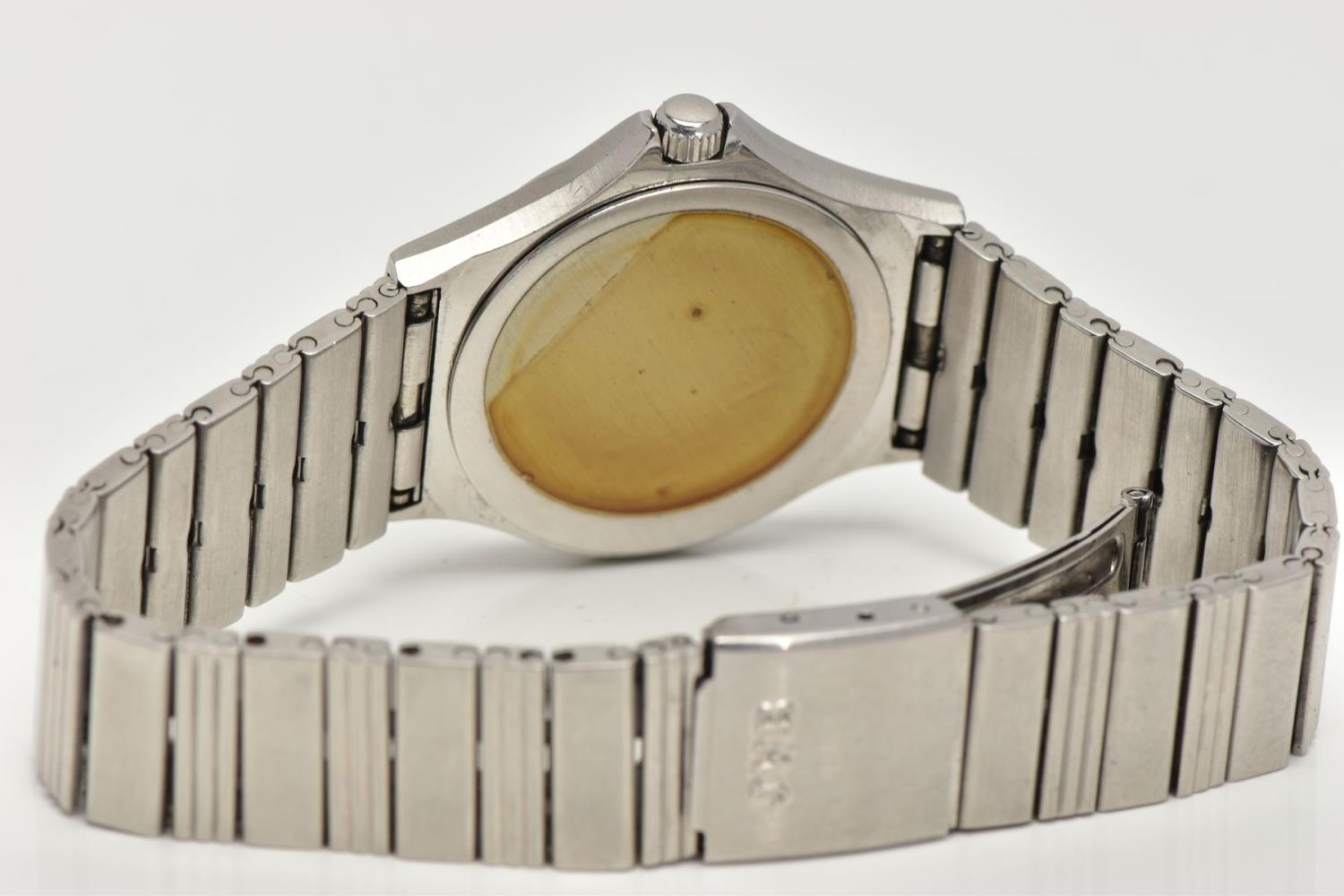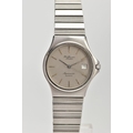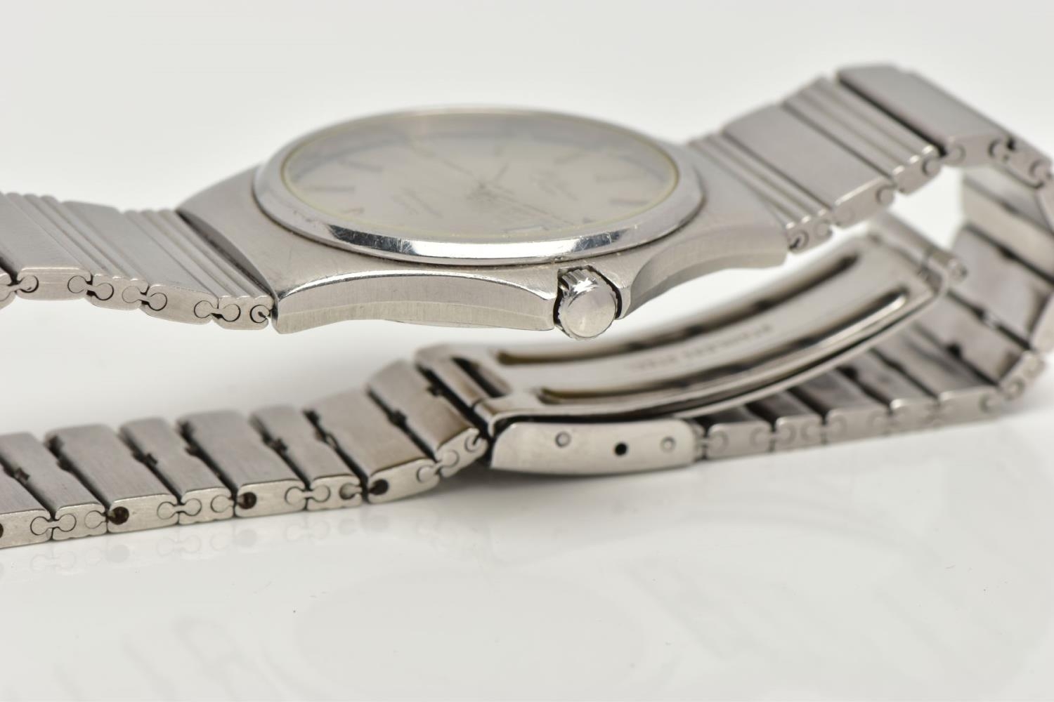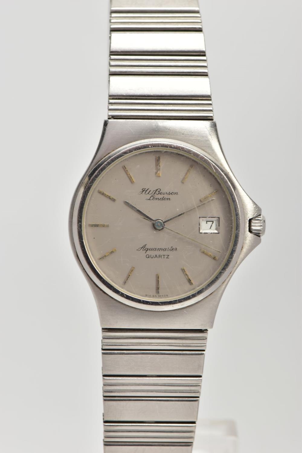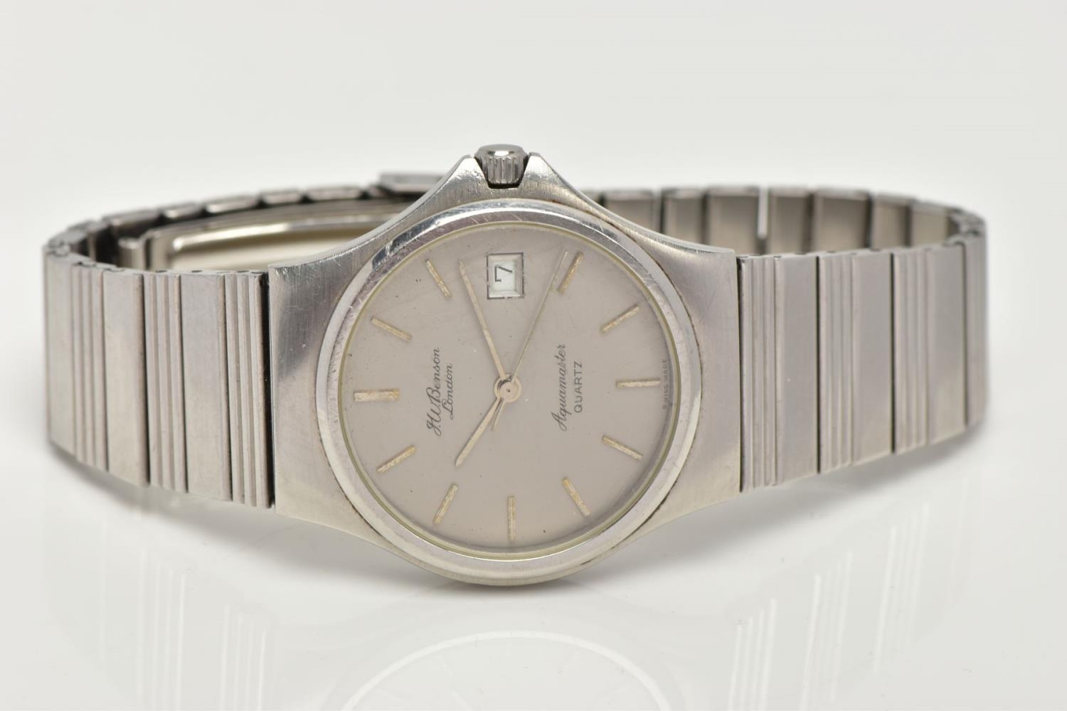 A GENTS 'J W BENSON' QUARTZ WRISTWATCH, round silver dial signed 'J W Benson, Aquamaster Quartz', baton markers, date aperture at the three o'clock position, white metal hands, within a plain polished case, approximate case width including crown 35.1mm, fitted with a textured bracelet and fold over signed 'JWB' clasp (condition report: working at time of cataloguing, although time keeping is untested, winds and sets, general light scratches to the glass front, clasp in working condition, overall condition good)