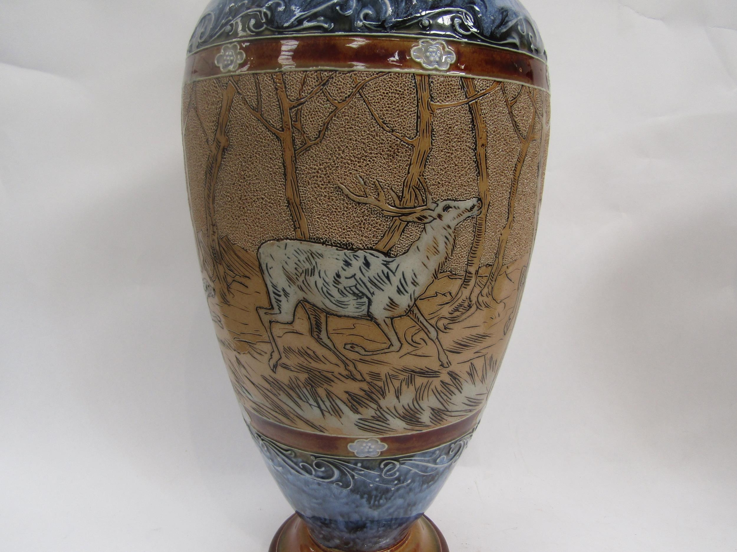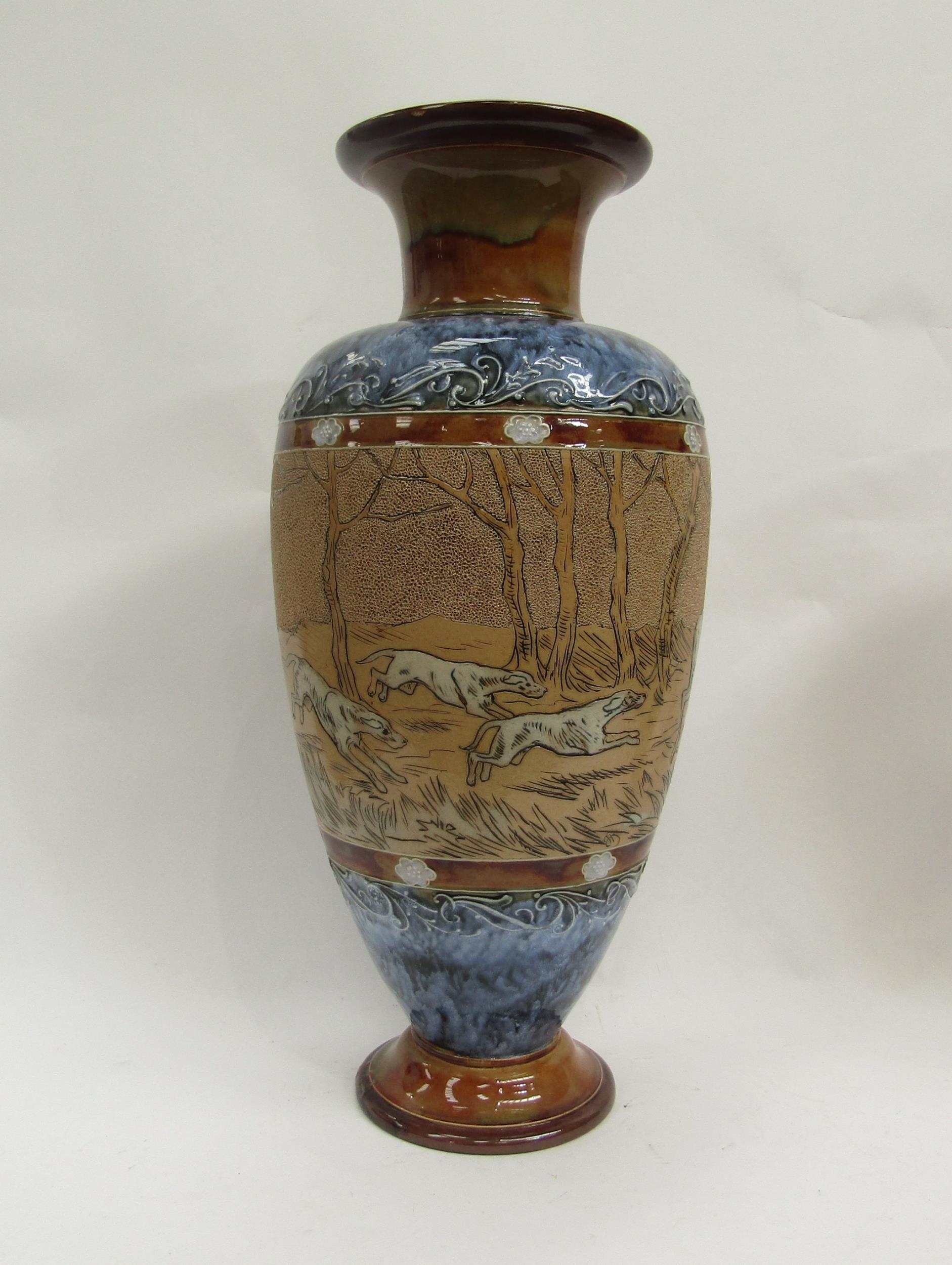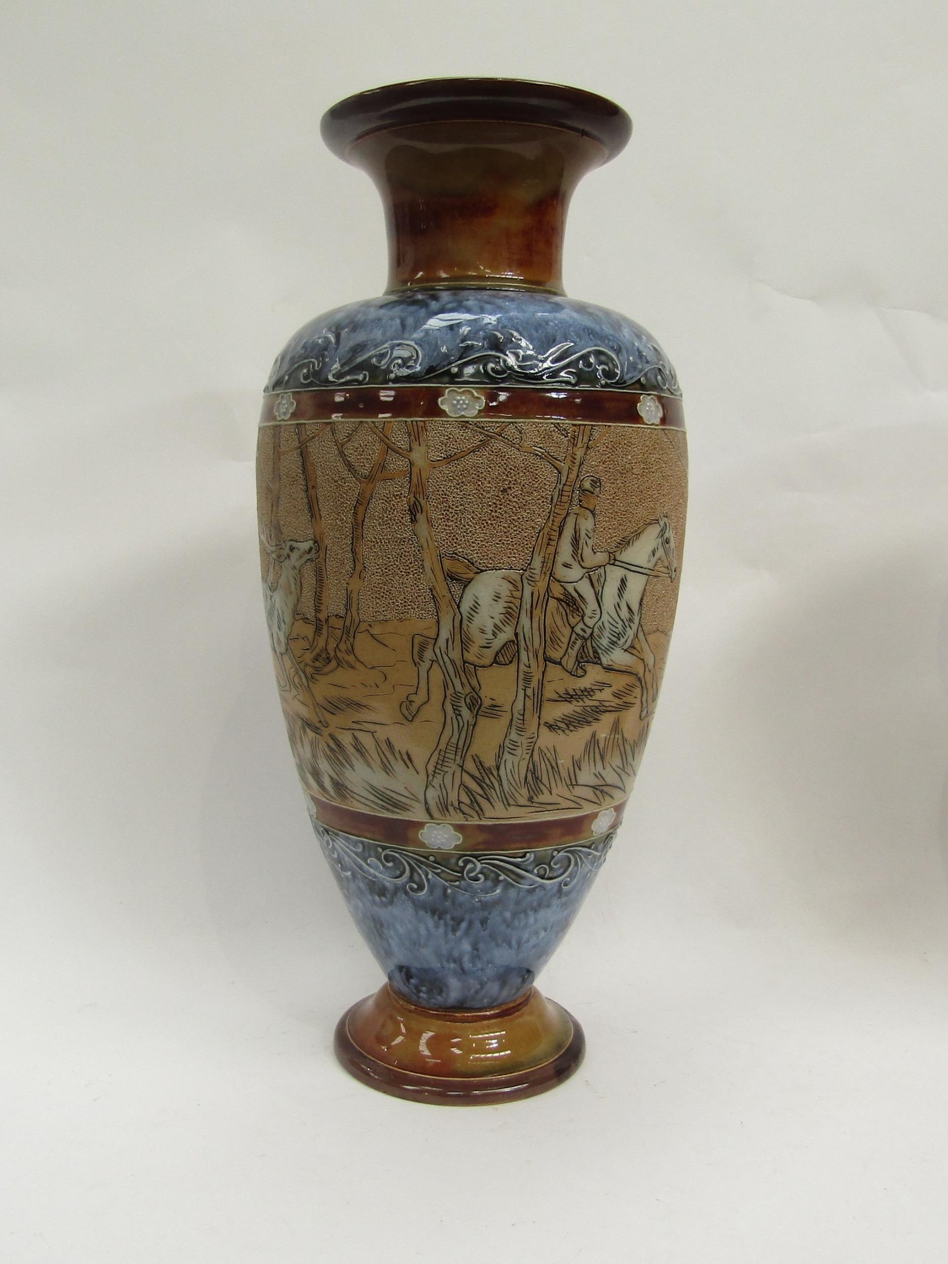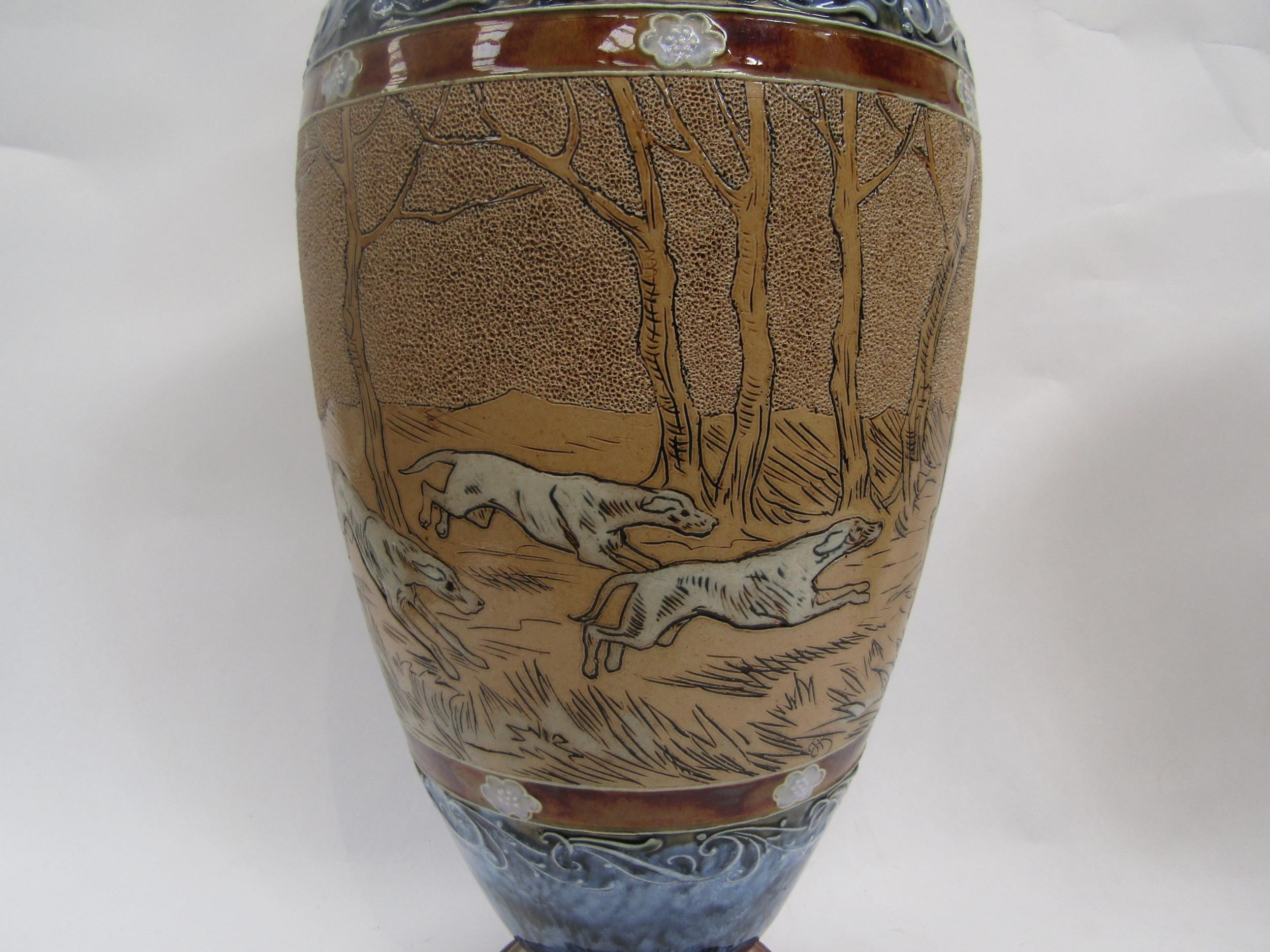 A Royal Doulton Hannah Barlow vase decorated in scraffito with stag hunting scene. Firing crack to base, 44.5cm tall