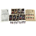 To include nine hand-painted plaster musician figures, comprising a Drummer, Accordion player, Double Bassist, and various wind players, each housed in their original cardboard mailing boxes, together with eleven enamel badges featuring various characters such as a Lollipop Man, Scout, and Hockey Player, the lot also includes a rare original paper collection form and a Robertson's printed paper bag.