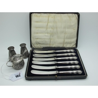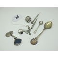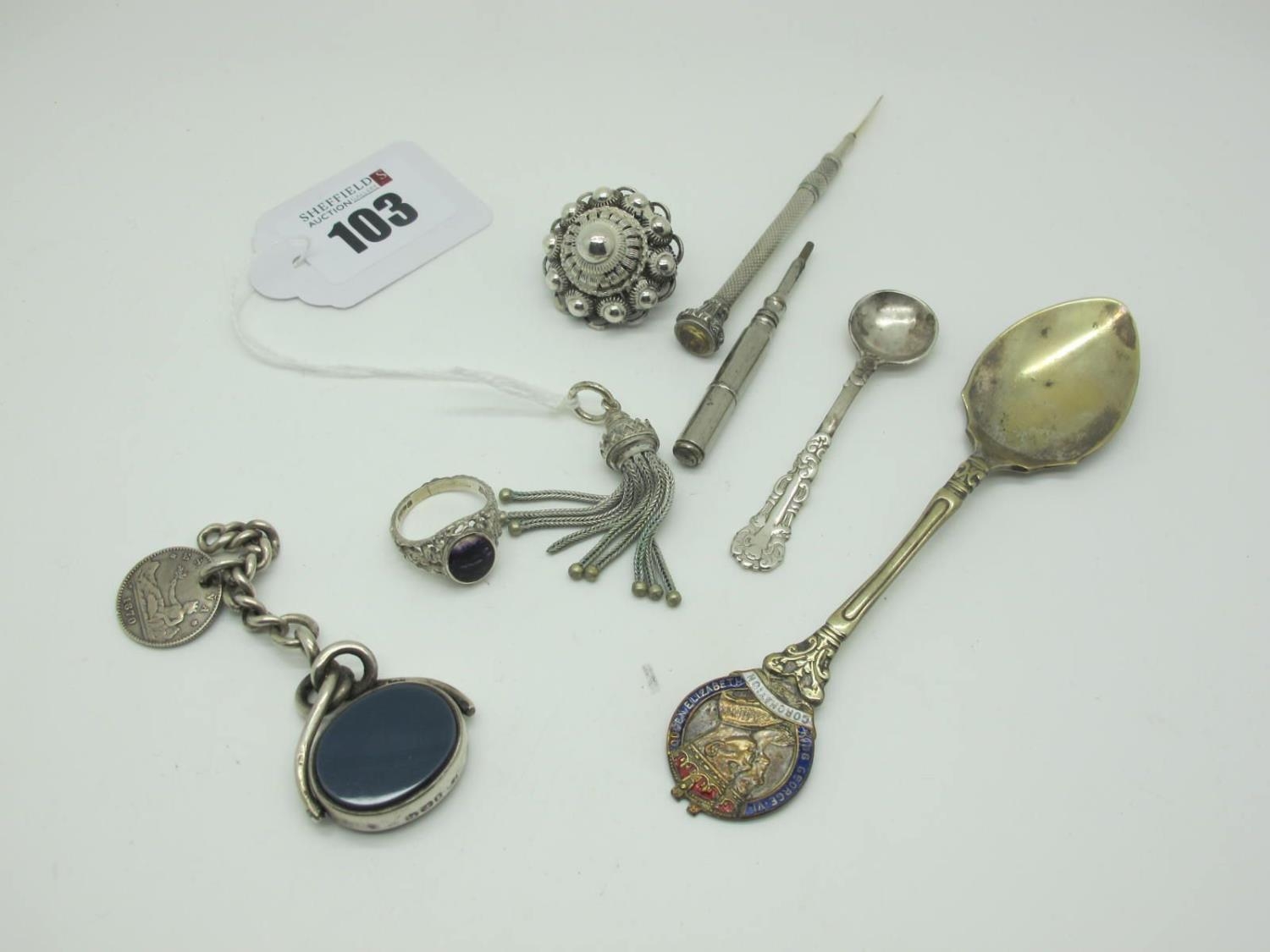 A Hallmarked Silver Blue John Inset Ring, (finger size K) together with a circular brooch, of dome shape, a tassel pendant, a hallmarked silver hardstone inset swivel fob pendant, a hallmarked silver salt spoon, a 1937 Coronation souvenir teaspoon, an engine turned sliding tooth pick, etc.