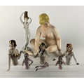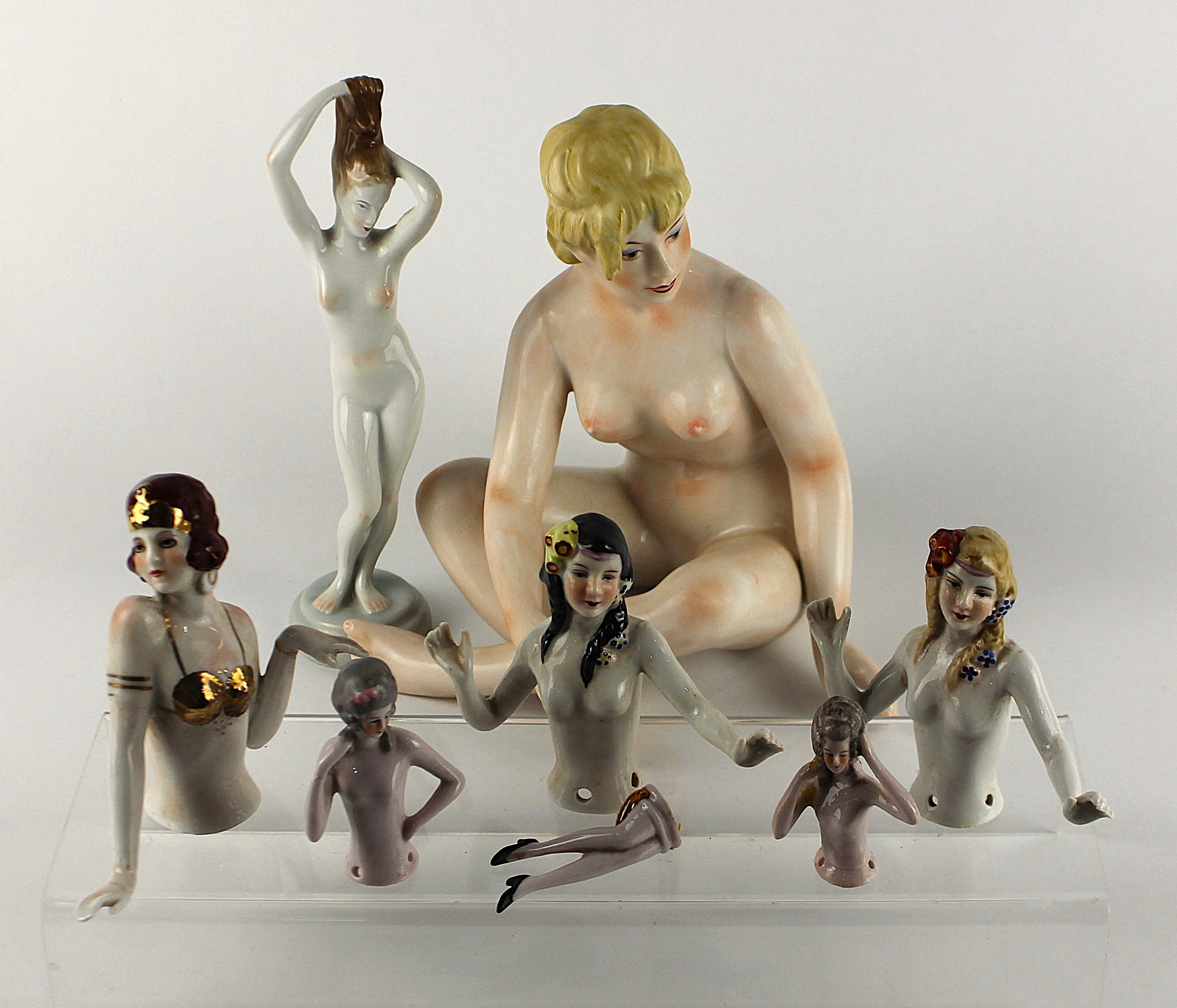 A pair of Art Deco style porcelain half dolls, each figure with floral headdress, height 9.5cm, together with a further Art Deco style porcealin half doll, with gold colour bikini, impressed number 7378, height 10.5cm, a two part porcelain doll, marked foreign, a similar half doll, an Aquincum Budapest nude porcelain figure, height 20cm and an Austrian porcelain nude porcelain seated female figure, marked 'Wien', height 22cm (8)