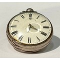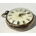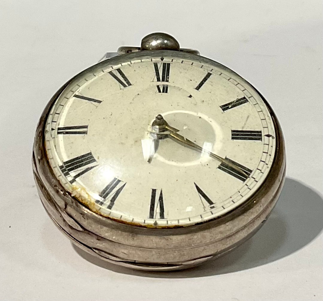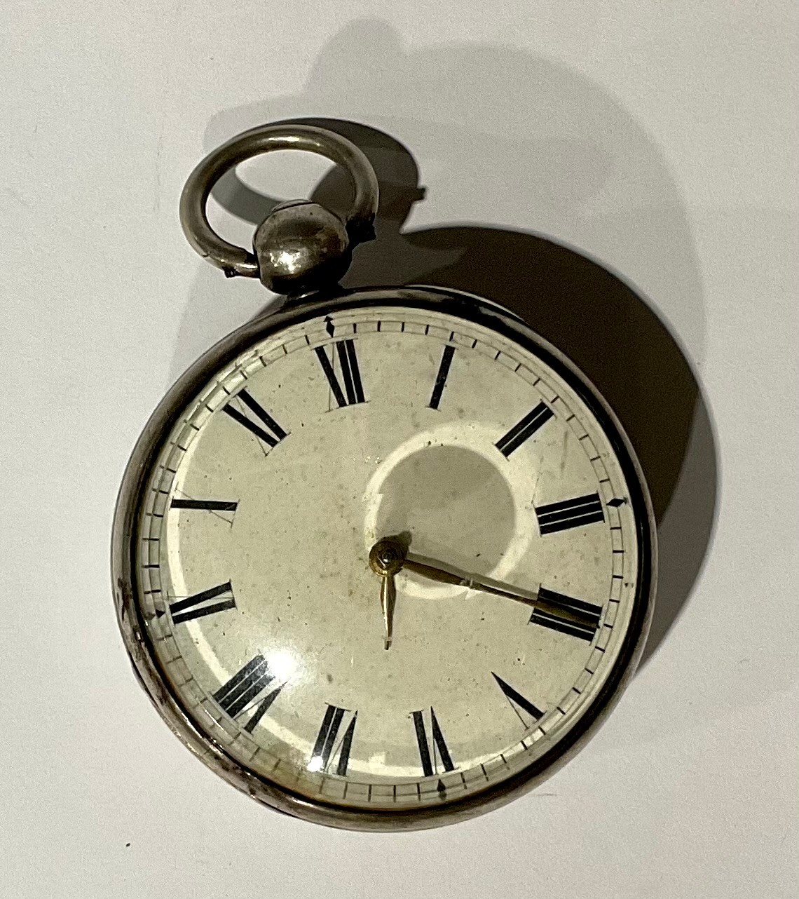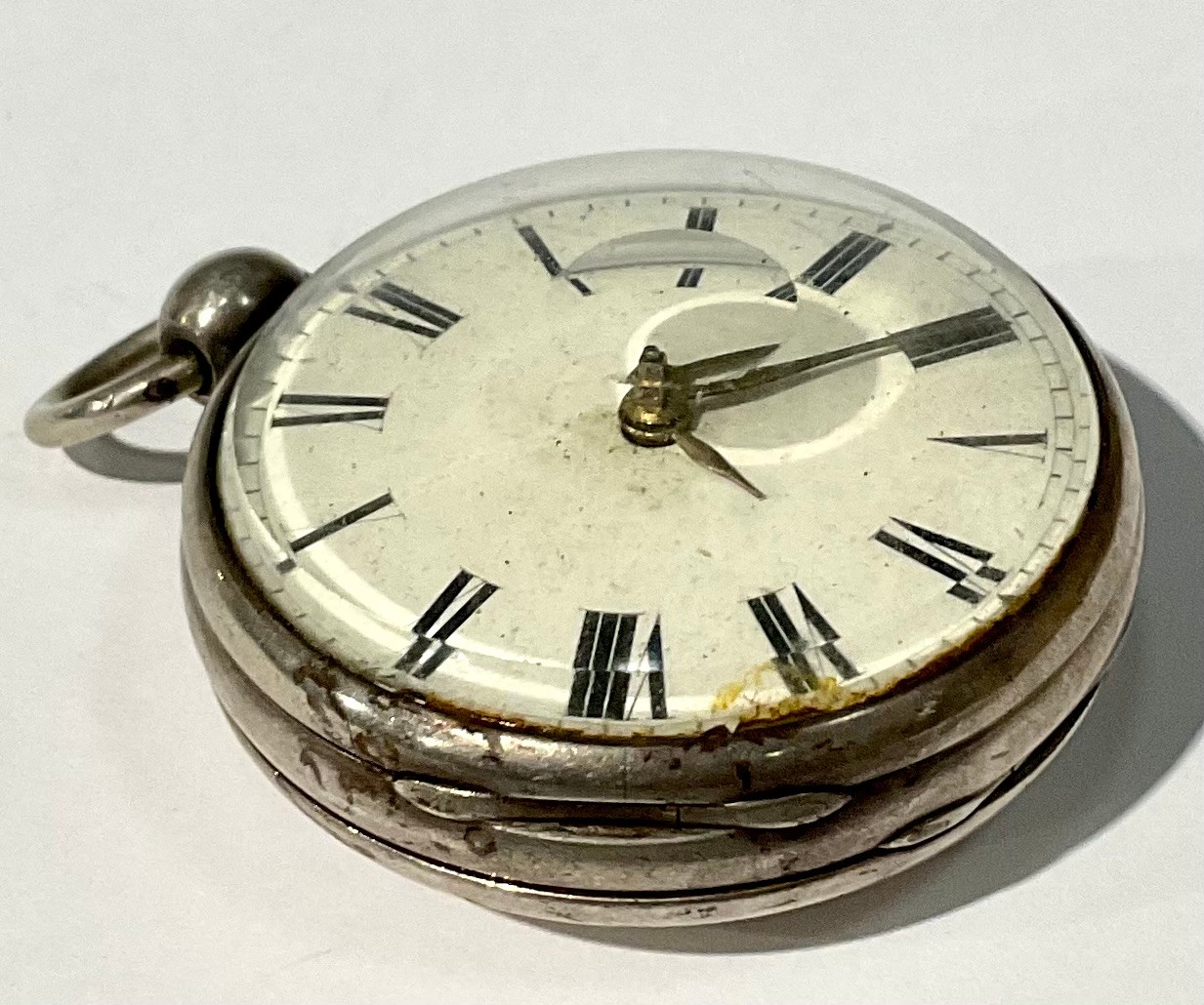 A silver open face pocket watch, verge movement, Roman numerals on white dial, J. Cohen Hastings, 5.5cm diameter over case, London 1824