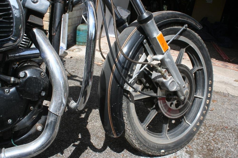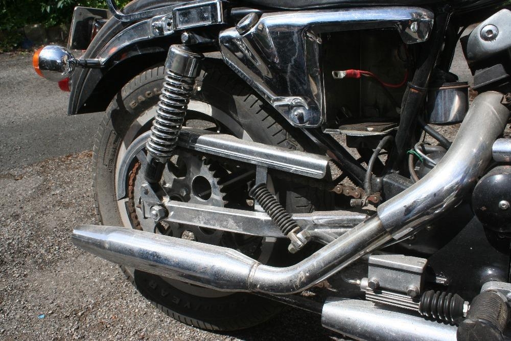 This example was purchased by our vendor in 1998 whilst he was living in South Africa and was used by his wife for touring the country. It was bought from the nephew of the first owner where it had been stored in a barn for over 13 years and never used. On its maiden run bearings on the push rods seized and the connecting rod broke and pierced the sump casing. It was completely stripped down to bare nuts and bolts. He purchased it as it was, the casing was professionally welded up x-rayed and, the bike was completely overhauled and checked out. It has the original Goodyear Eagle tyres.