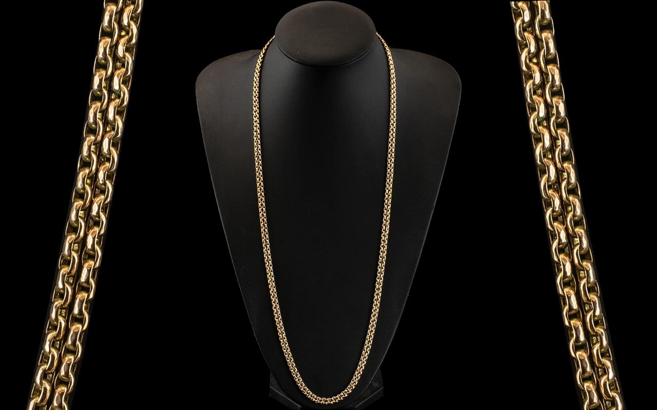 Antique Period - Superb Quality 9ct Gold Muff - Guard Chain. Marked 9ct. Wonderful Warm Colour and Condition In All Aspects. 30.6 grams. Length 60 Inches - 150 cm.