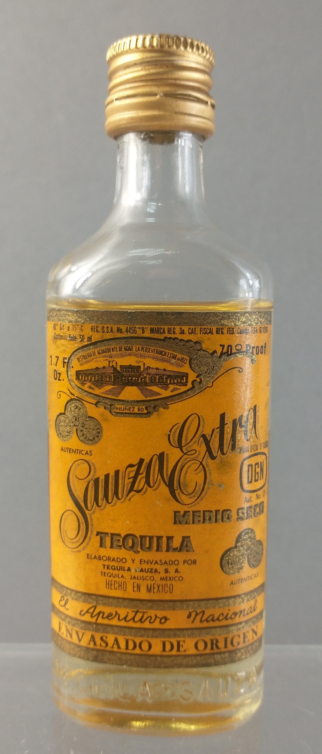 A miniature 1.7fl. oz. 70 proof SAUZA EXTRA TEQUILA imported by R & C Vintners Carrow, Norwich
