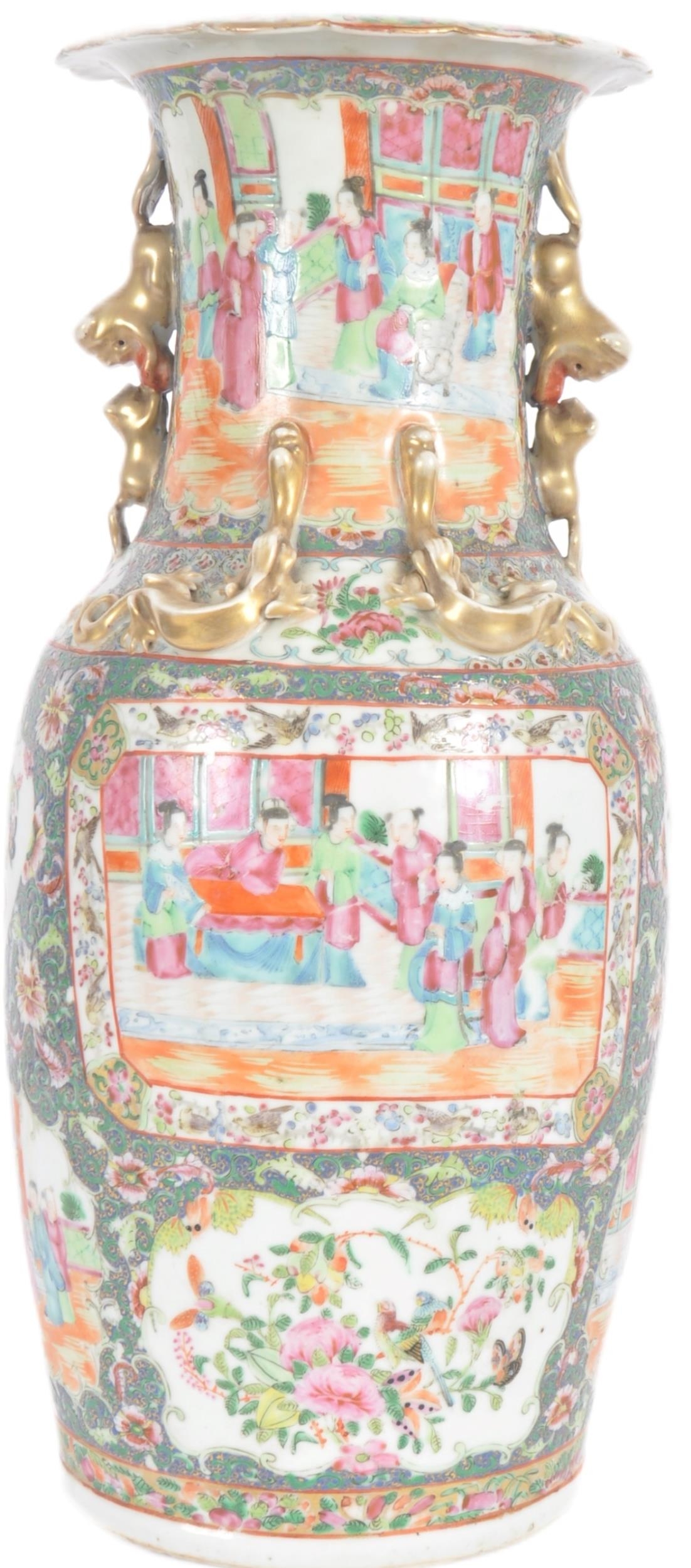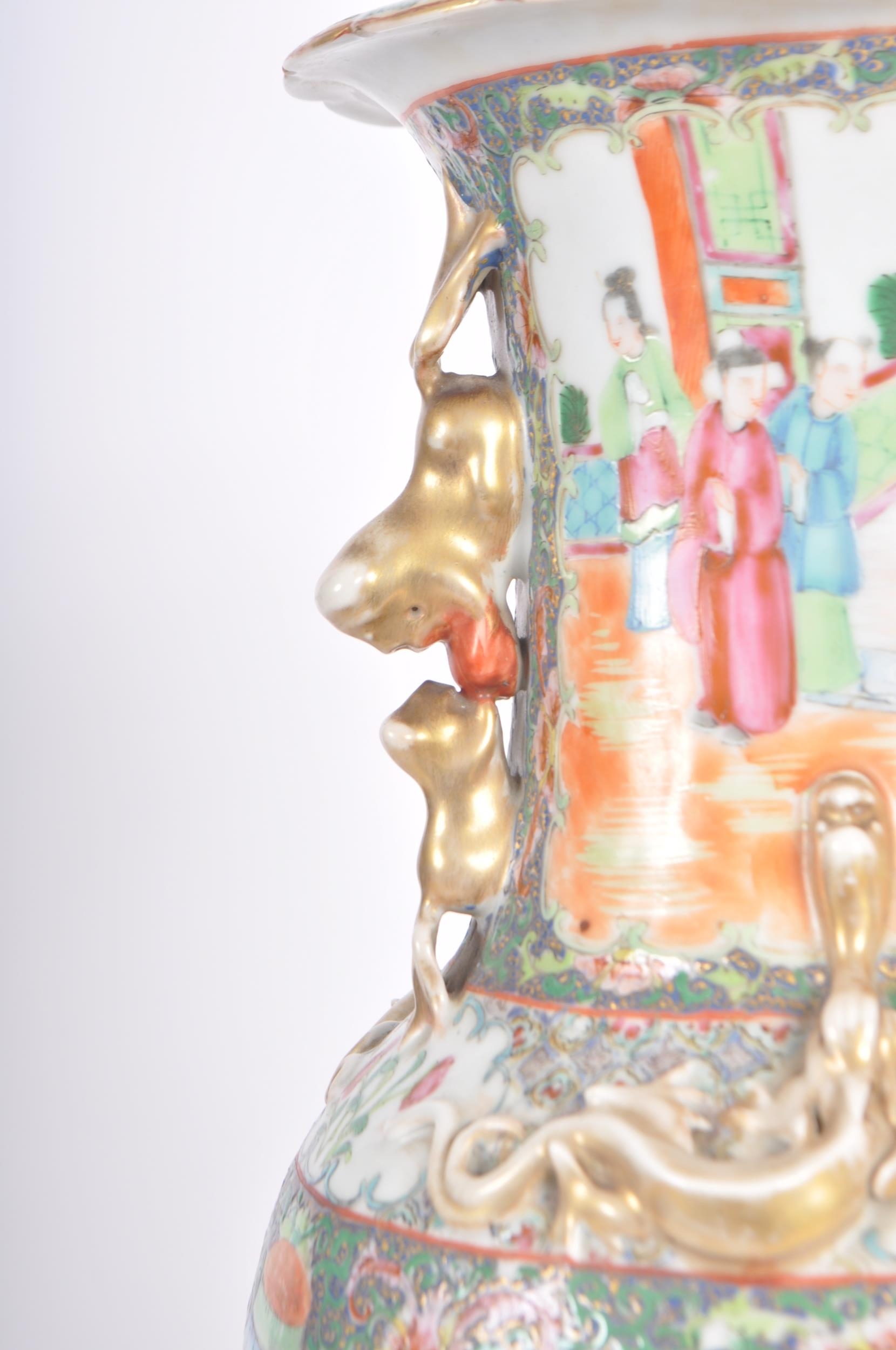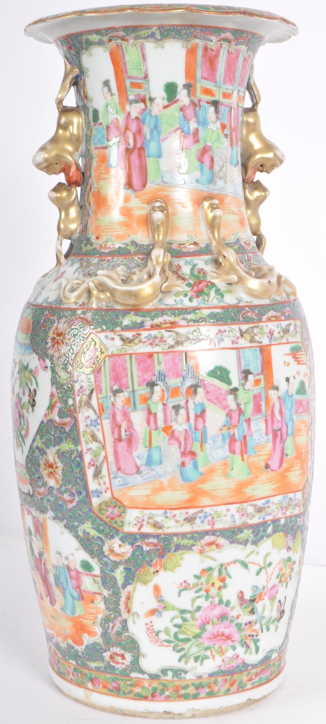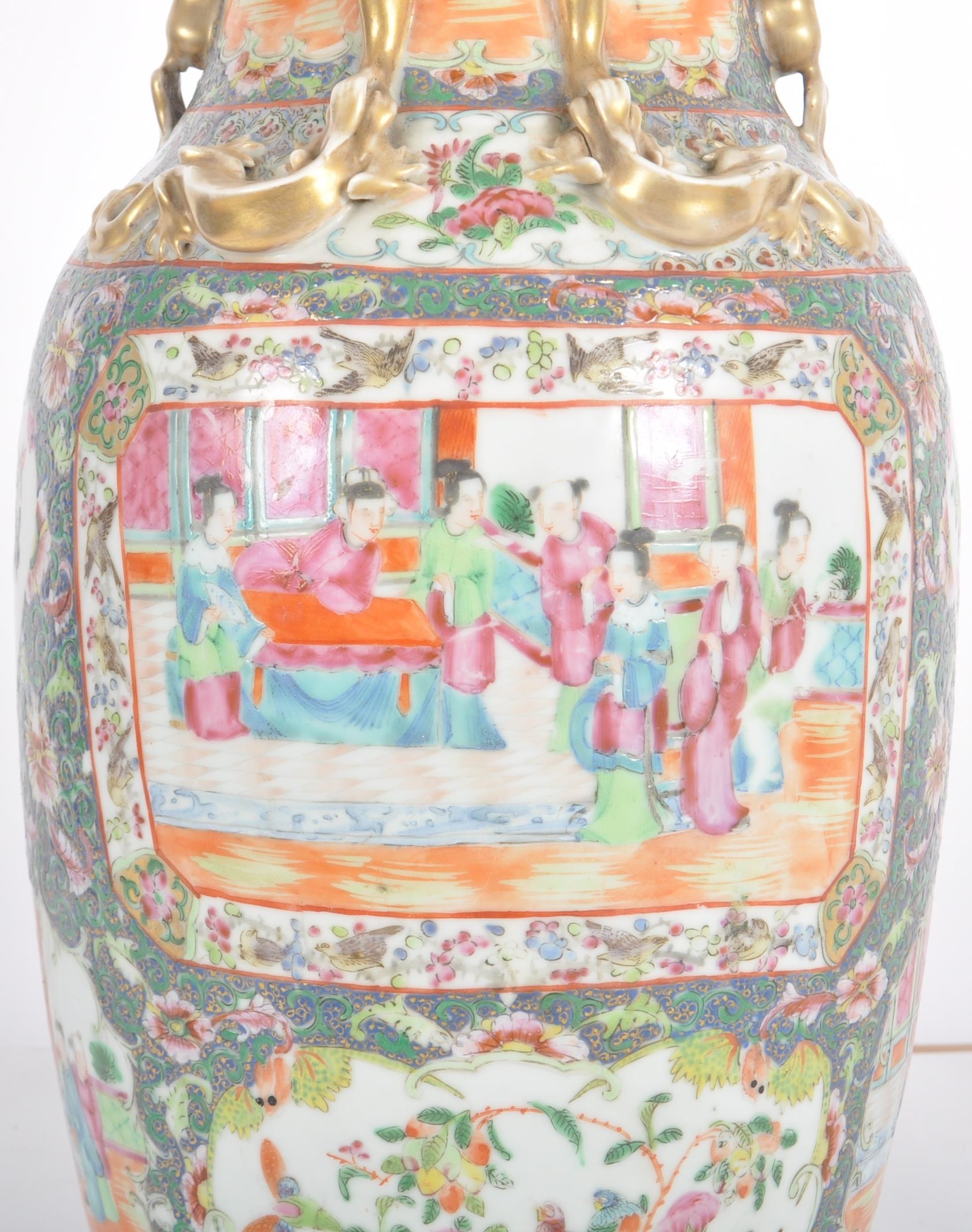 A 19th Century Chinese Famille Rose porcelain vase of large size. Hand painted decoration depicting scenes of court & figures within white cartouche panels with intricate decoration throughout set with gilded foo dog handles and kilim lizards. Measures approx; 46cm tall.