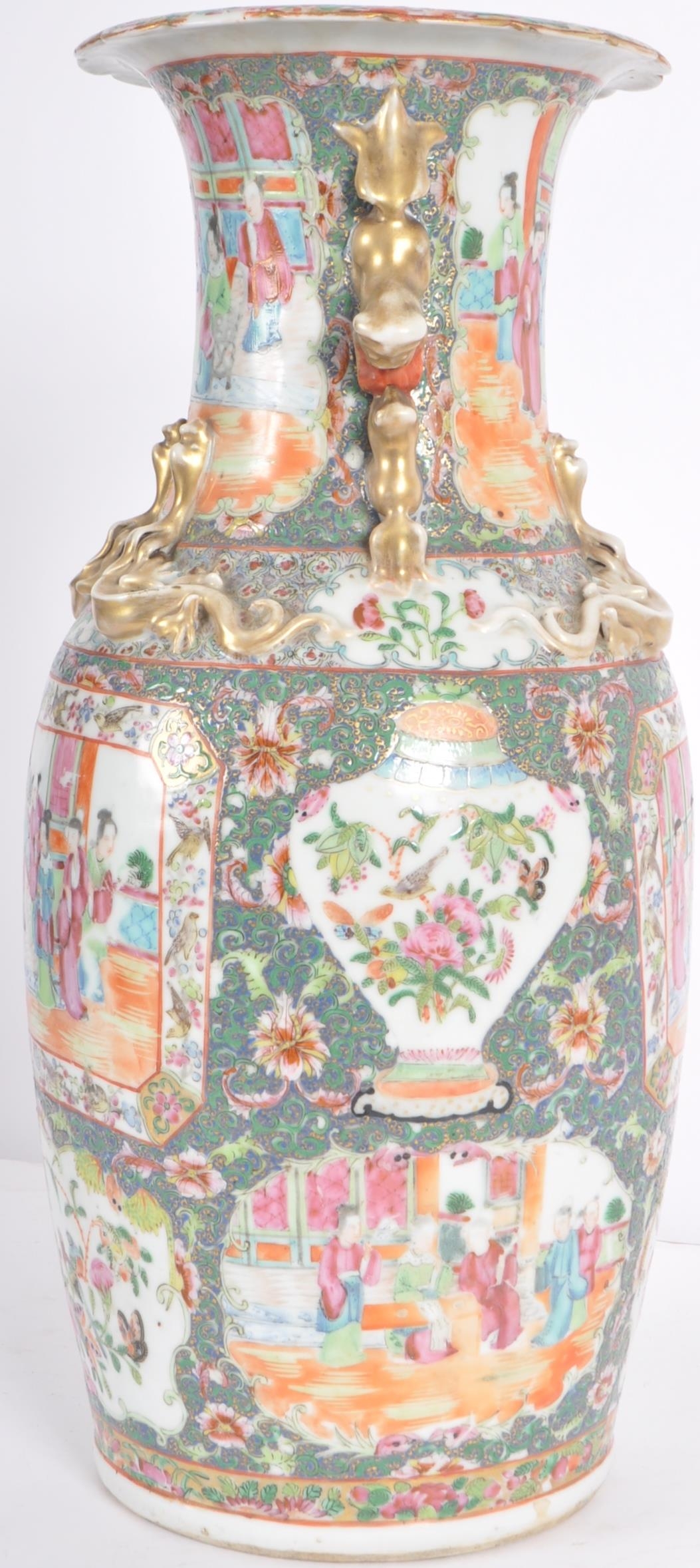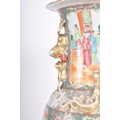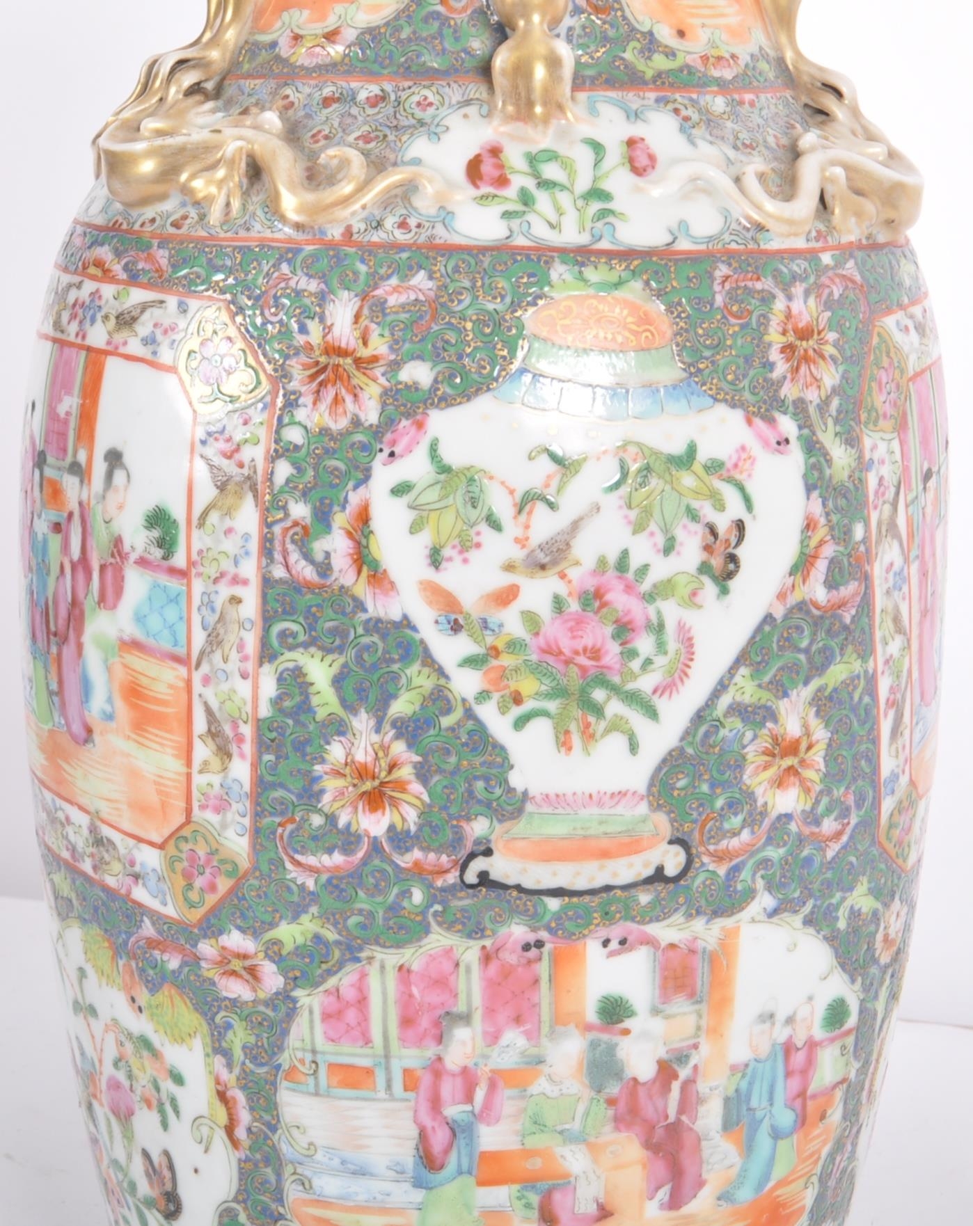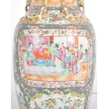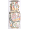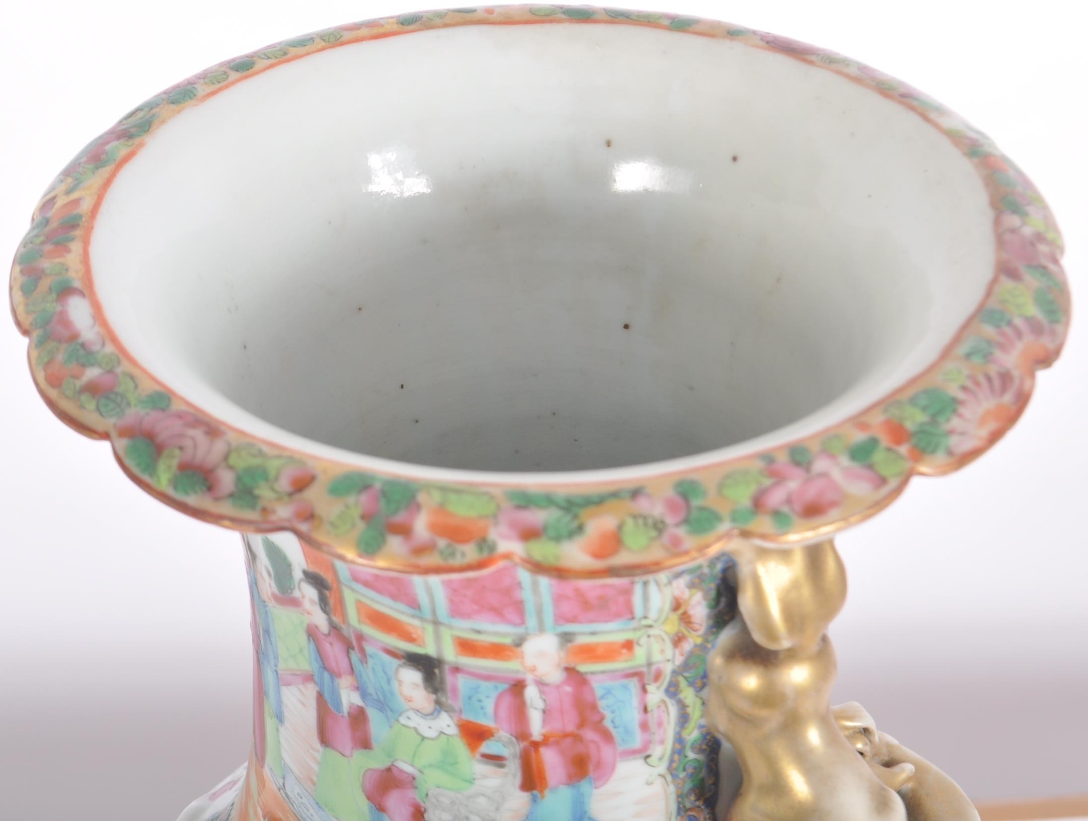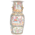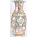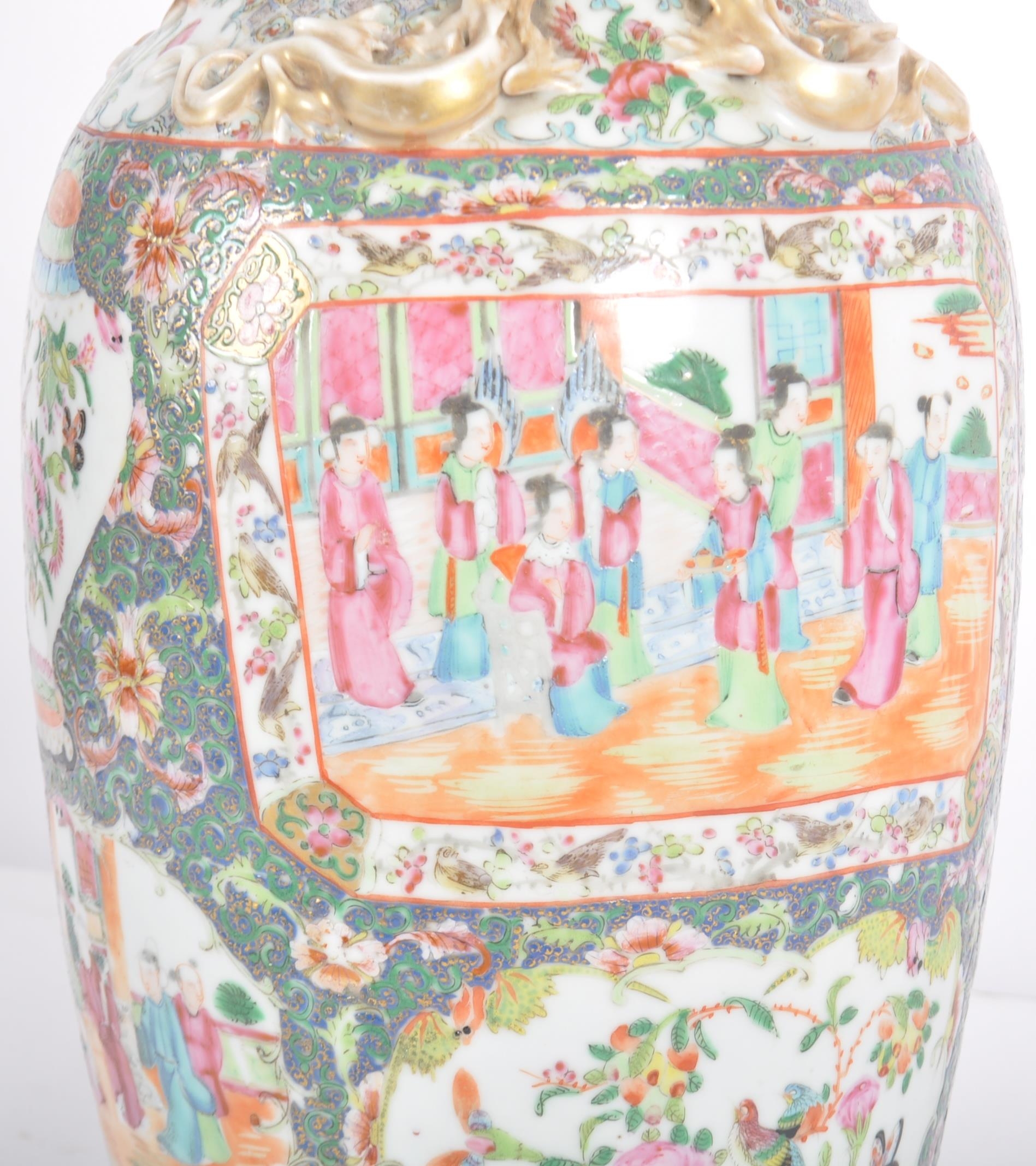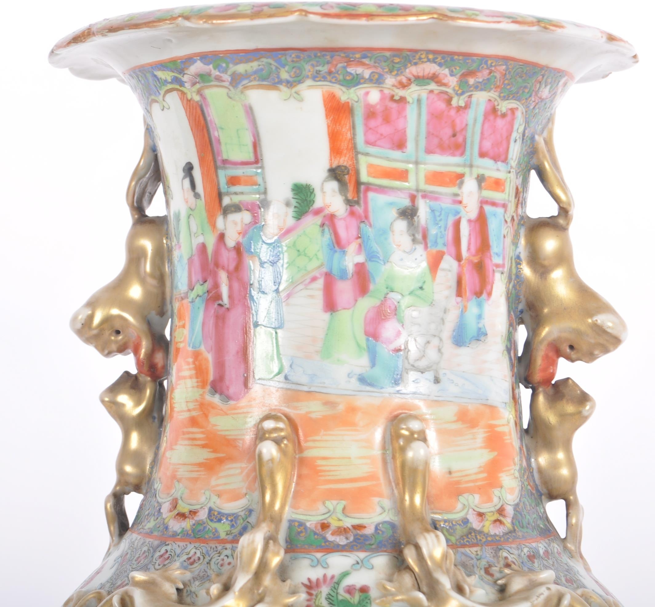A 19th Century Chinese Famille Rose porcelain vase of large size. Hand painted decoration depicting scenes of court & figures within white cartouche panels with intricate decoration throughout set with gilded foo dog handles and kilim lizards. Measures approx; 46cm tall.