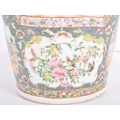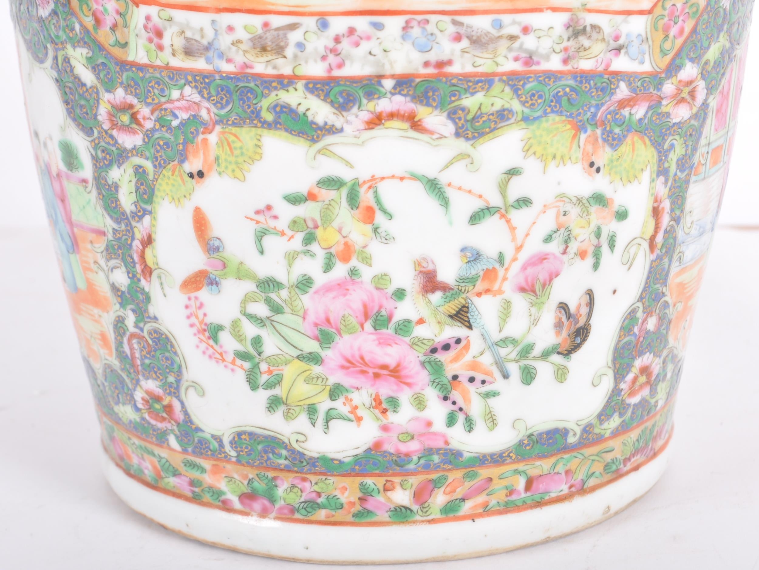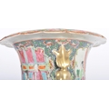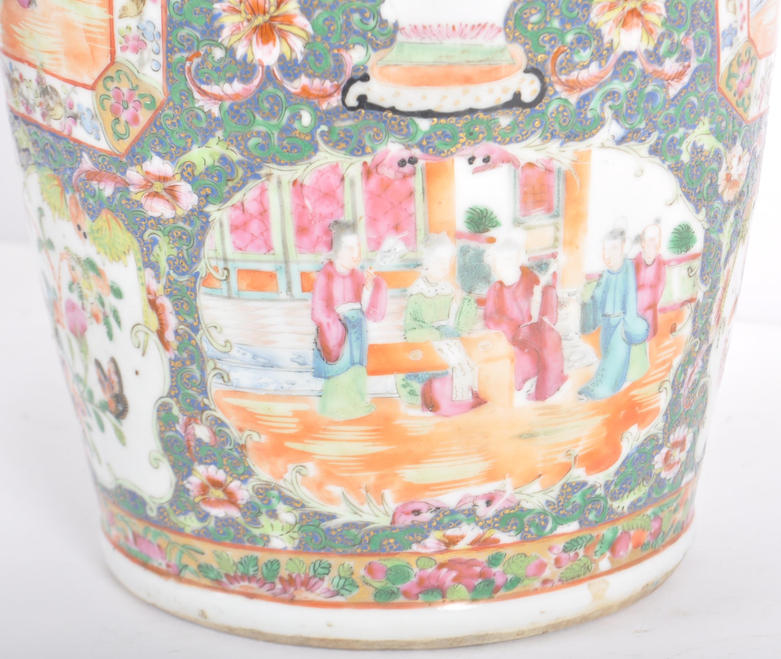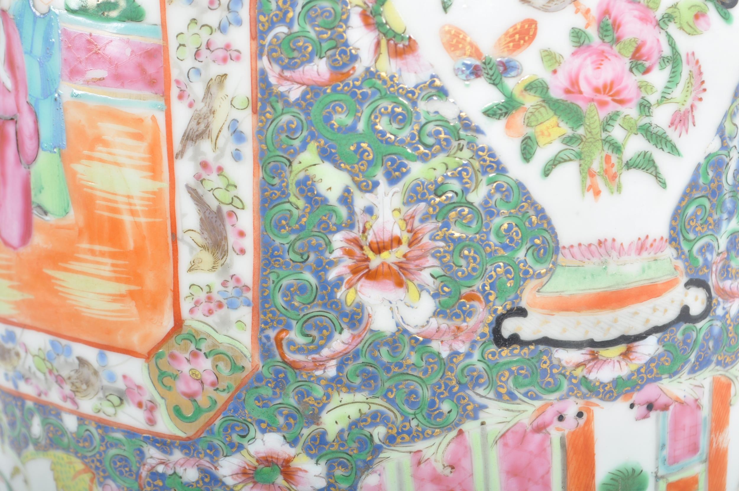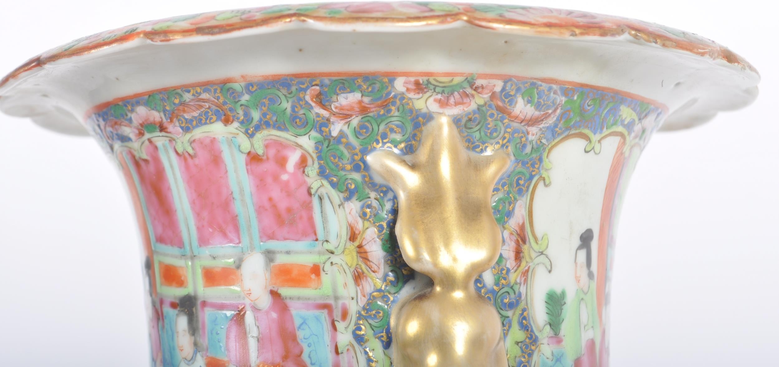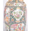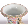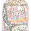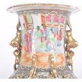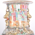 A 19th Century Chinese Famille Rose porcelain vase of large size. Hand painted decoration depicting scenes of court & figures within white cartouche panels with intricate decoration throughout set with gilded foo dog handles and kilim lizards. Measures approx; 46cm tall.