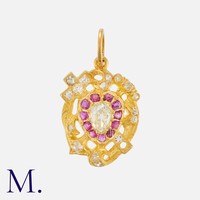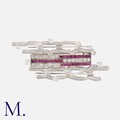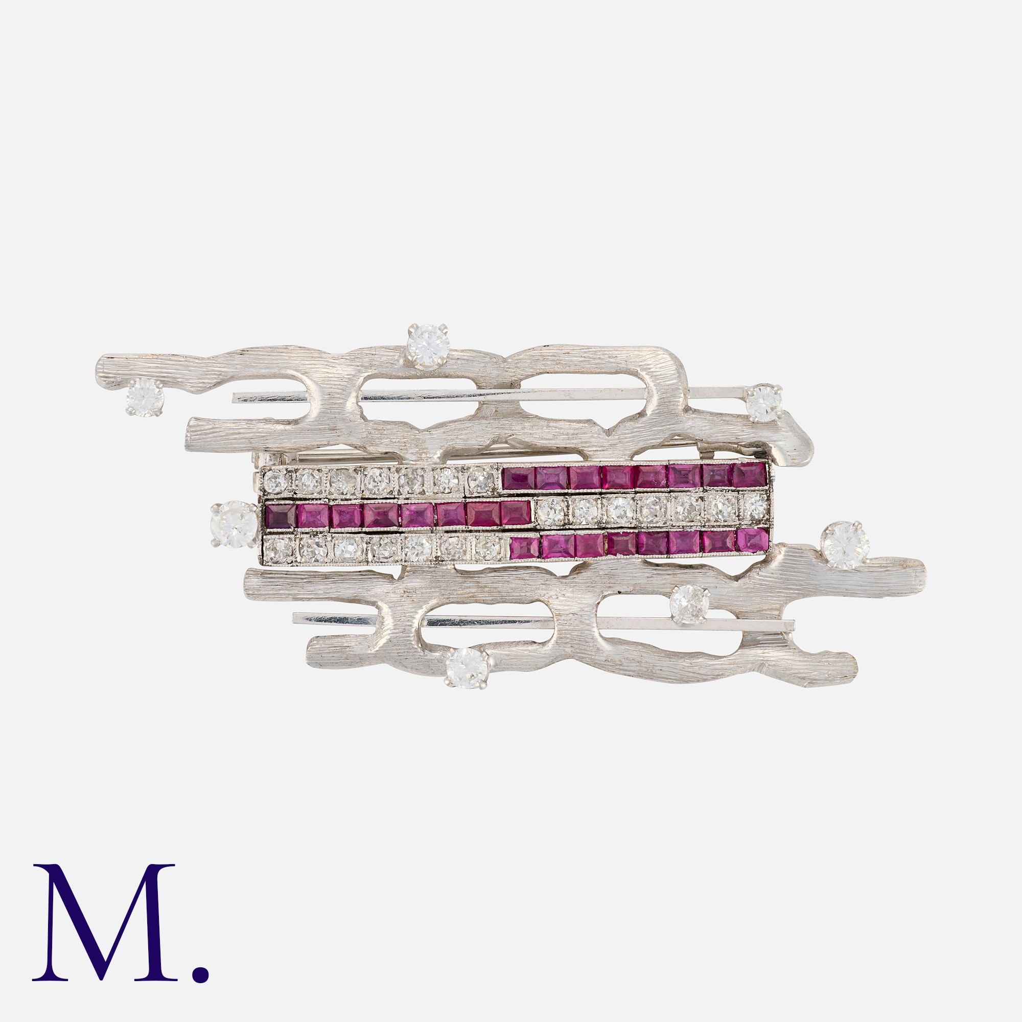 A Modernist Brooch in 14 carat white gold, of abstract design, set with calibre cut rubies and round cut diamonds. Marked 14k.
