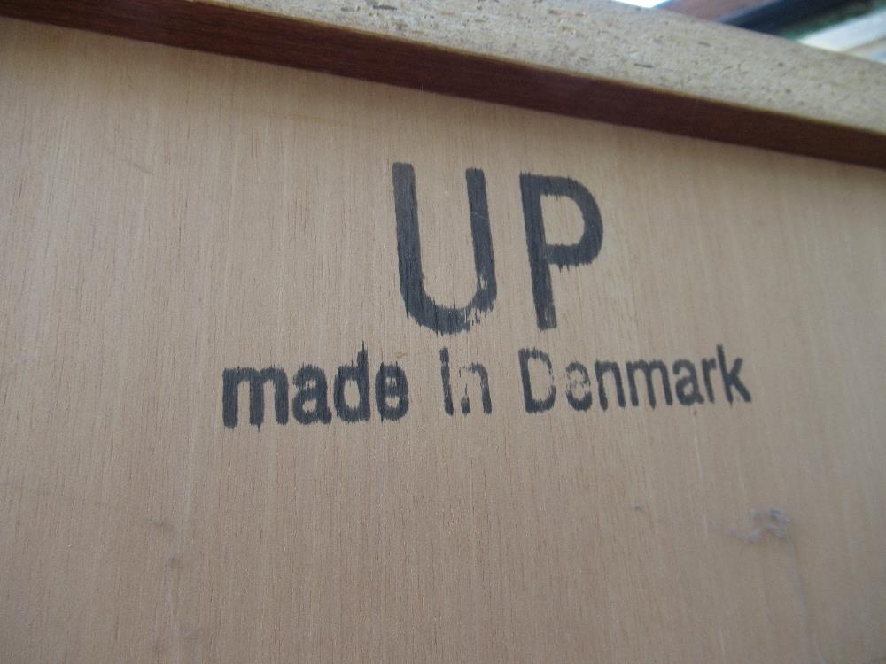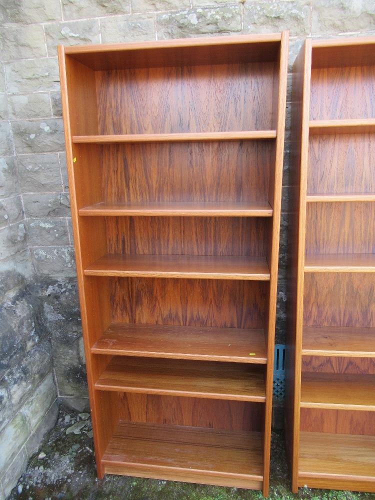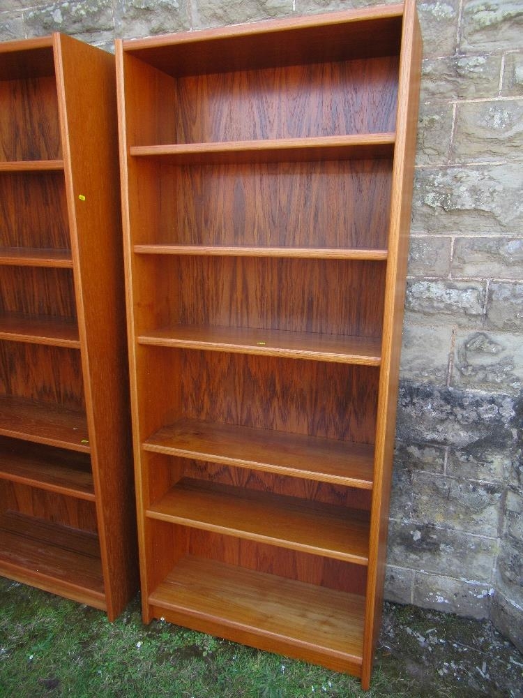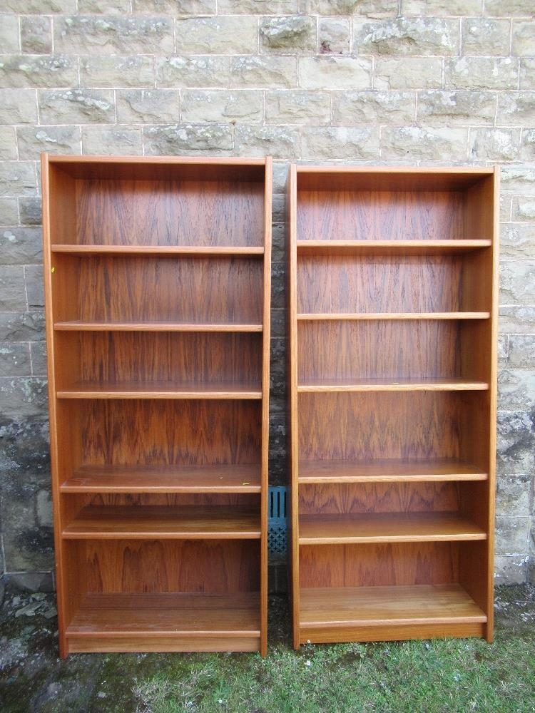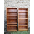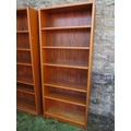 A pair of Danish teak sets of shelves, stamped UP made in Denmark on the back. width 33ins, height 77ins, depth 12.5ins