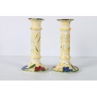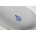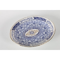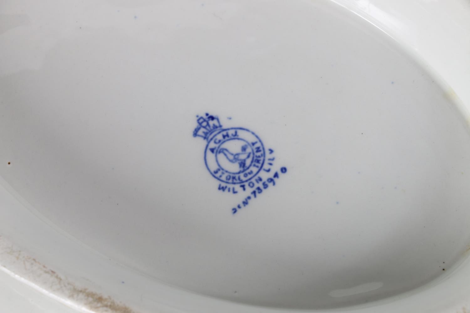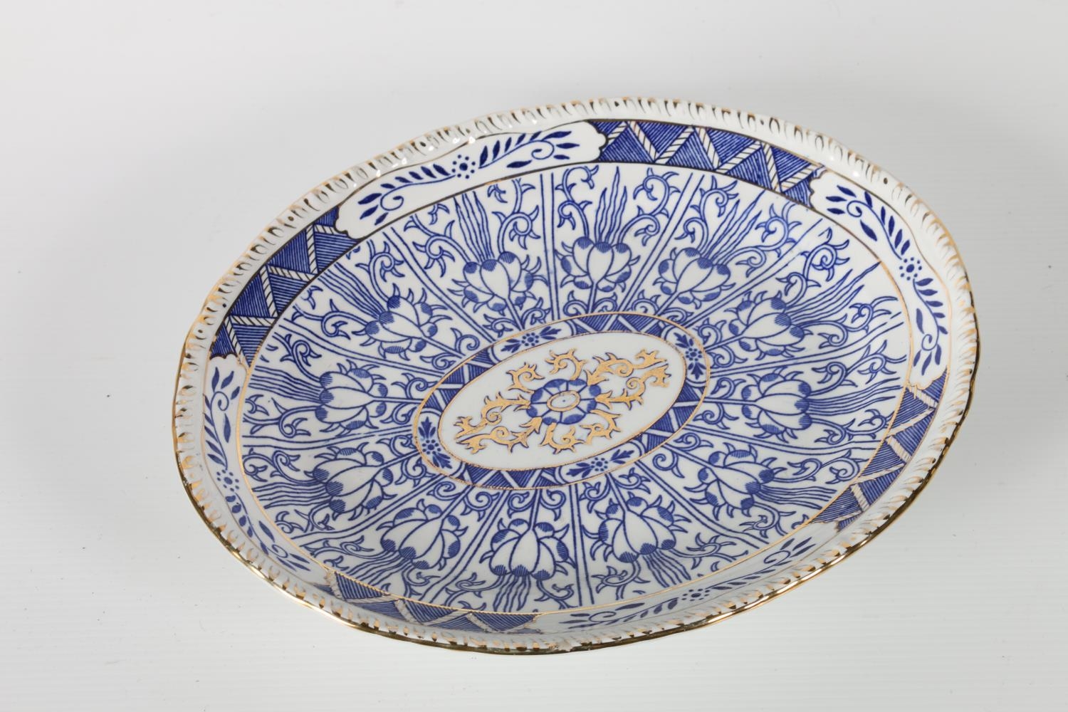 1920's A J Harley Jones Wilton Lily tazza, decorated with blue and gilt Morris inspired pattern on white ground, 28.5cm long x 23cm wide x 5.5cm high.