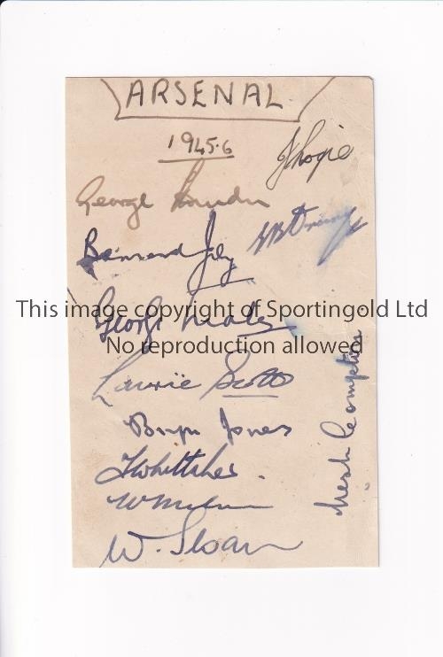 ARSENAL / AUTOGRAPHS 1945/6 Album page signed by 11 players, Swindon, Joy, Male, Scott, Jones, Whittaker, Milne, Sloan, Leslie Compton, Logie and Drury. Generally good