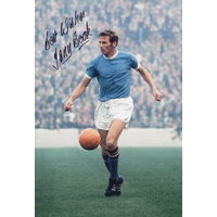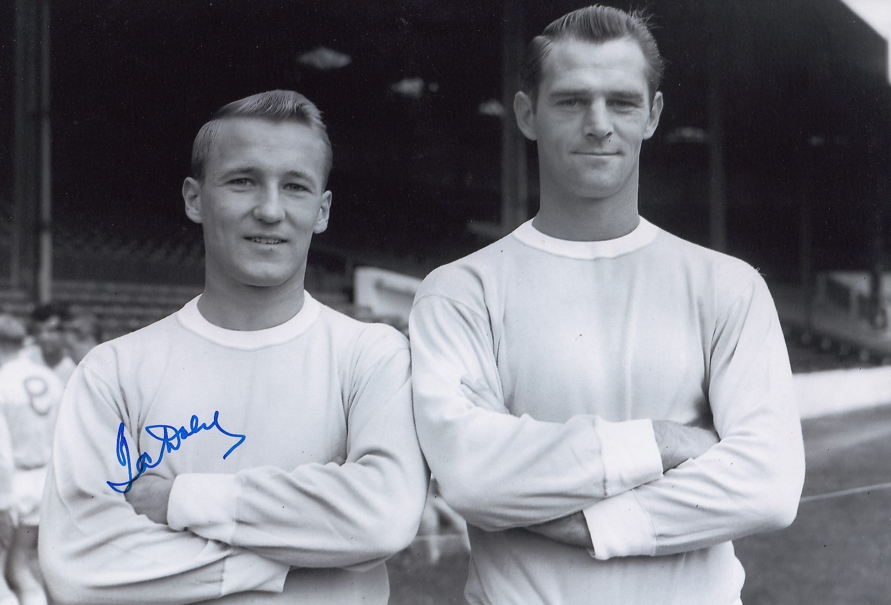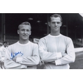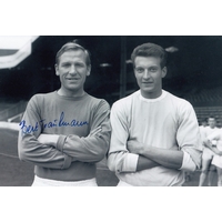 Autographed PETER DOBING 12 x 8 Photograph: Manchester City's PETER DOBING and Bill Leivers pose for photographers' shoulder to shoulder during a photo-shoot at Maine Road prior to the 1962/63 season, signed (by Dobing only) in blue marker.