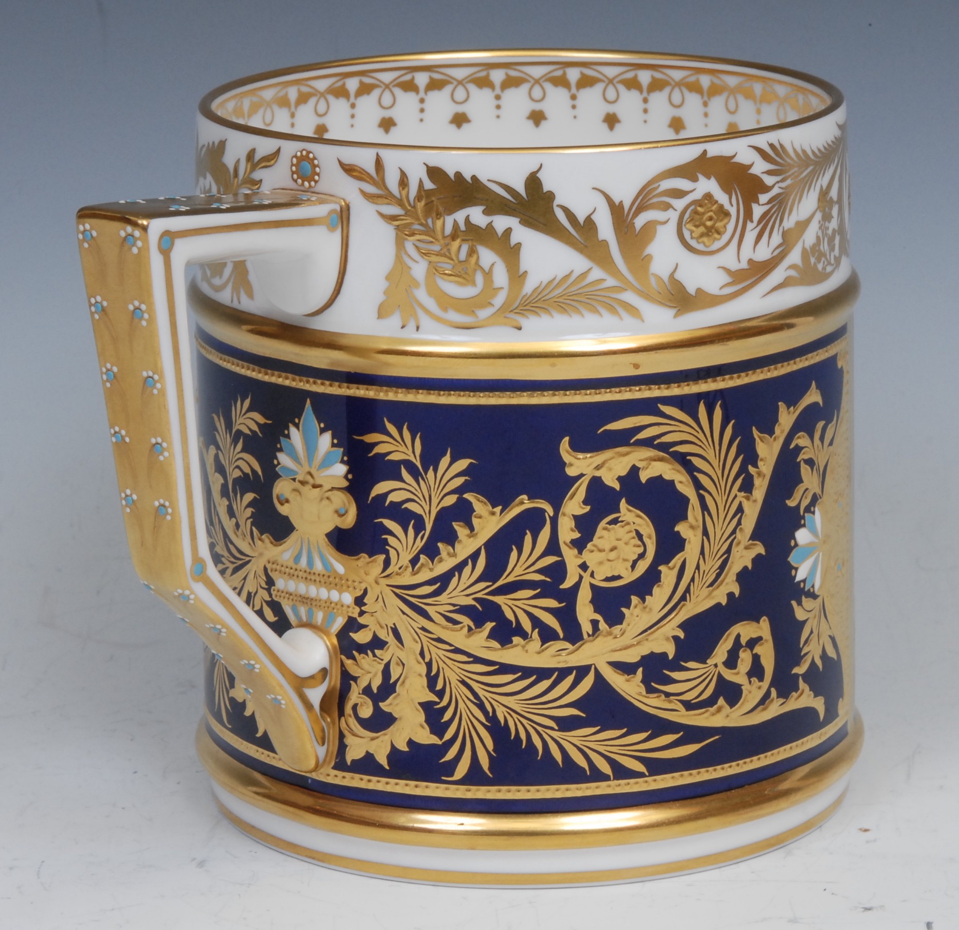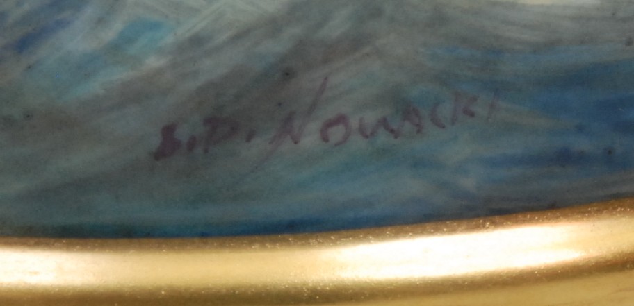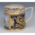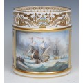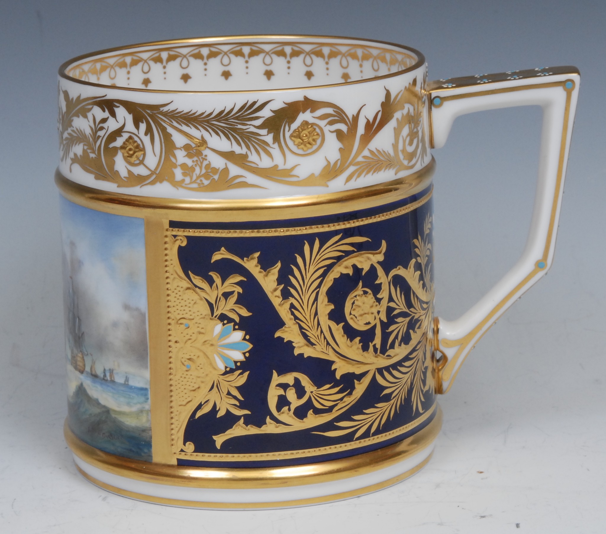 A Lynton porter mug, painted by Stefan Nowacki, signed, with a seascape, tall ships on choppy waters, 12cm, gilt printed mark